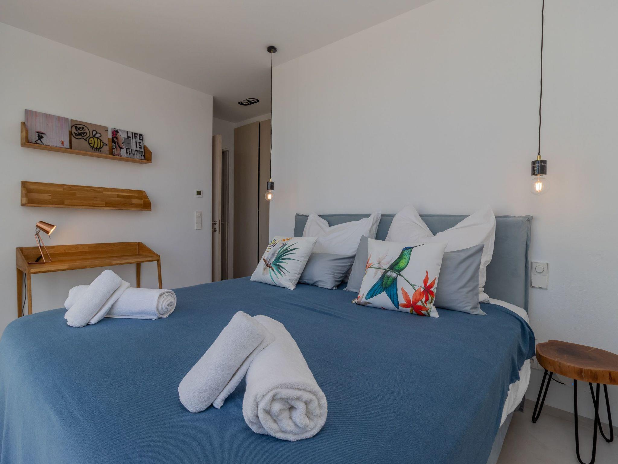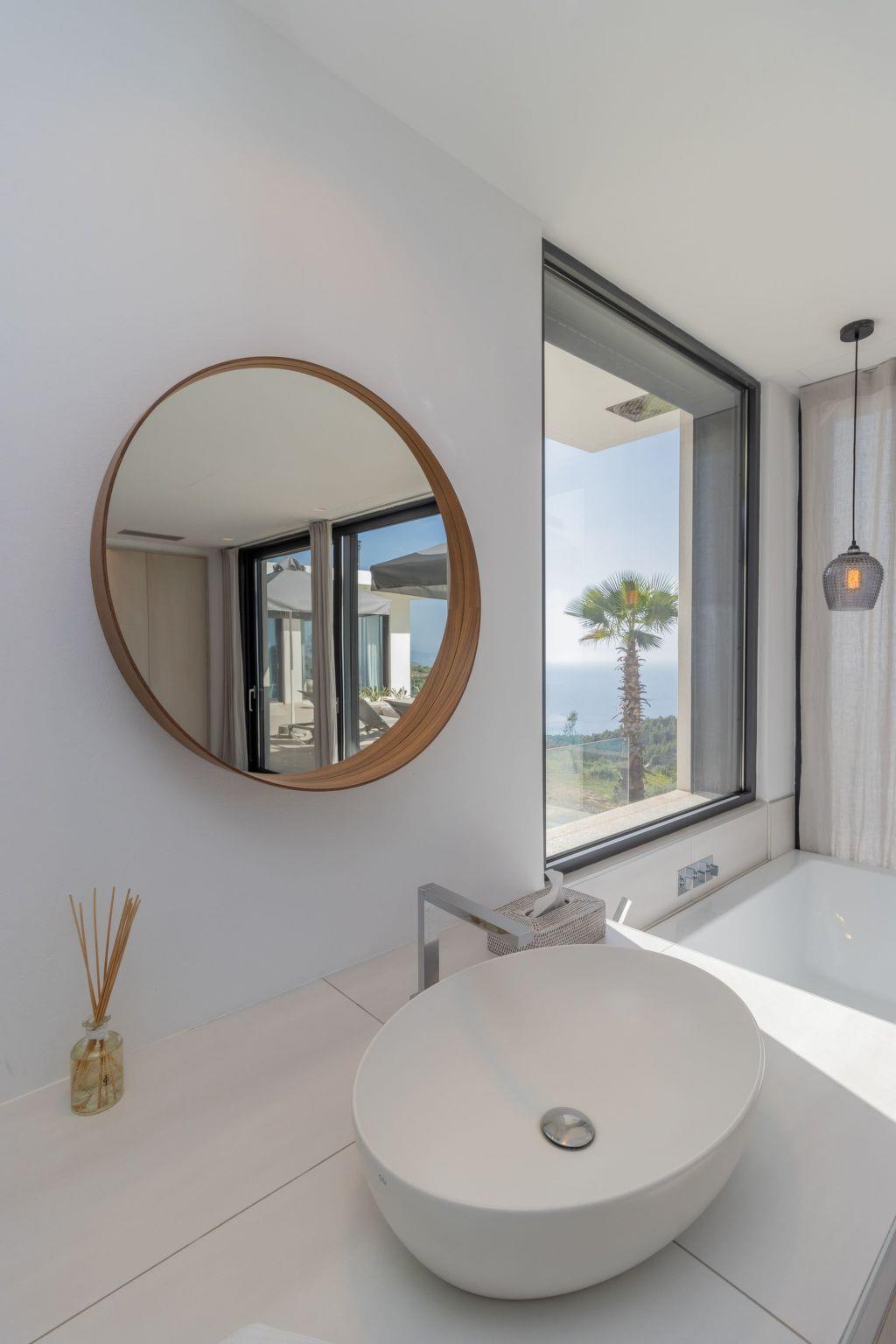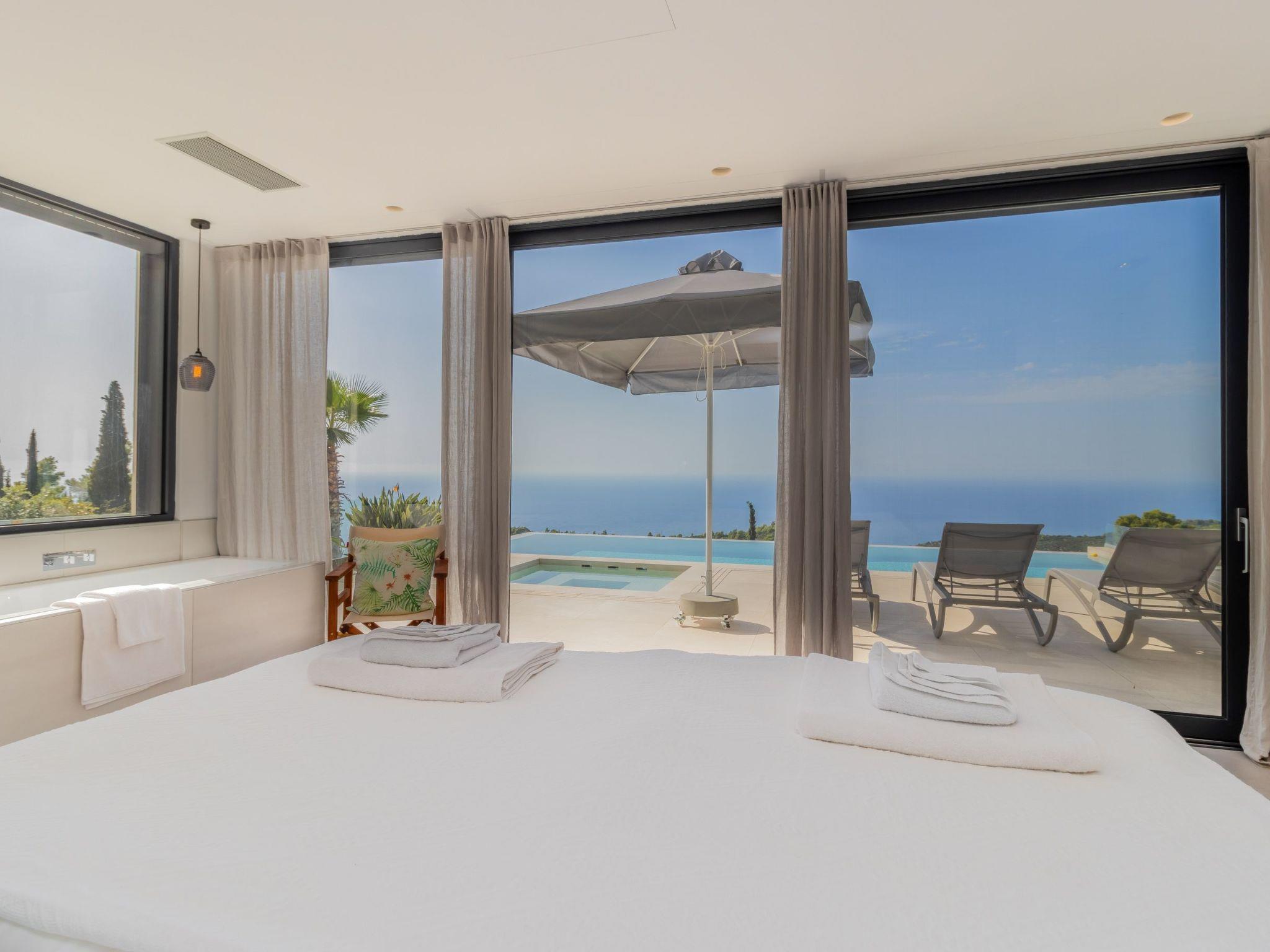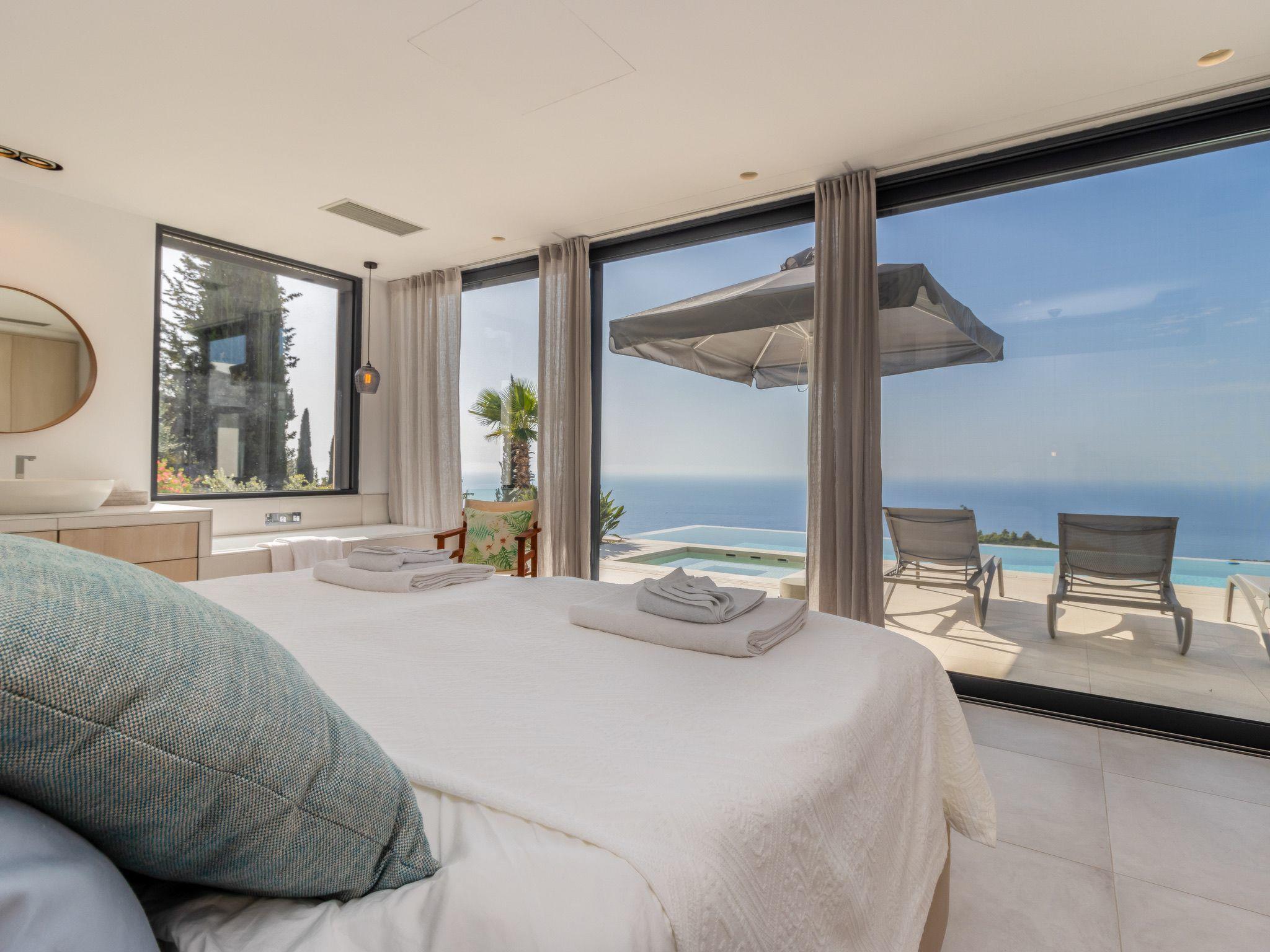 - Master bedroom with king-size box-spring bed, en-suite shower, washbasin and bathtub overlooking the infinity pool and the open sea