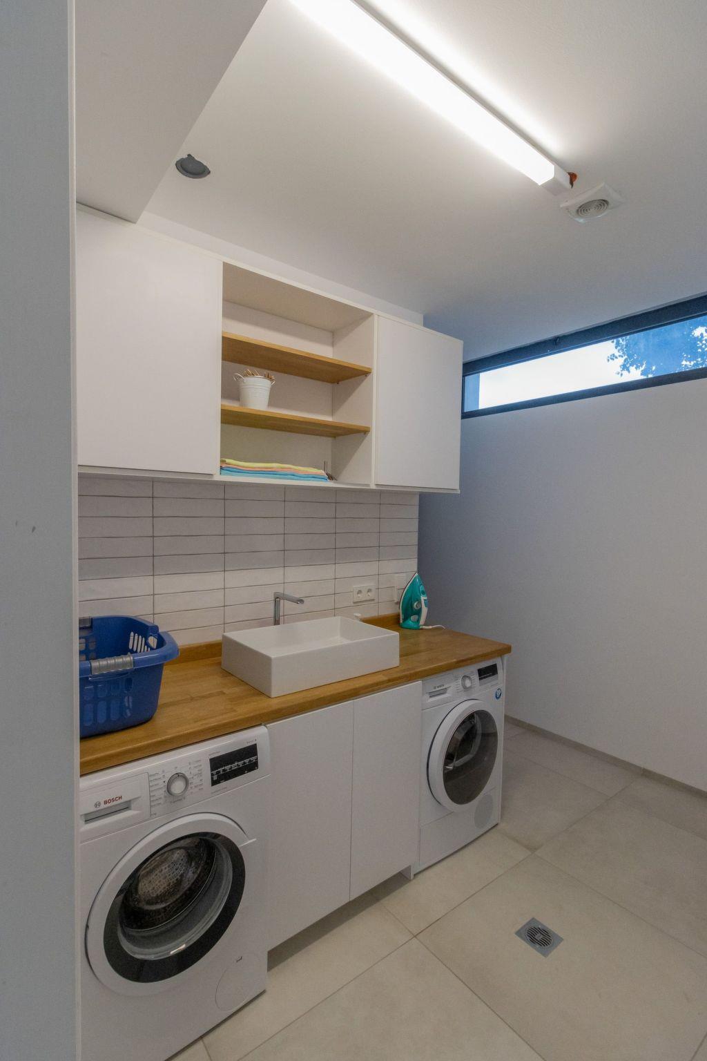 - Laundry room with washing machine, tumble dryer, iron, ironing board and storage area
