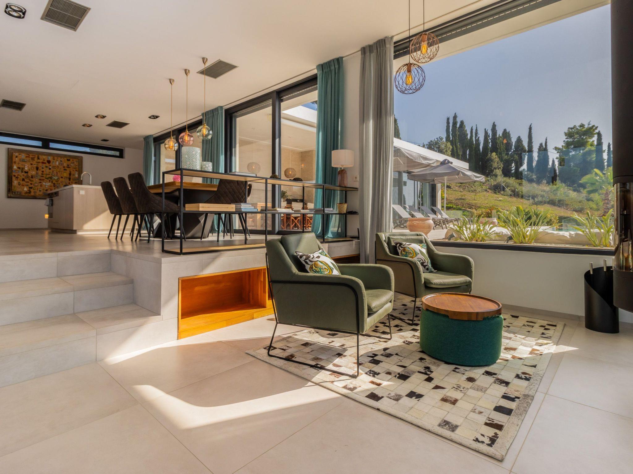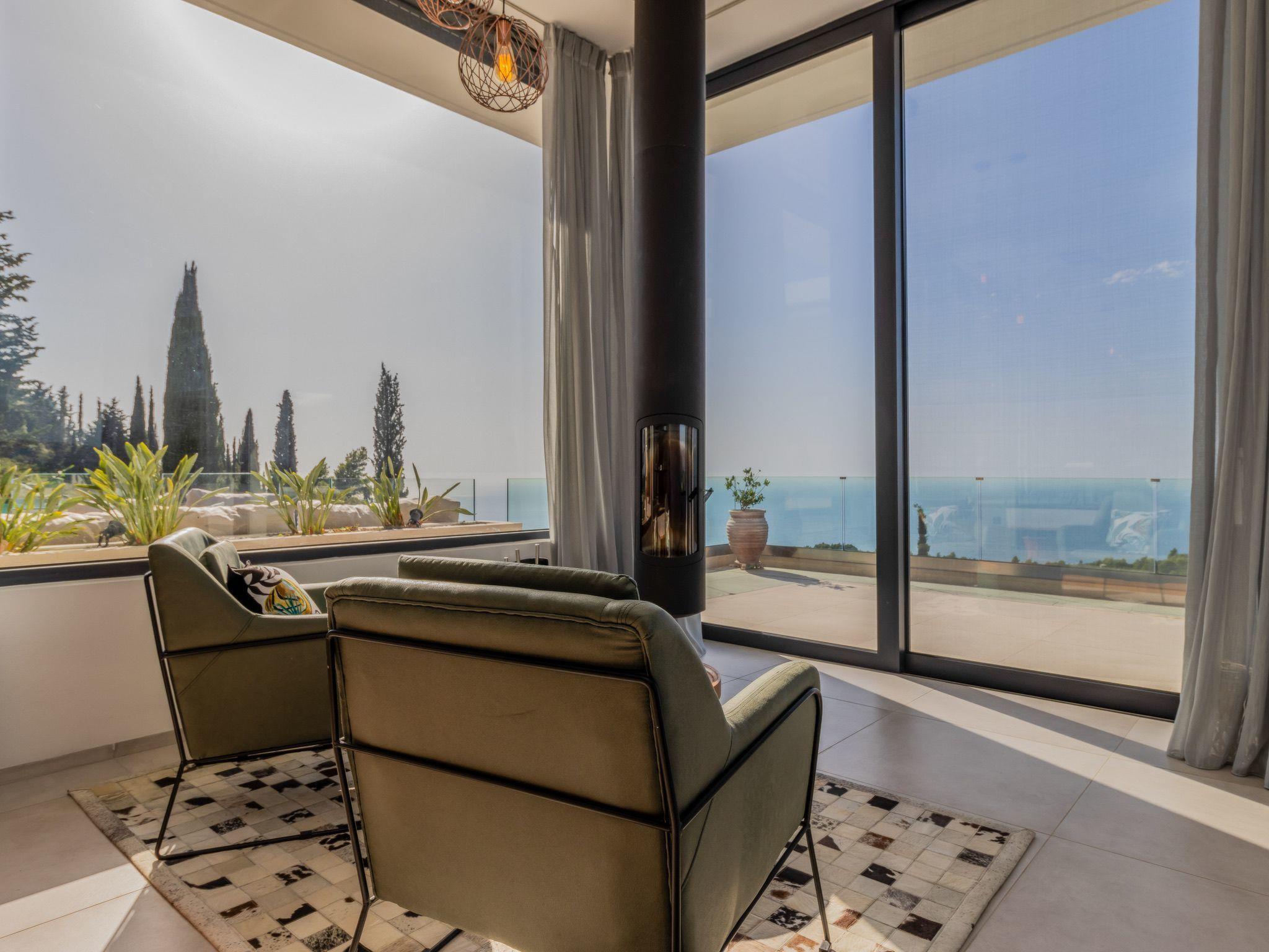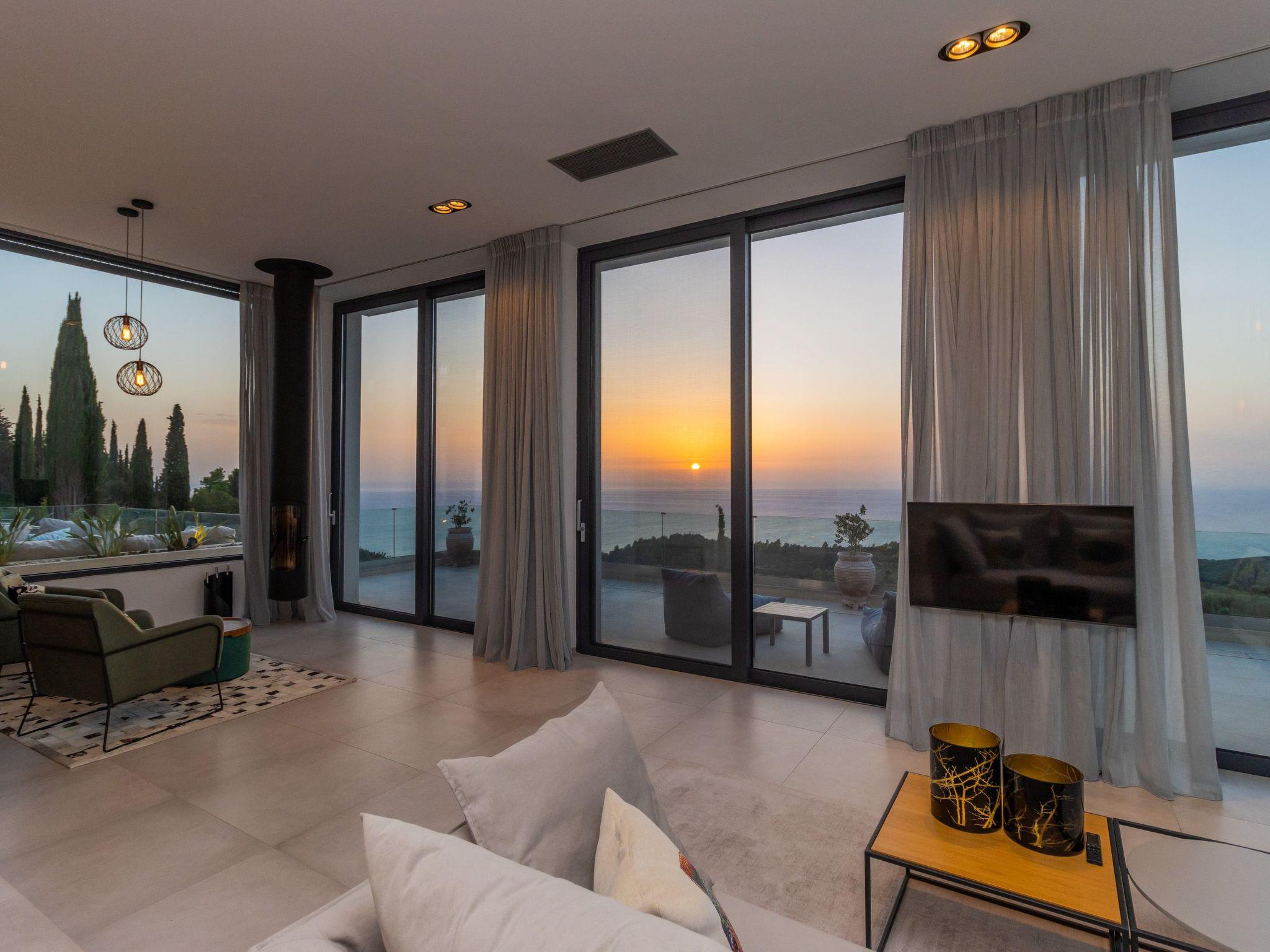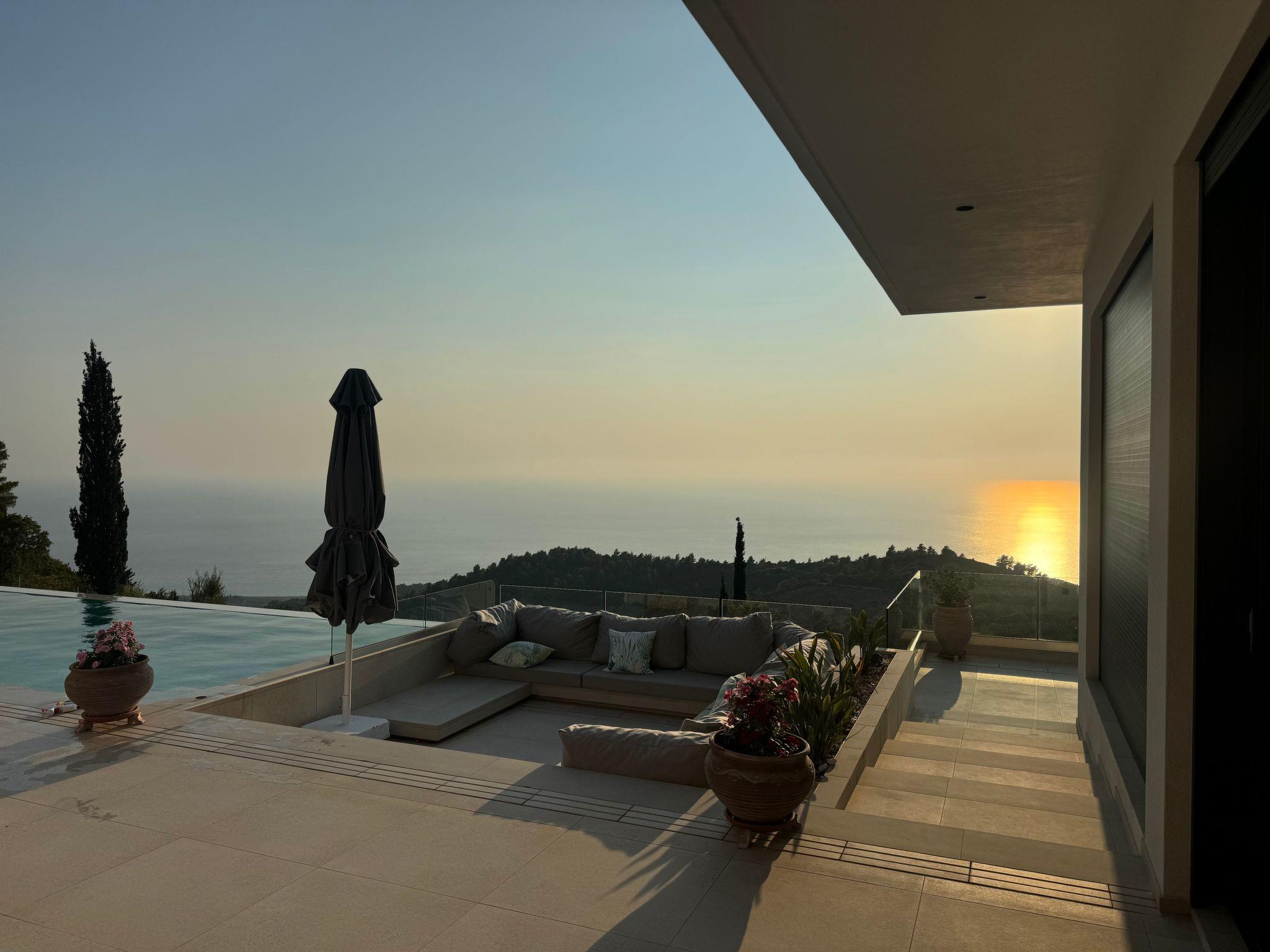 Villa Horizon is a modern villa with large glass fronts that maximise the view of the Ionian Sea. On clear days you can see as far as the island of Zakynthos. The design is modern but cosy and emphasises the beautiful nature surrounding the house.