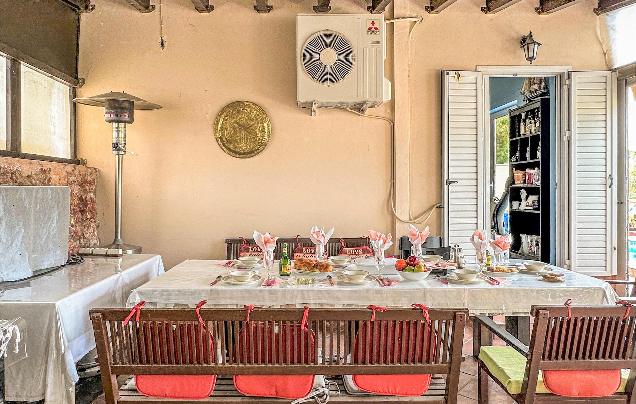 Fra opholdsstuen kan I gå ud på terrassen, hvor I kan solbade og tage en forfriskende dukkert i poolen. Tilbring hyggelige aftener på den overdækkede terrasse med lækre måltider og afslutning af dagen med hyggelige samtaler.