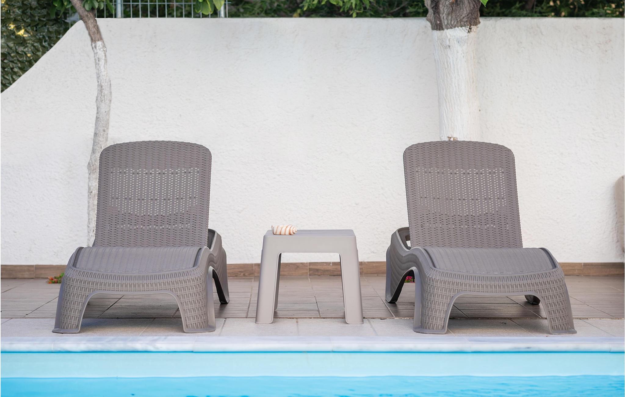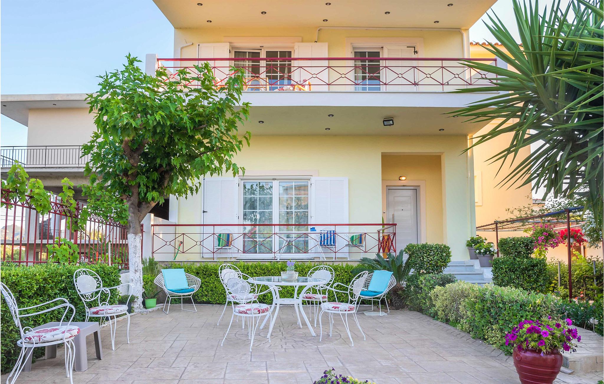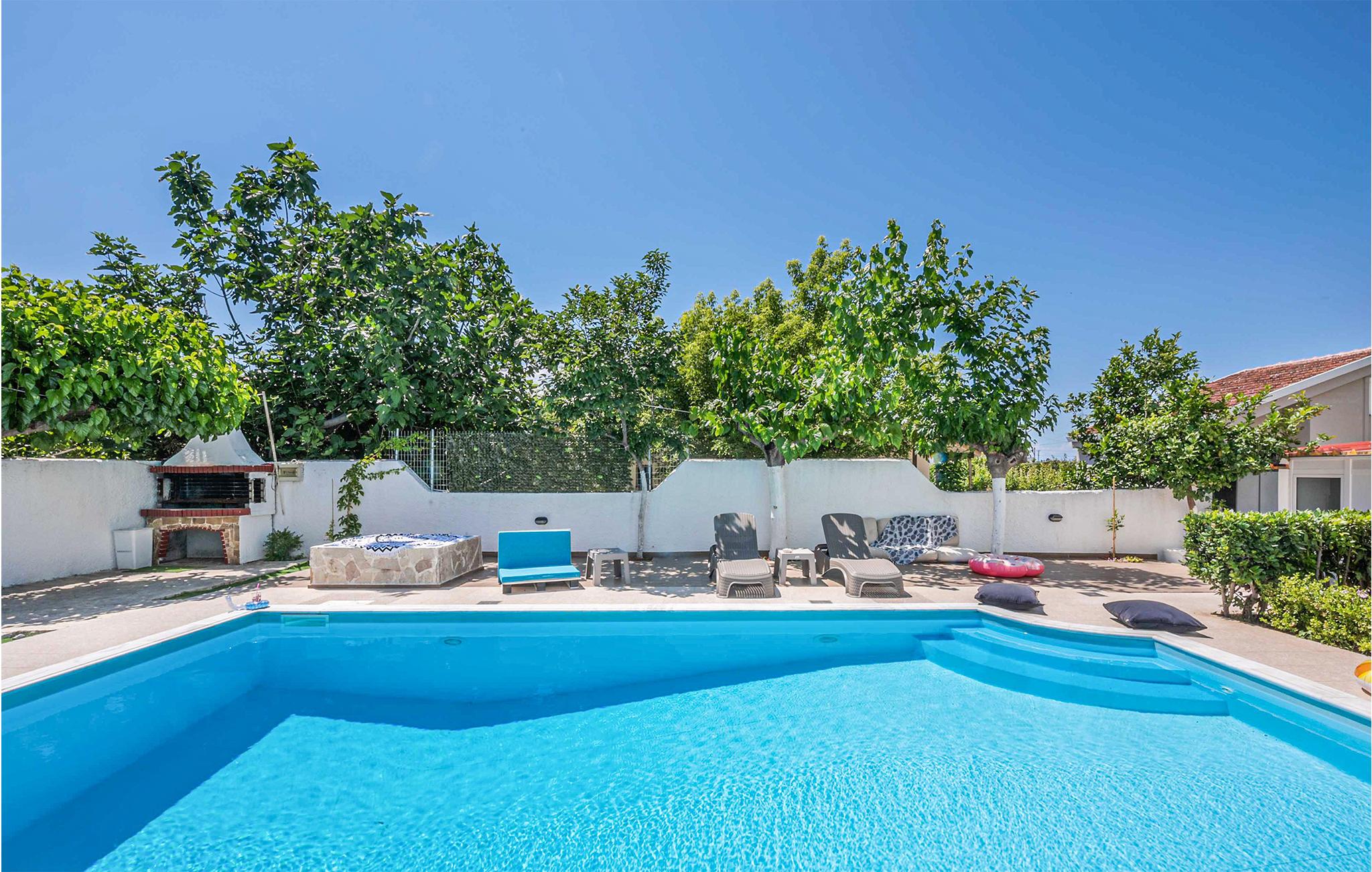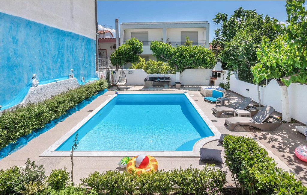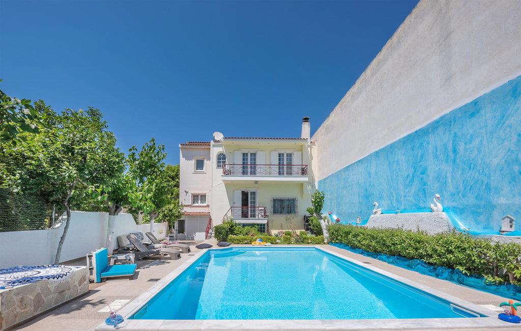 Glæd jer til et varmt indrettet og farverigt feriehus med plads til ni personer. Her kan I slappe af i den velindrettede stue, læne jer tilbage med en god bog eller give jer tid til de dybe samtaler. De yngste gæster vil især blive begejstrede for det fine børneværelse og udendørspoolen. Der er også en grill, så I kan tilberede lækre sommerretter - måske med et græsk tvist. Bagefter kan I sætte jer med retterne på den åbne terrasse og senere med en drink i liggestolen.