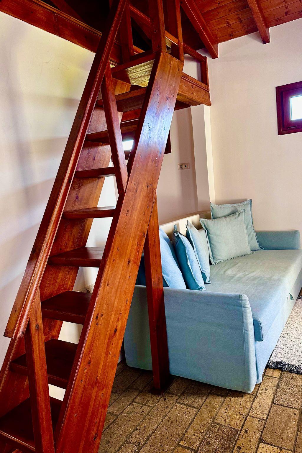 The interior of the Garden View Apartment is meticulously designed to provide a feeling of a true home away from home. It boasts a comfortable double bedroom and a versatile attic space that can accommodate extra guests, making it perfectly suited for both romantic getaways and family vacations. The apartment features an open-plan layout that cleverly integrates a cozy living room with a sofa bed and a fully equipped kitchen. This setup not only allows guests to prepare and savor their favorite meals at their own pace but also ensures every moment of their stay is enveloped in comfort and convenience. Large windows and access to a garden offer views of lush greenery, with glimpses of the sea visible, reminding guests of their proximity to nature's beauty.