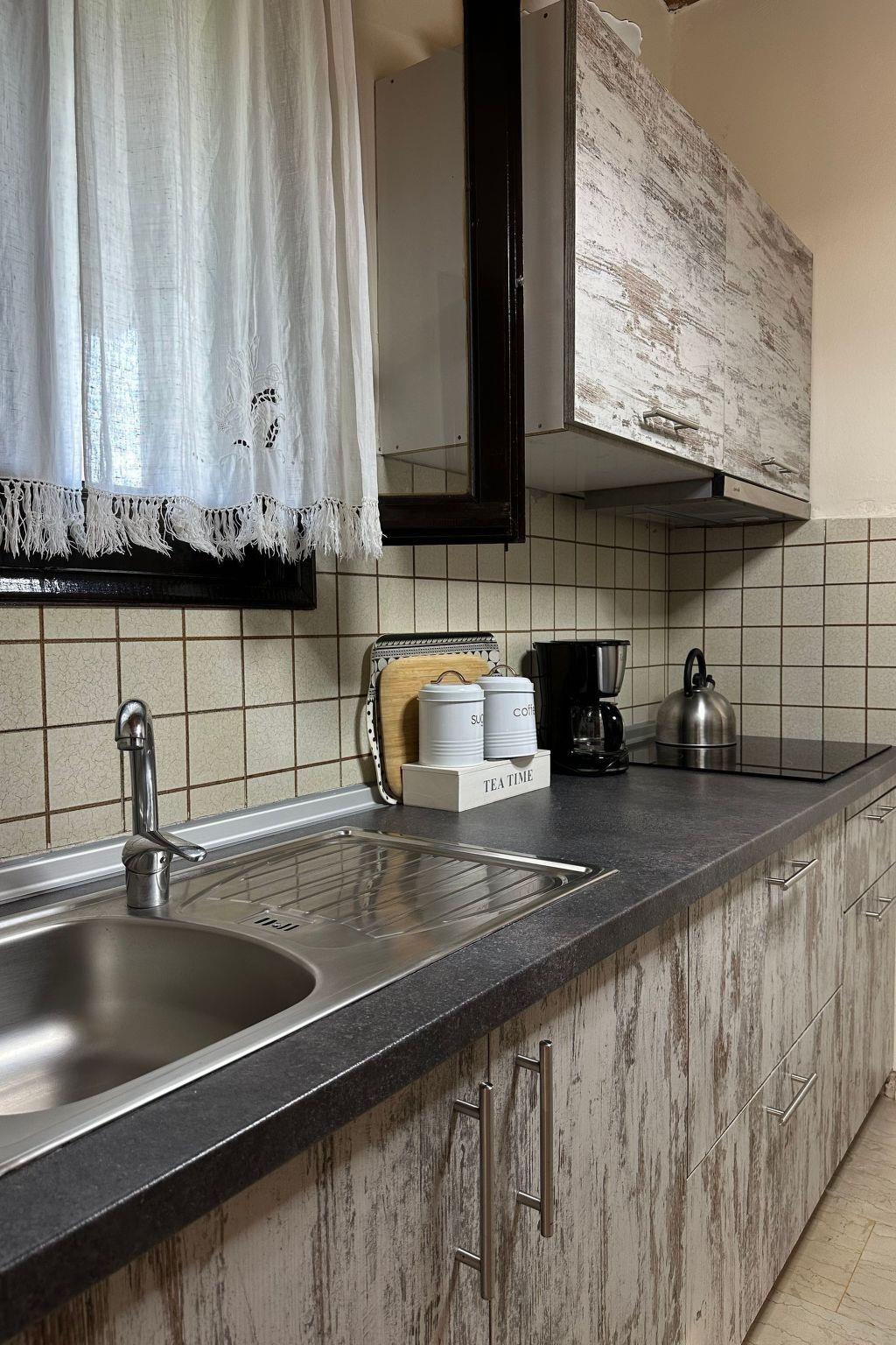 Inside, each apartment spans a generous 40 sqm, thoughtfully arranged to accommodate up to 3 adults or 2 adults and 2 children in utmost comfort. The layout includes a private double bedroom, a fully equipped kitchen capable of servicing five persons, and a living area complete with sofa beds that double as an extra sleeping space. The interior is adorned with a decor that creates a warm, homely atmosphere, featuring a bathroom with a shower that marries functionality with comfort, and is complemented by a veranda offering tranquil garden and sea views—perfect for both relaxation and entertainment.