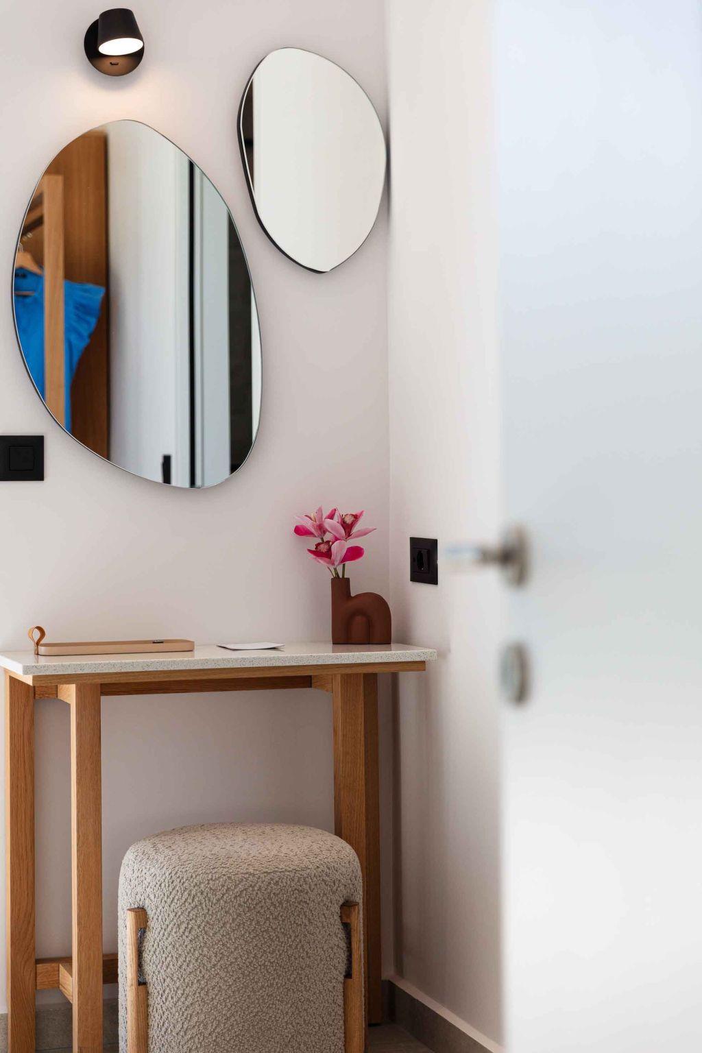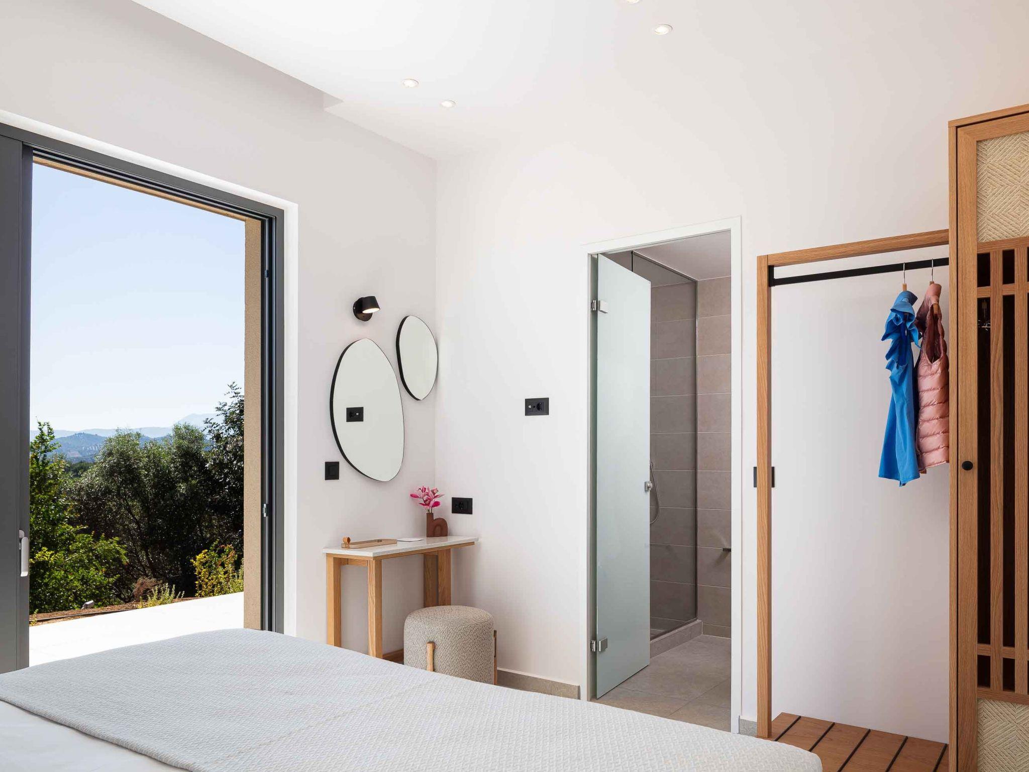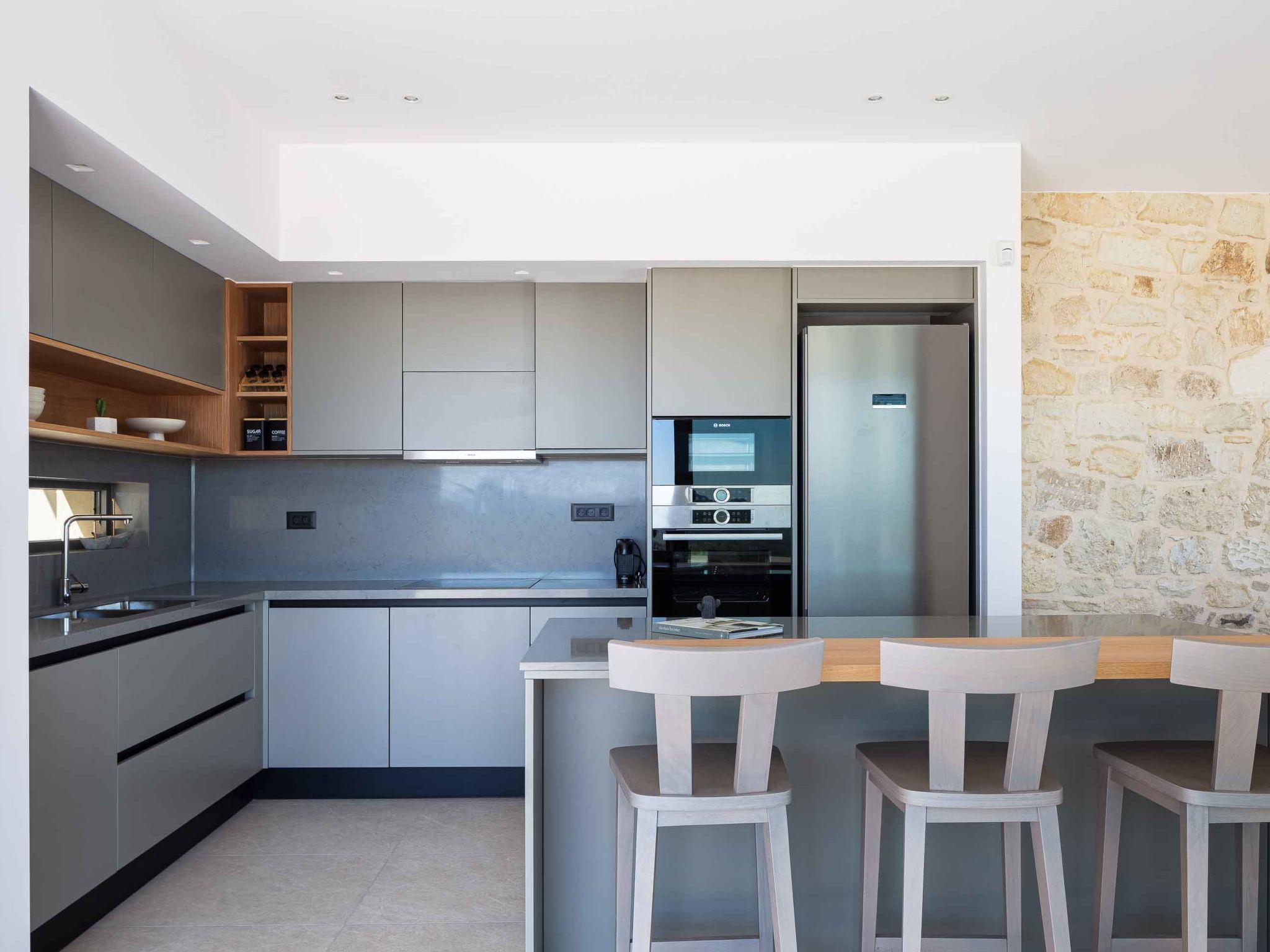 Villa Aglaea is set on one floor, covering 157 sq.m. in total and it accommodates 6 guests in its 3 ensuite bedrooms. Sleek, monochrome and practical, combining the wooden element with the earthy stone, Villa Aglaea invokes a sense of calm, something that makes staying here feel like a proper treat! Entering through its airy open-plan living space, you will be amazed by how the contemporary and fresh interior balances neutral tones, and hues of beige with textures creating the perfect spot for you and your loved ones. The lounge area wraps around the fireplace and the 55” Smart Satellite TV includes a sofa seating large enough for the entire family or friends. Unfolding across one floor, the large windows create a bright, airy living space waiting for you while in the meantime, a few steps further a fully equipped kitchen is found. The same area consists of three bedrooms, spread all over the left side of the villa, with en-suite bathrooms all with showers, adequate for you and your loved ones after a long day in the sun. Not far from this area, there is an extra communal WC, which is suitable for every guest here. There are two yoga mattresses for yoga lovers.