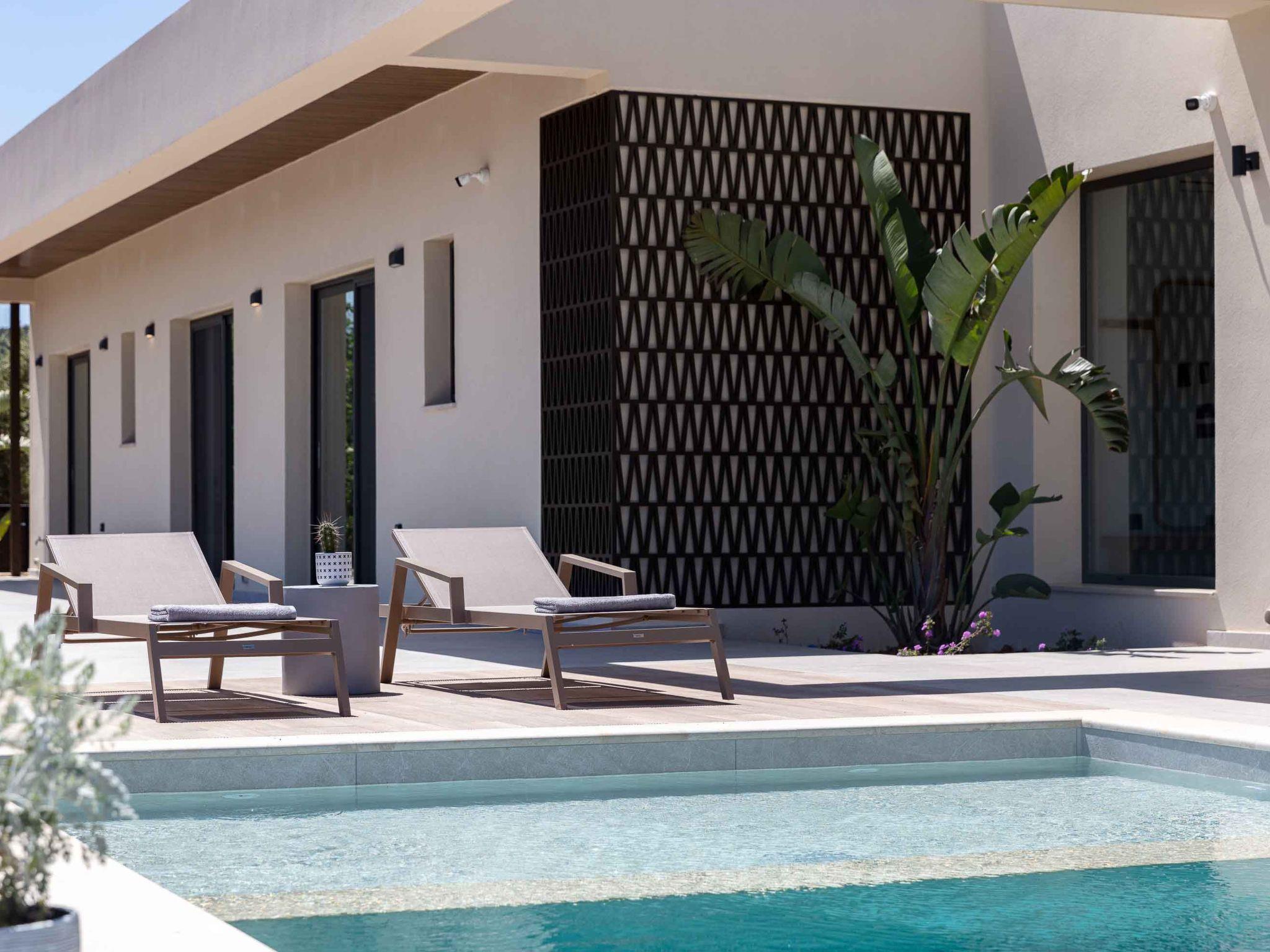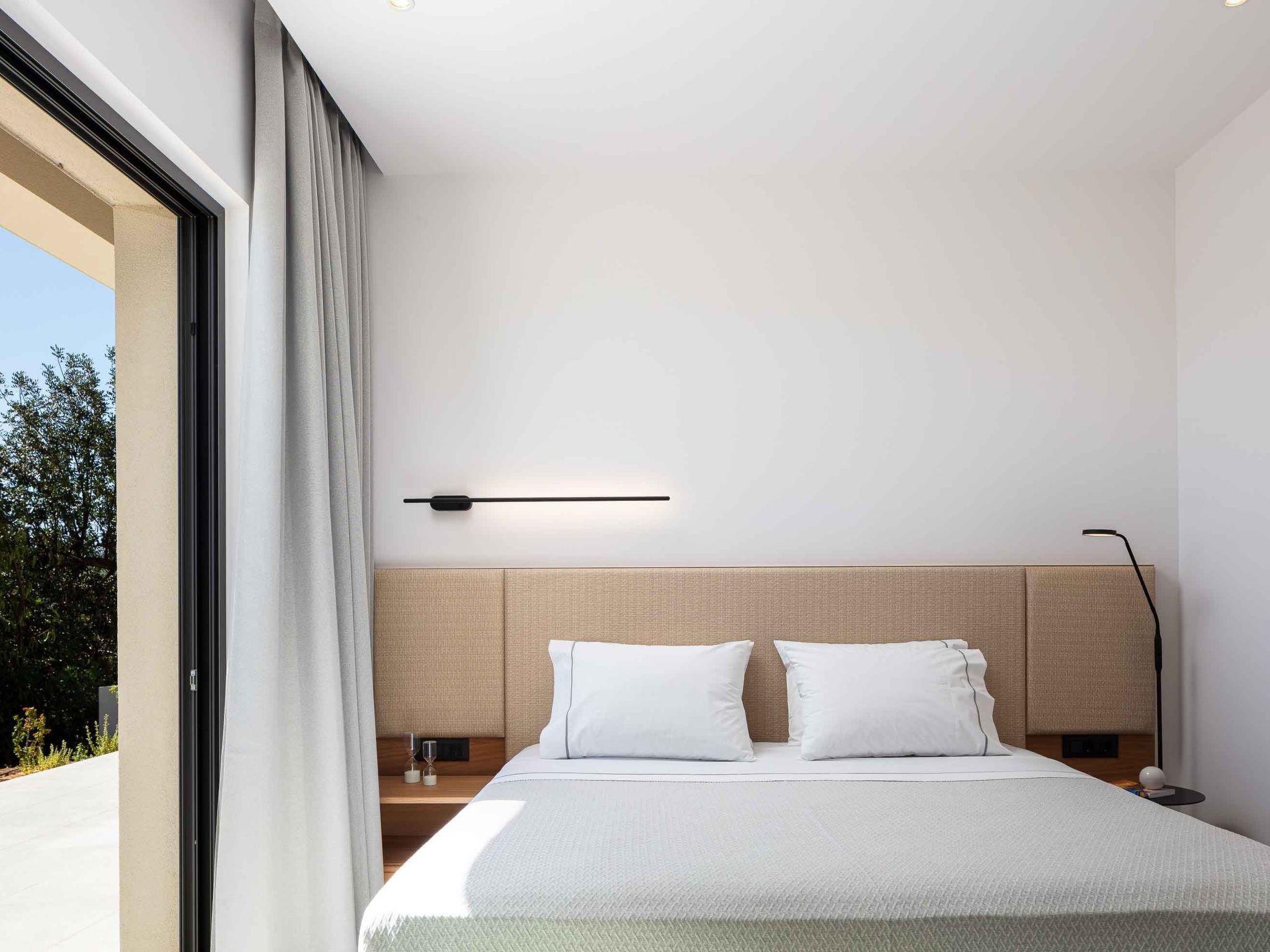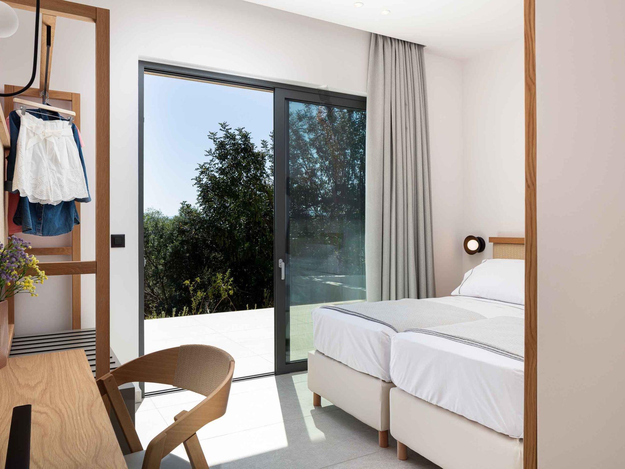Villa Aglaea is set on one floor, covering 157 sq.m. in total and it accommodates 6 guests in its 3 ensuite bedrooms. Sleek, monochrome and practical, combining the wooden element with the earthy stone, Villa Aglaea invokes a sense of calm, something that makes staying here feel like a proper treat! Entering through its airy open-plan living space, you will be amazed by how the contemporary and fresh interior balances neutral tones, and hues of beige with textures creating the perfect spot for you and your loved ones. The lounge area wraps around the fireplace and the 55” Smart Satellite TV includes a sofa seating large enough for the entire family or friends. Unfolding across one floor, the large windows create a bright, airy living space waiting for you while in the meantime, a few steps further a fully equipped kitchen is found. The same area consists of three bedrooms, spread all over the left side of the villa, with en-suite bathrooms all with showers, adequate for you and your loved ones after a long day in the sun. Not far from this area, there is an extra communal WC, which is suitable for every guest here. There are two yoga mattresses for yoga lovers.
