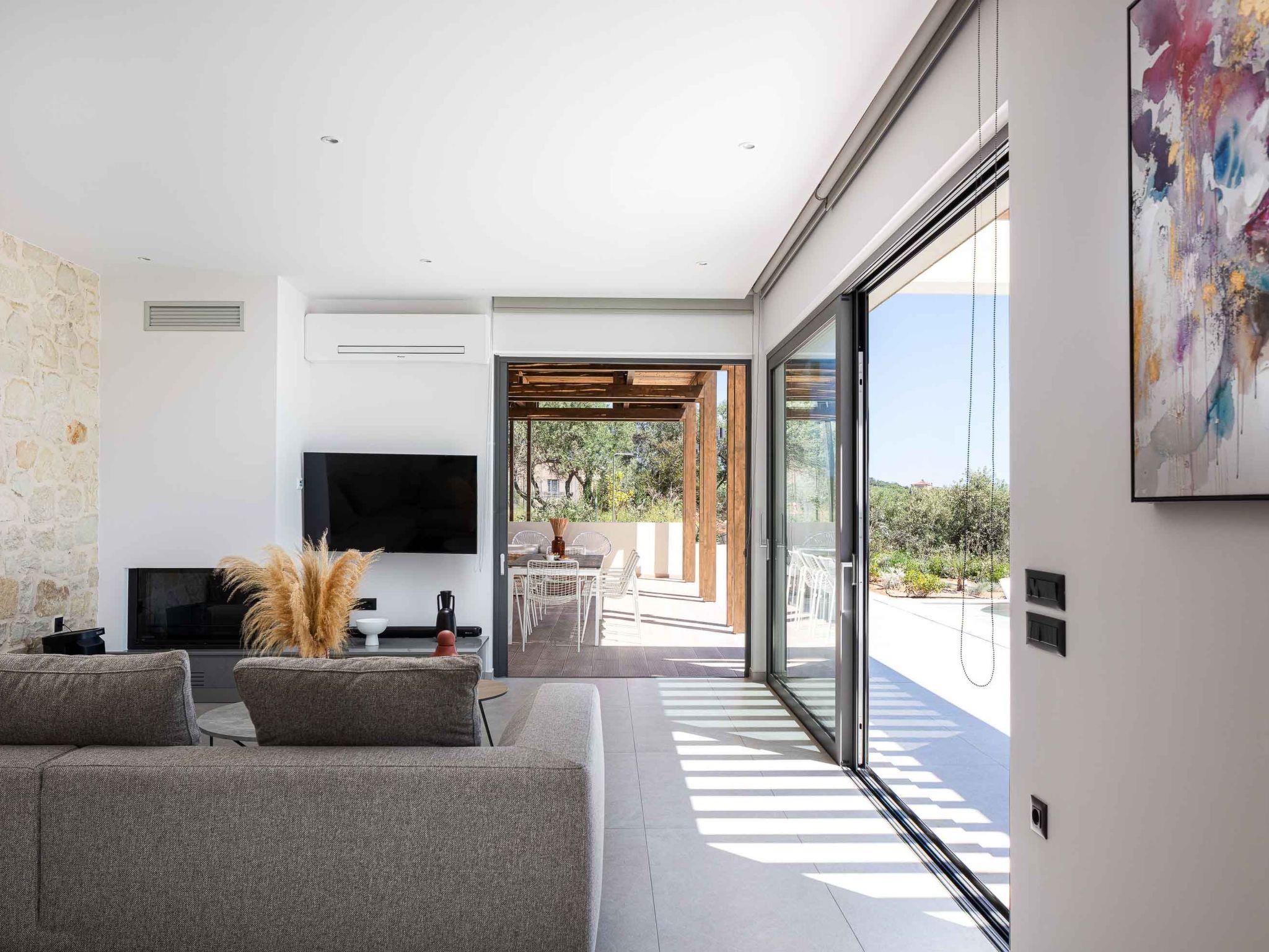 Living area with sofa, 55’’ Satellite Smart TV, fireplace, access to the pool terrace, sea view