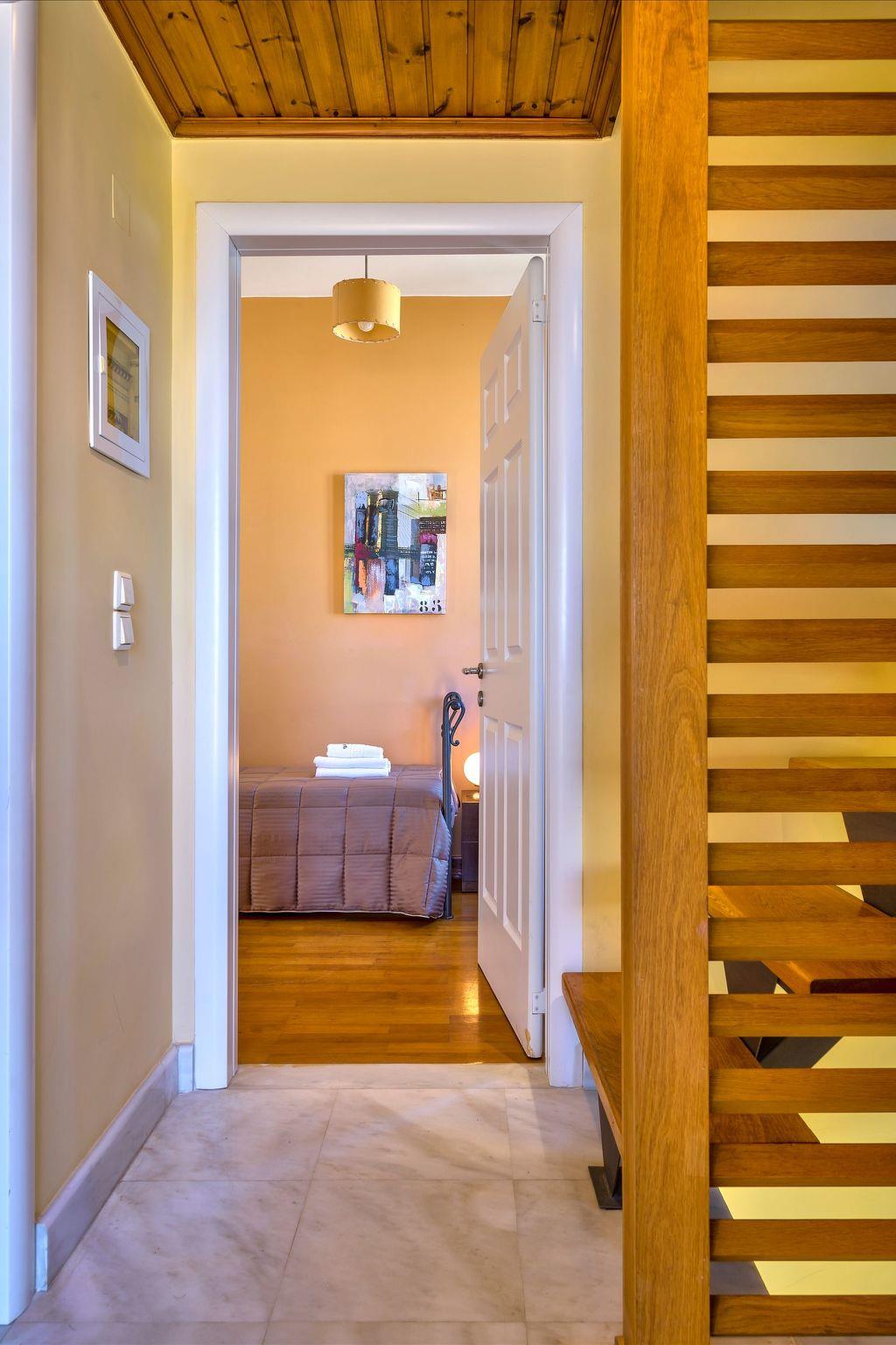 As we are taking the marble staircase up to the first floor, we can see two bedrooms and a bathroom.