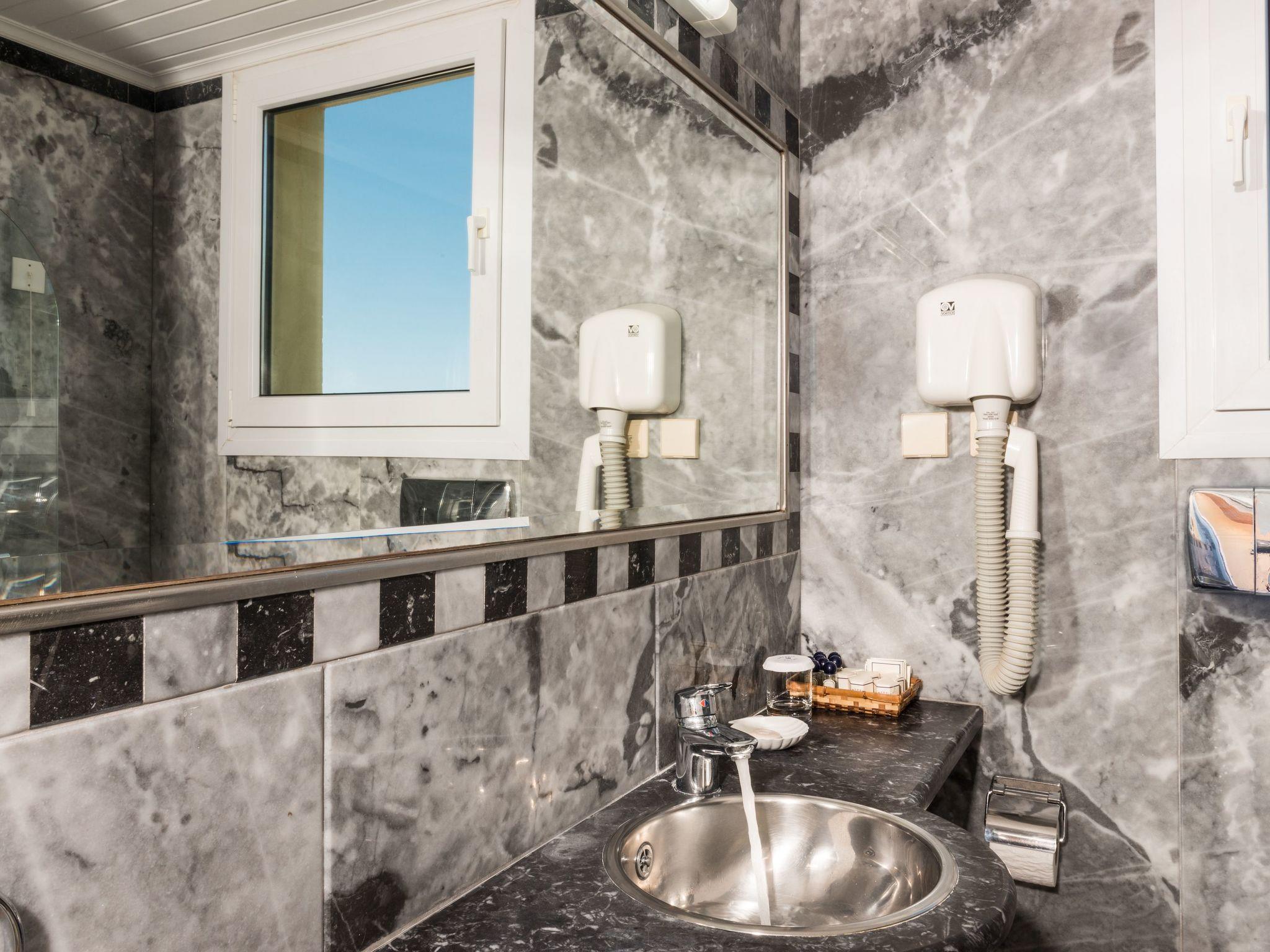 The bathroom is marble lined with a large bathtub. All bathrooms feature complementary toiletries.
