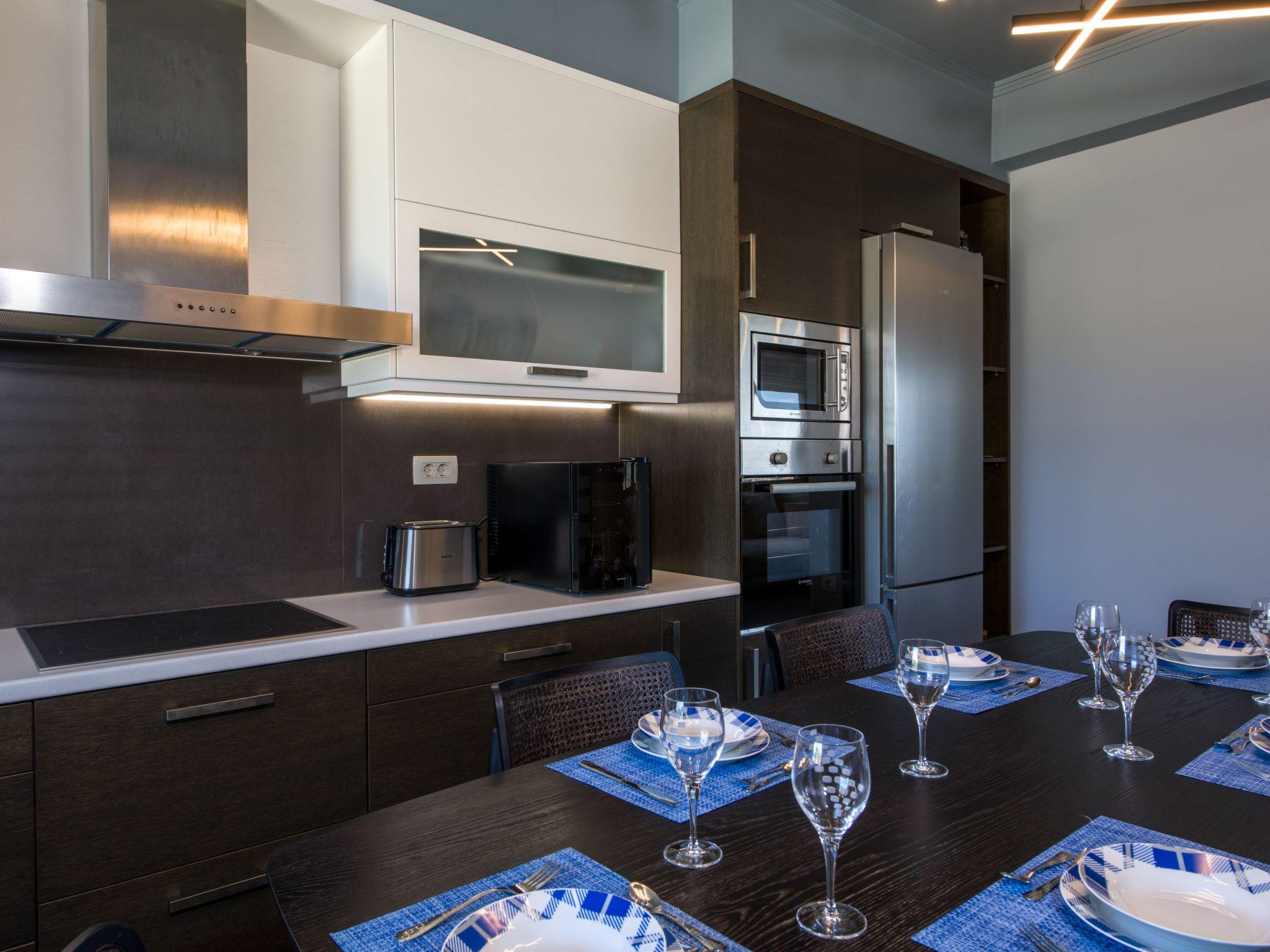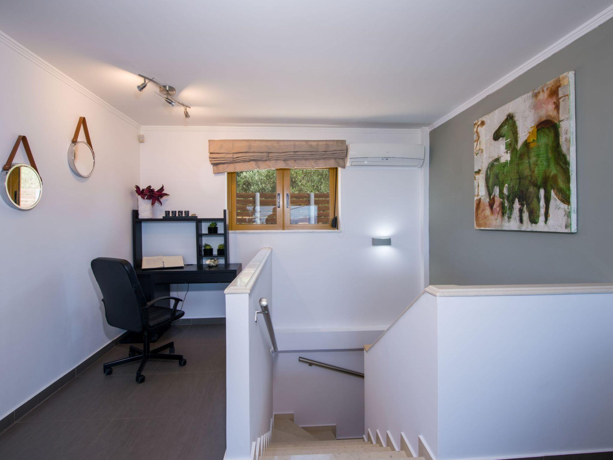 The luxurious villa is spread over two floors and can features a generous living space of approximately 200 m². It can accommodate eight guests. The interior is simple, but modern and with all the necessary comfort and luxury. It has four spacious bedrooms and four bathrooms. The bedrooms are furnished with two queensize double beds and four single beds. The living room provides a large corner sofa, a chaise longue and a flatscreen TV with satellite channes, net flix, a play station and affords a beautiful view of the sea. From here you can access the kitchen, which is fully-equipped with a stove, oven, fridge-freezer, microwave, kettle, toaster, coffee machine and dishwasher. There is also a dining table with six chairs. The four bathrooms are fitted differently, one with a whirlpool, one with a bath and two with a shower. Free wireless Internet access and air conditioning are available. The property can accommodate more than eight guests (adults & children) by adding extra beds or sofas uppon any request or wish.