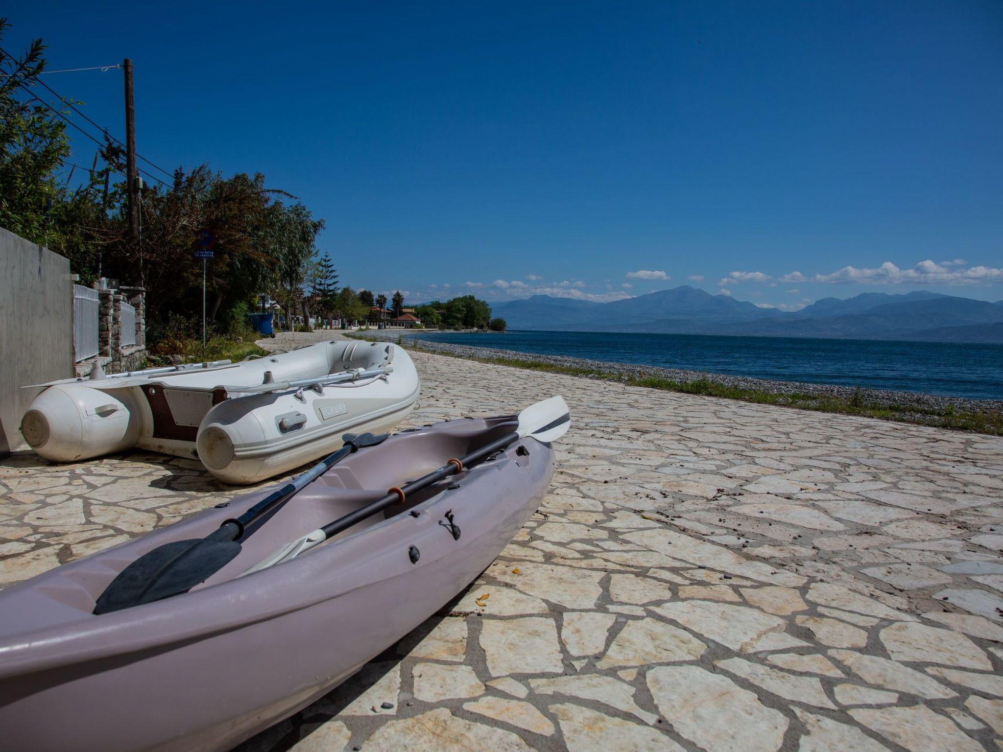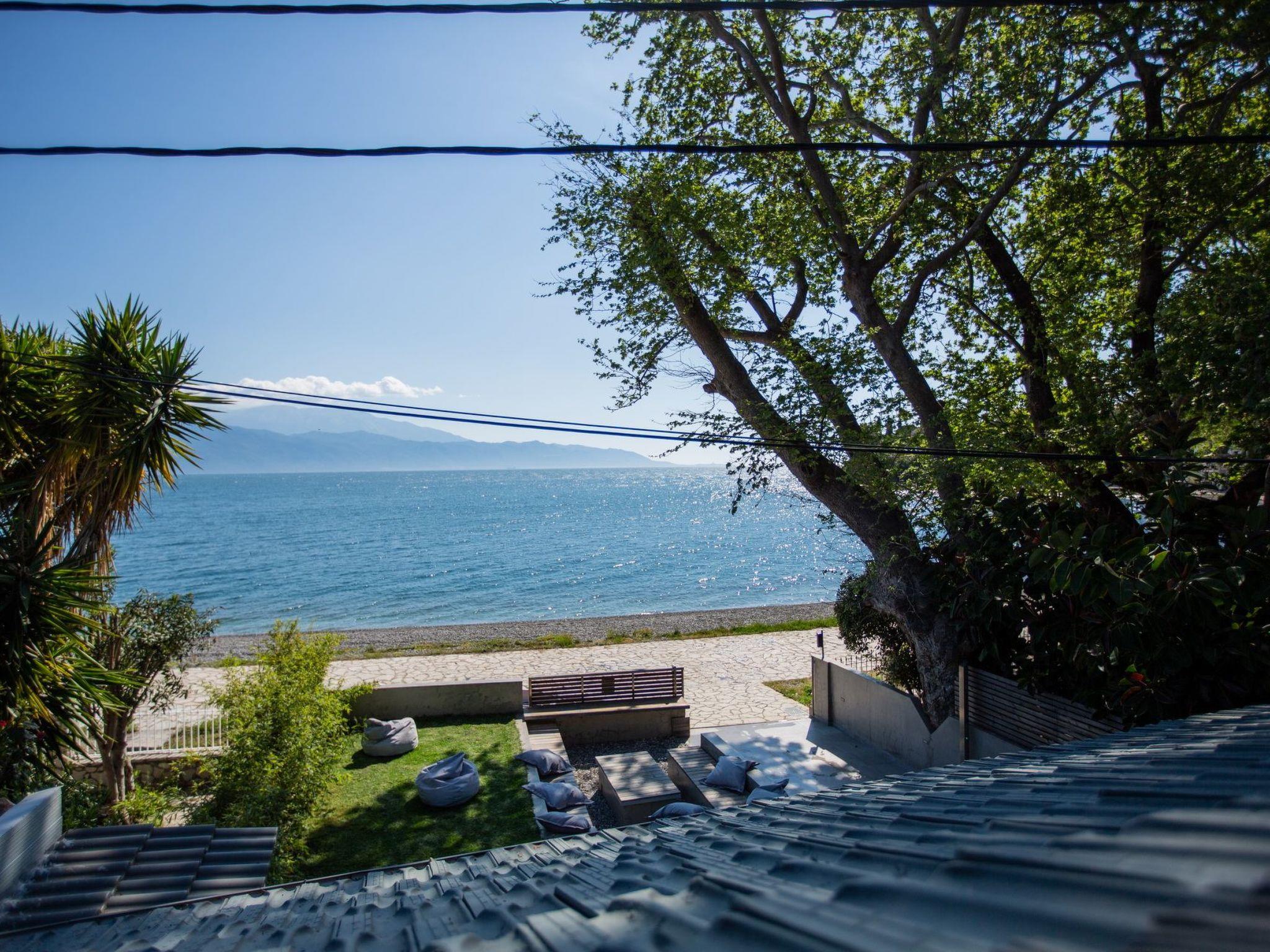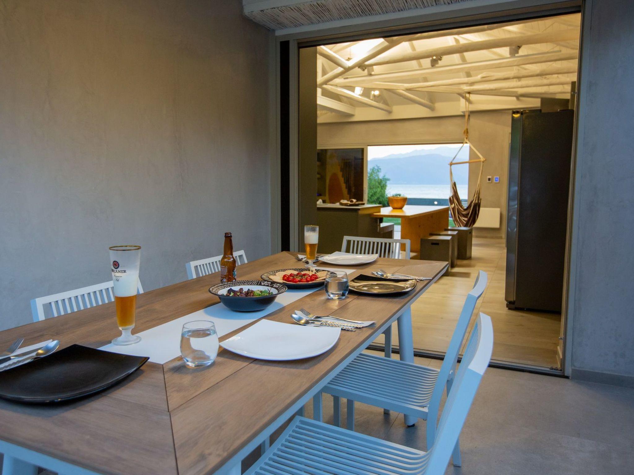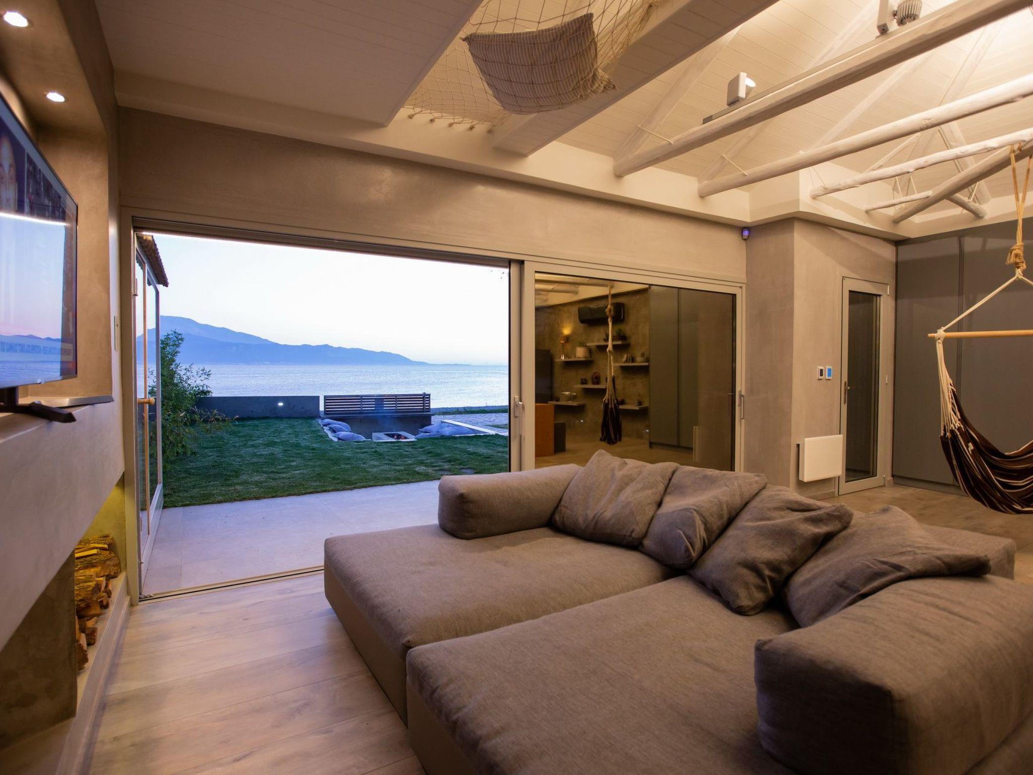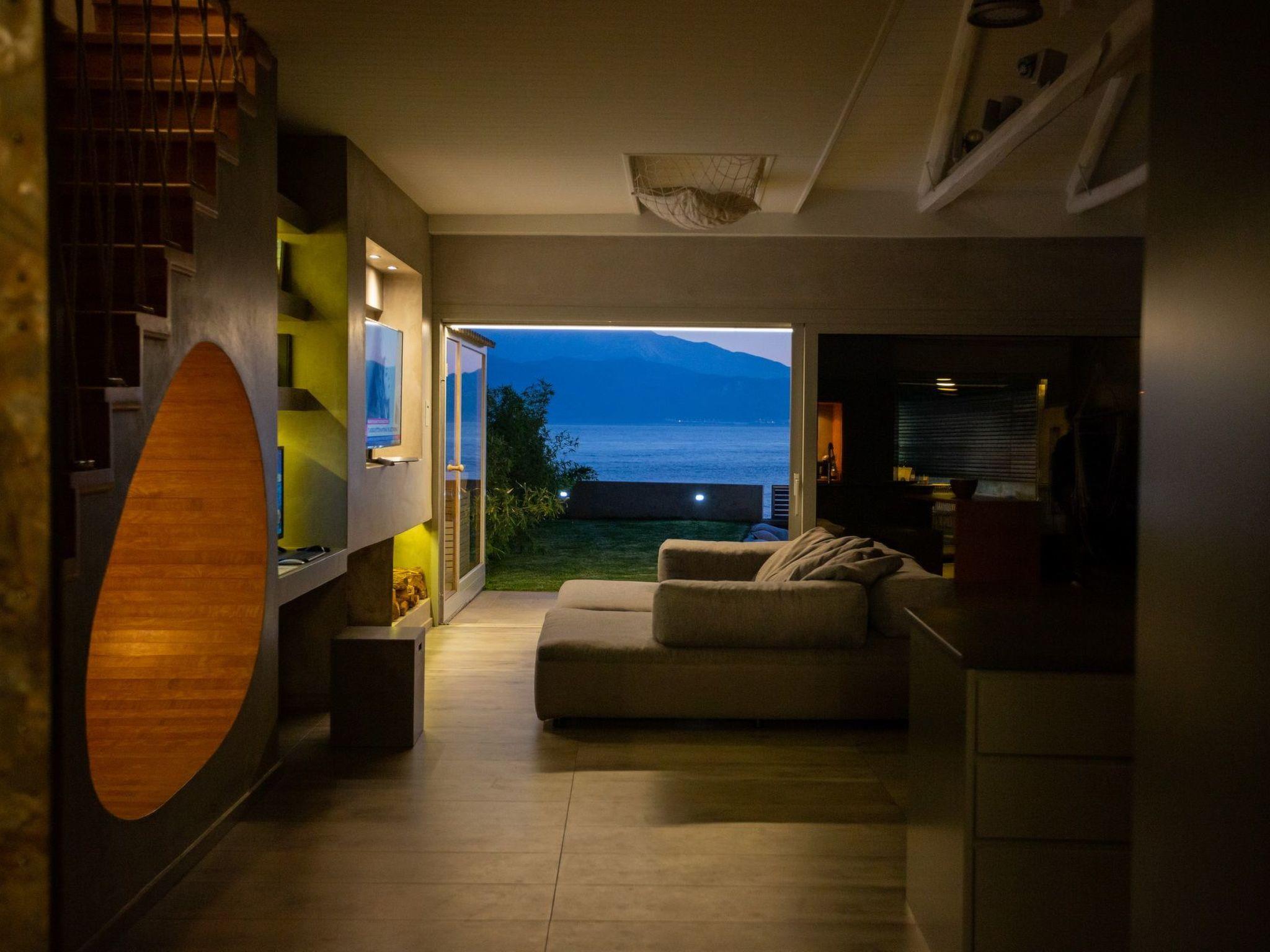 It’s built in with the sea” as it is only 10 meters away from it and is located in the best part of the beach, under plane trees and near a small sea platform. It is a charming and spacious villa of 130sq.m with large spaces and a bright living room facing to the south. This luxurious two-story villa with two bedrooms and two bathrooms can provide accommodation for up to six people. The combination of tall wooden ceilings and large glass doors allows a stunning view on the sea, the Rio-Antirio bridge, a small picturesque church and the Peloponnesian mountains.“ This villa is an absolute smart home, renovated with today’s highest standards of house construction and accomplishes the in-out living perfectly.On the ground floor there is a beautiful living room with a fireplace and a 55” television, an open spaced kitchen with an island fully equipped with branded built-in electrical devices, a dedicated multimedia workspace, and a built-in “nock” couch all in the same open space.There is also a large master bedroom with a king size bed, a double doored closet, a bathroom with two sinks and an in-out shower with multiple water ejectors. Finally there is an extraordinary WC, a large walk-in closet and a laundry room. On the second floor (attic) there is a bedroom with 2 single beds, 2 hammock beds, a desk with a bookcase and a roof window that offers a unique view and brightens up the place.