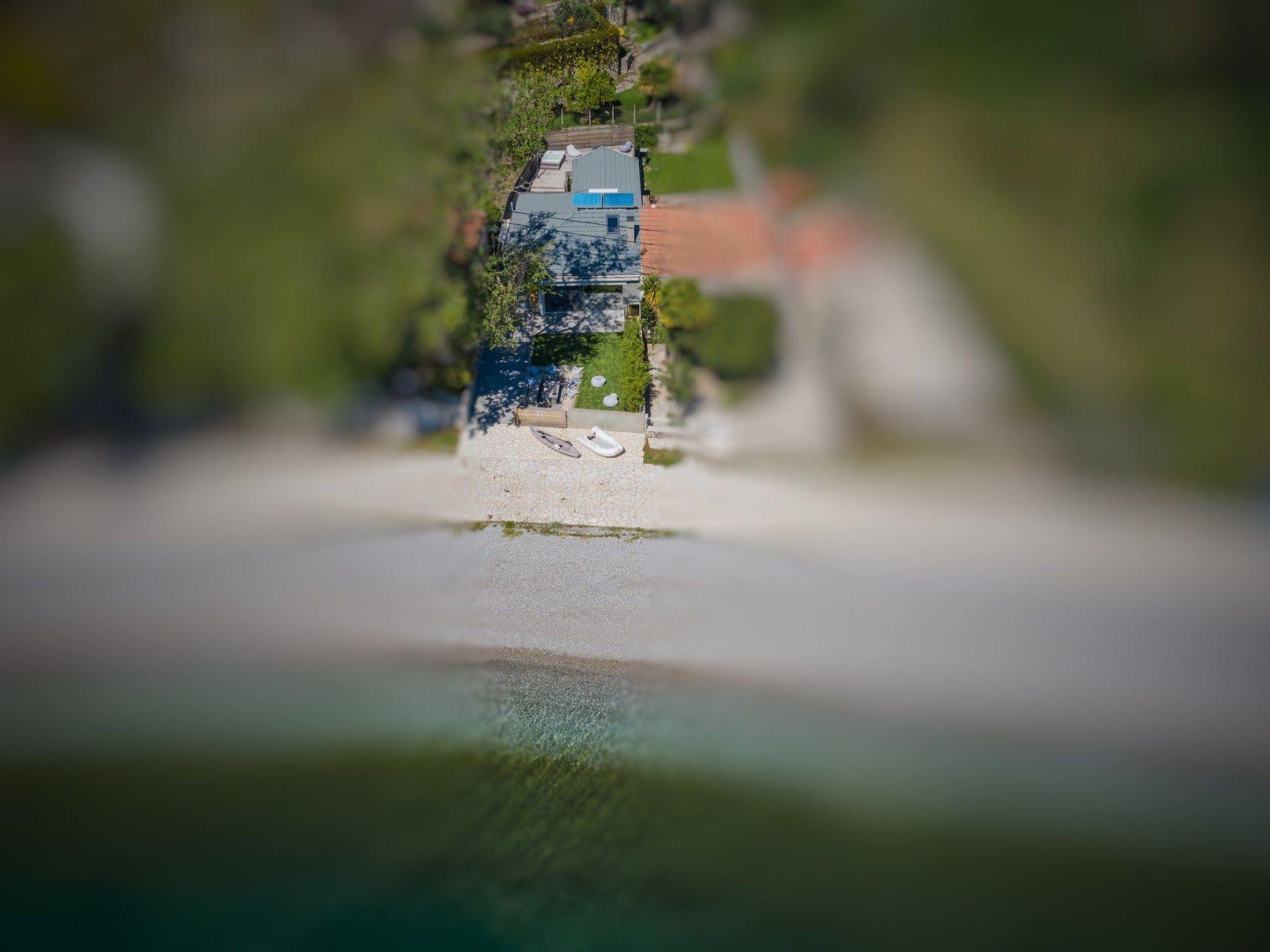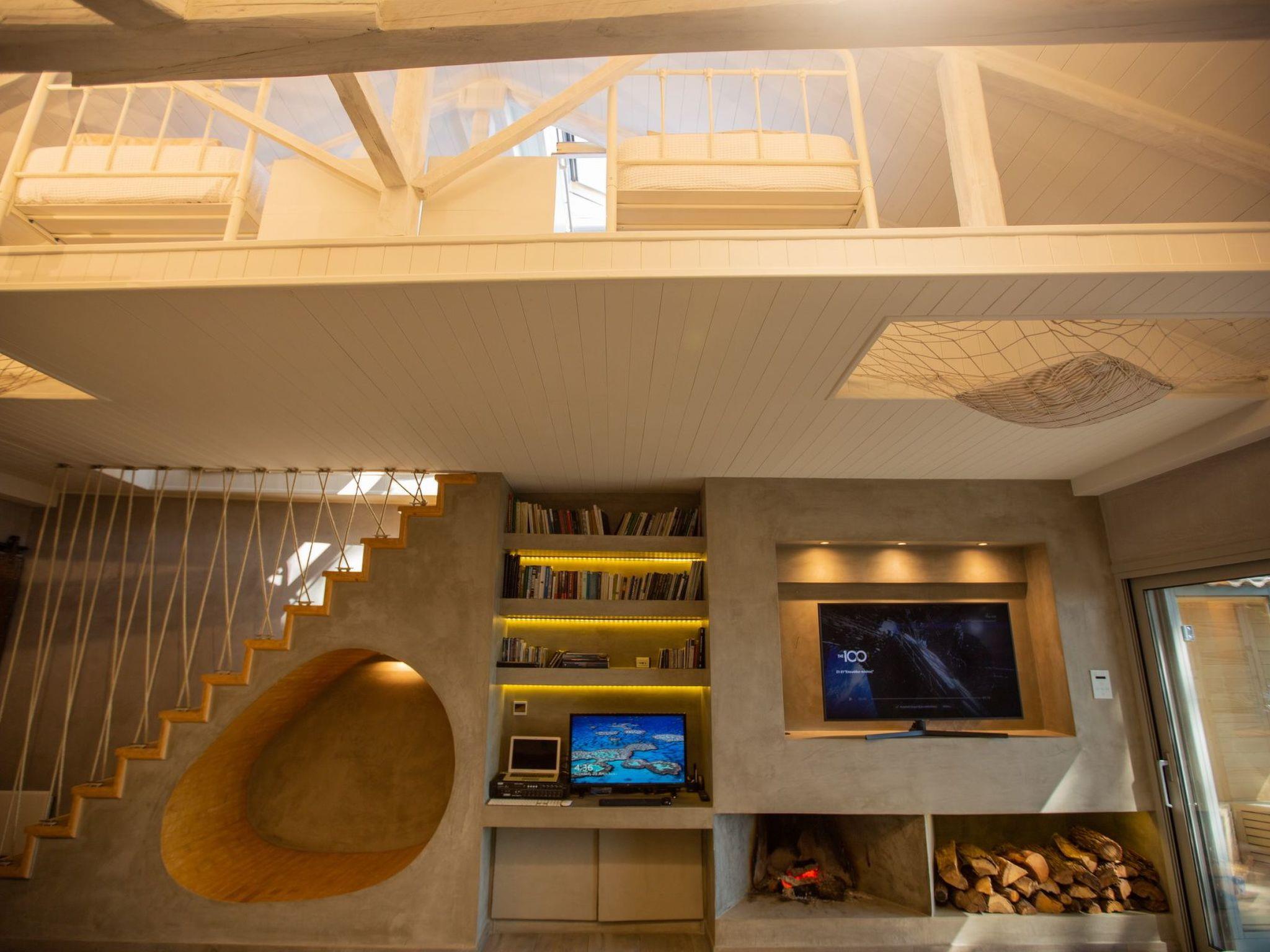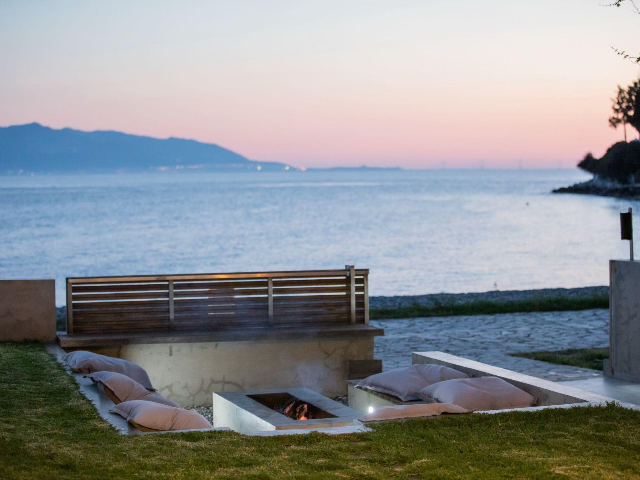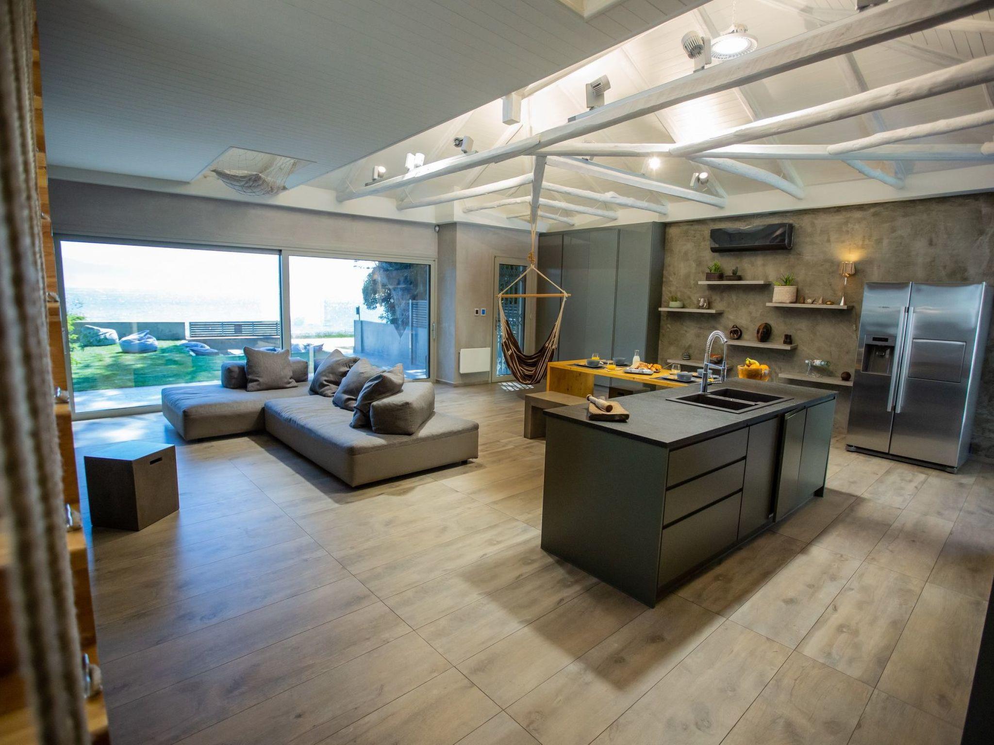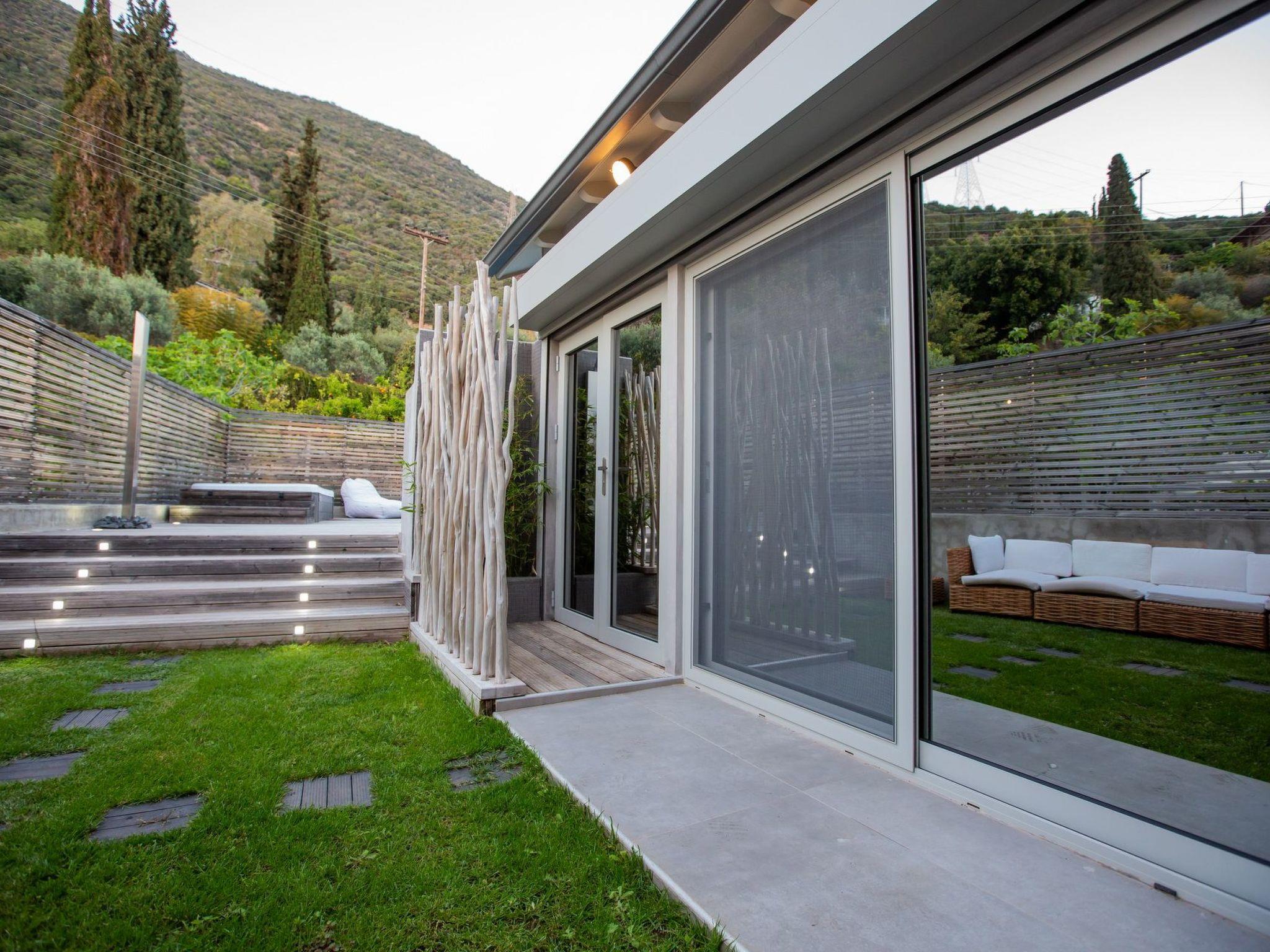 It’s built in with the sea” as it is only 10 meters away from it and is located in the best part of the beach, under plane trees and near a small sea platform. It is a charming and spacious villa of 130sq.m with large spaces and a bright living room facing to the south. This luxurious two-story villa with two bedrooms and two bathrooms can provide accommodation for up to six people. The combination of tall wooden ceilings and large glass doors allows a stunning view on the sea, the Rio-Antirio bridge, a small picturesque church and the Peloponnesian mountains.“ This villa is an absolute smart home, renovated with today’s highest standards of house construction and accomplishes the in-out living perfectly.On the ground floor there is a beautiful living room with a fireplace and a 55” television, an open spaced kitchen with an island fully equipped with branded built-in electrical devices, a dedicated multimedia workspace, and a built-in “nock” couch all in the same open space.There is also a large master bedroom with a king size bed, a double doored closet, a bathroom with two sinks and an in-out shower with multiple water ejectors. Finally there is an extraordinary WC, a large walk-in closet and a laundry room. On the second floor (attic) there is a bedroom with 2 single beds, 2 hammock beds, a desk with a bookcase and a roof window that offers a unique view and brightens up the place.