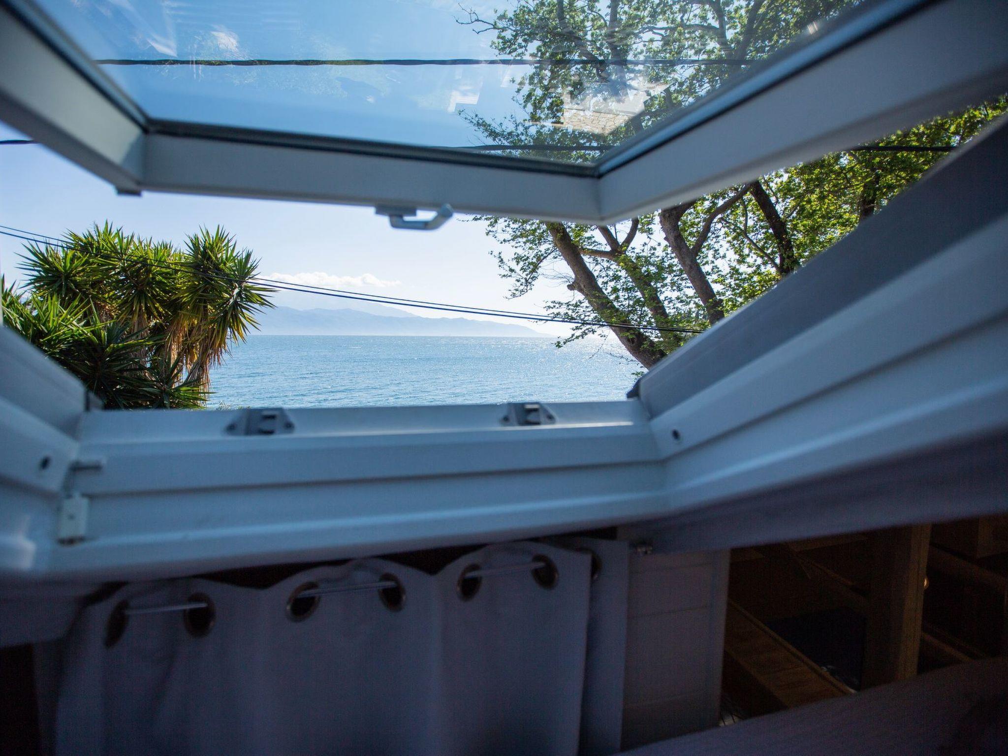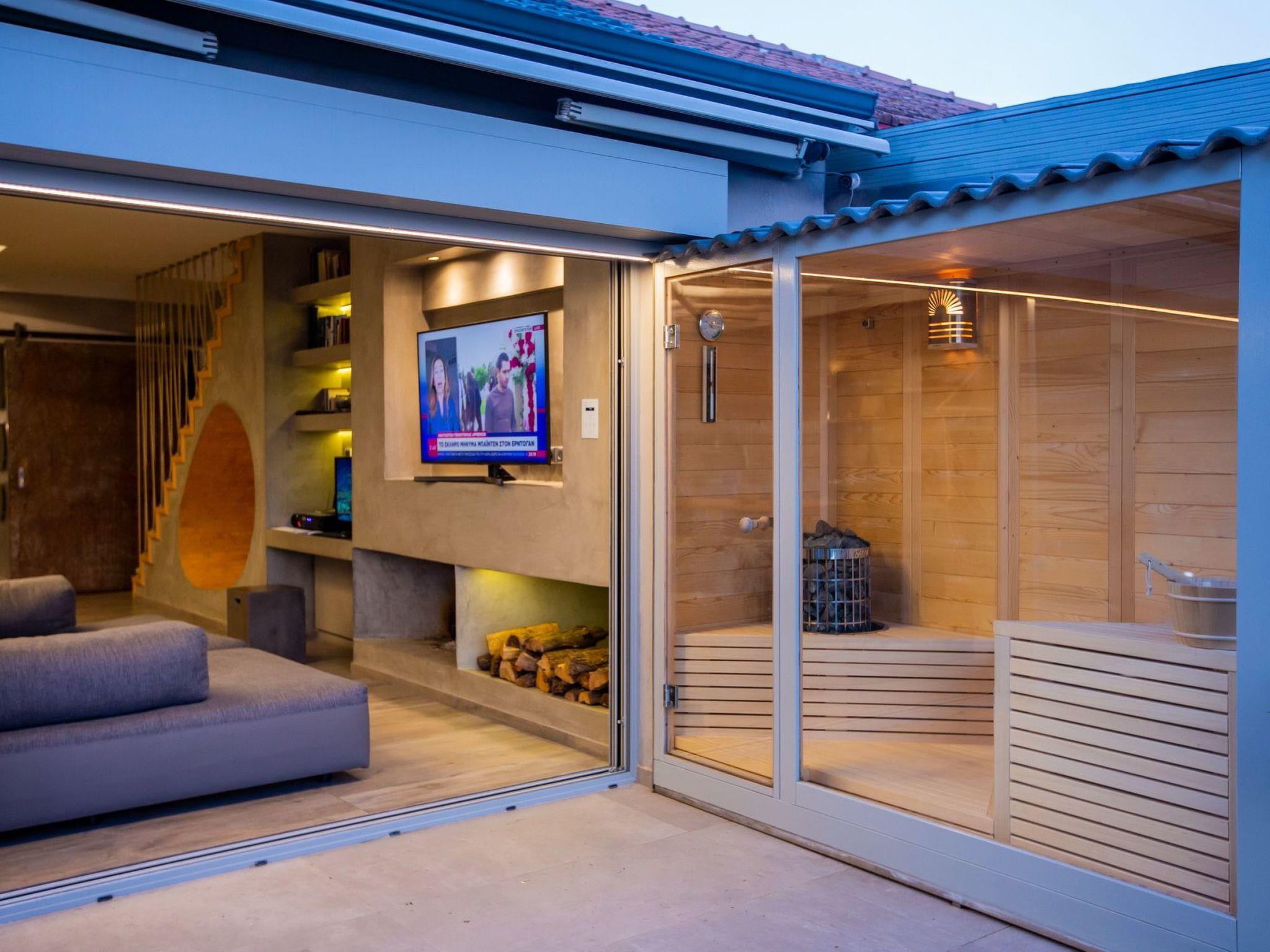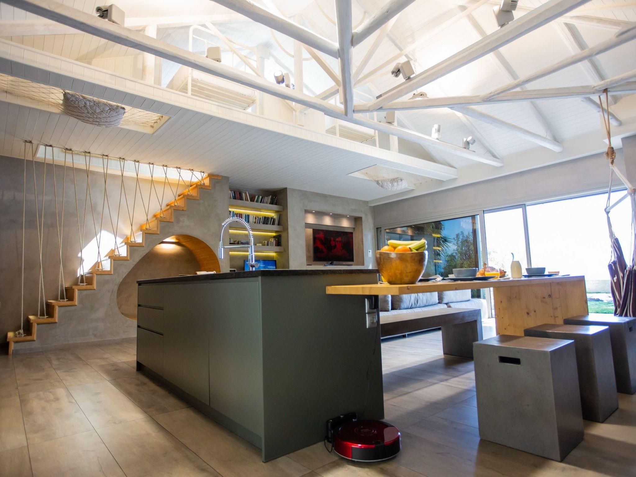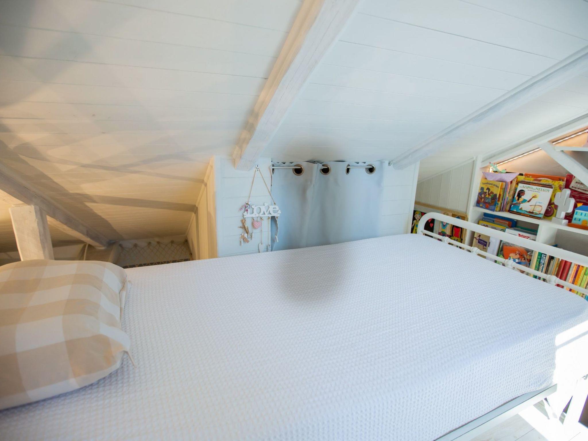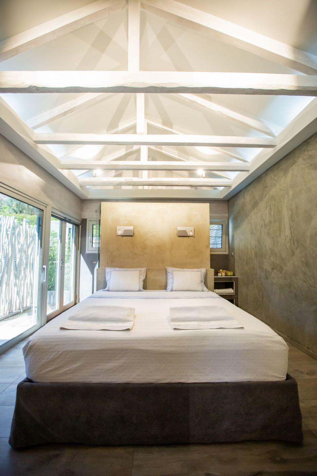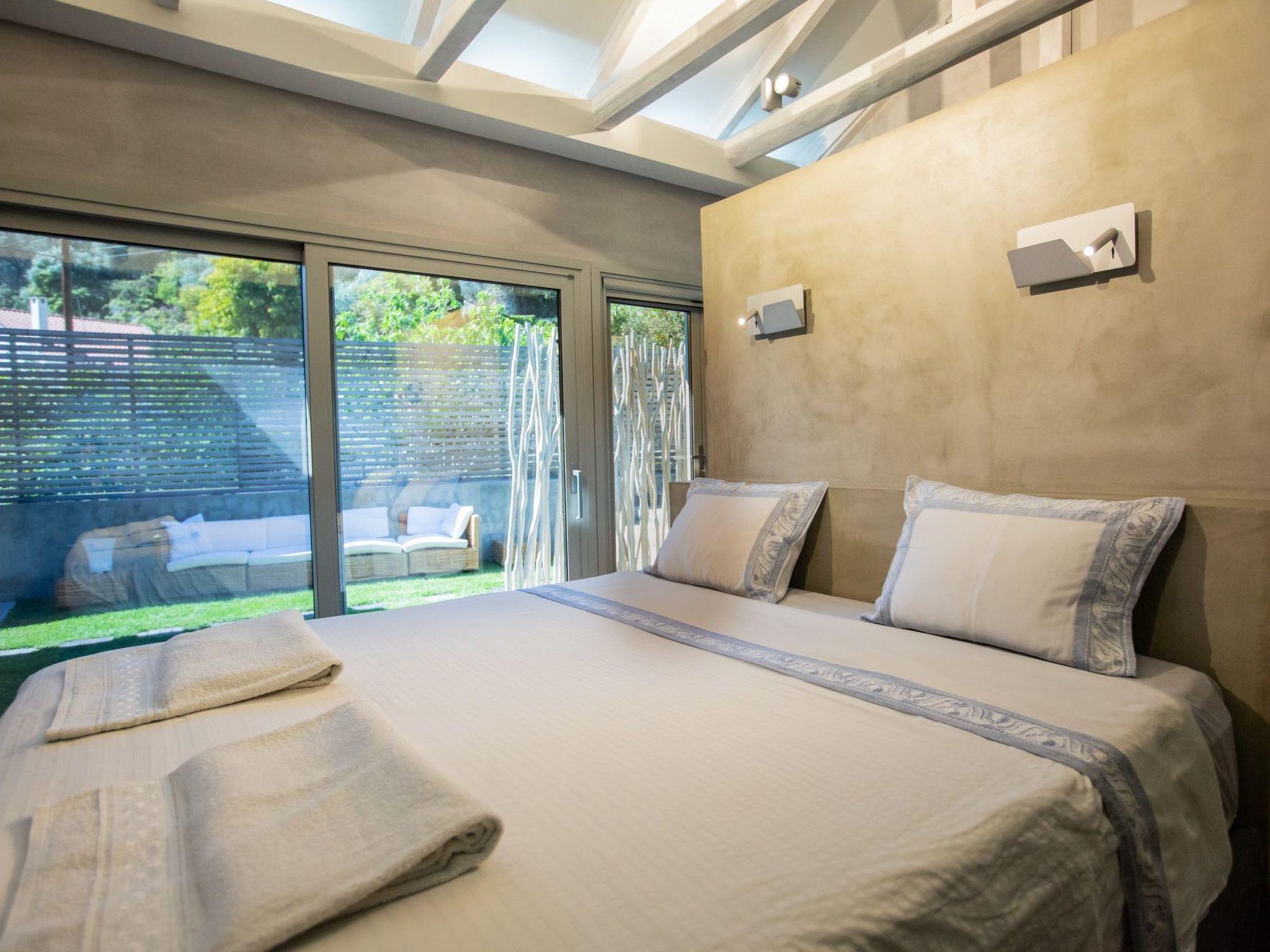 It’s built in with the sea” as it is only 10 meters away from it and is located in the best part of the beach, under plane trees and near a small sea platform. It is a charming and spacious villa of 130sq.m with large spaces and a bright living room facing to the south. This luxurious two-story villa with two bedrooms and two bathrooms can provide accommodation for up to six people. The combination of tall wooden ceilings and large glass doors allows a stunning view on the sea, the Rio-Antirio bridge, a small picturesque church and the Peloponnesian mountains.“ This villa is an absolute smart home, renovated with today’s highest standards of house construction and accomplishes the in-out living perfectly.On the ground floor there is a beautiful living room with a fireplace and a 55” television, an open spaced kitchen with an island fully equipped with branded built-in electrical devices, a dedicated multimedia workspace, and a built-in “nock” couch all in the same open space.There is also a large master bedroom with a king size bed, a double doored closet, a bathroom with two sinks and an in-out shower with multiple water ejectors. Finally there is an extraordinary WC, a large walk-in closet and a laundry room. On the second floor (attic) there is a bedroom with 2 single beds, 2 hammock beds, a desk with a bookcase and a roof window that offers a unique view and brightens up the place.