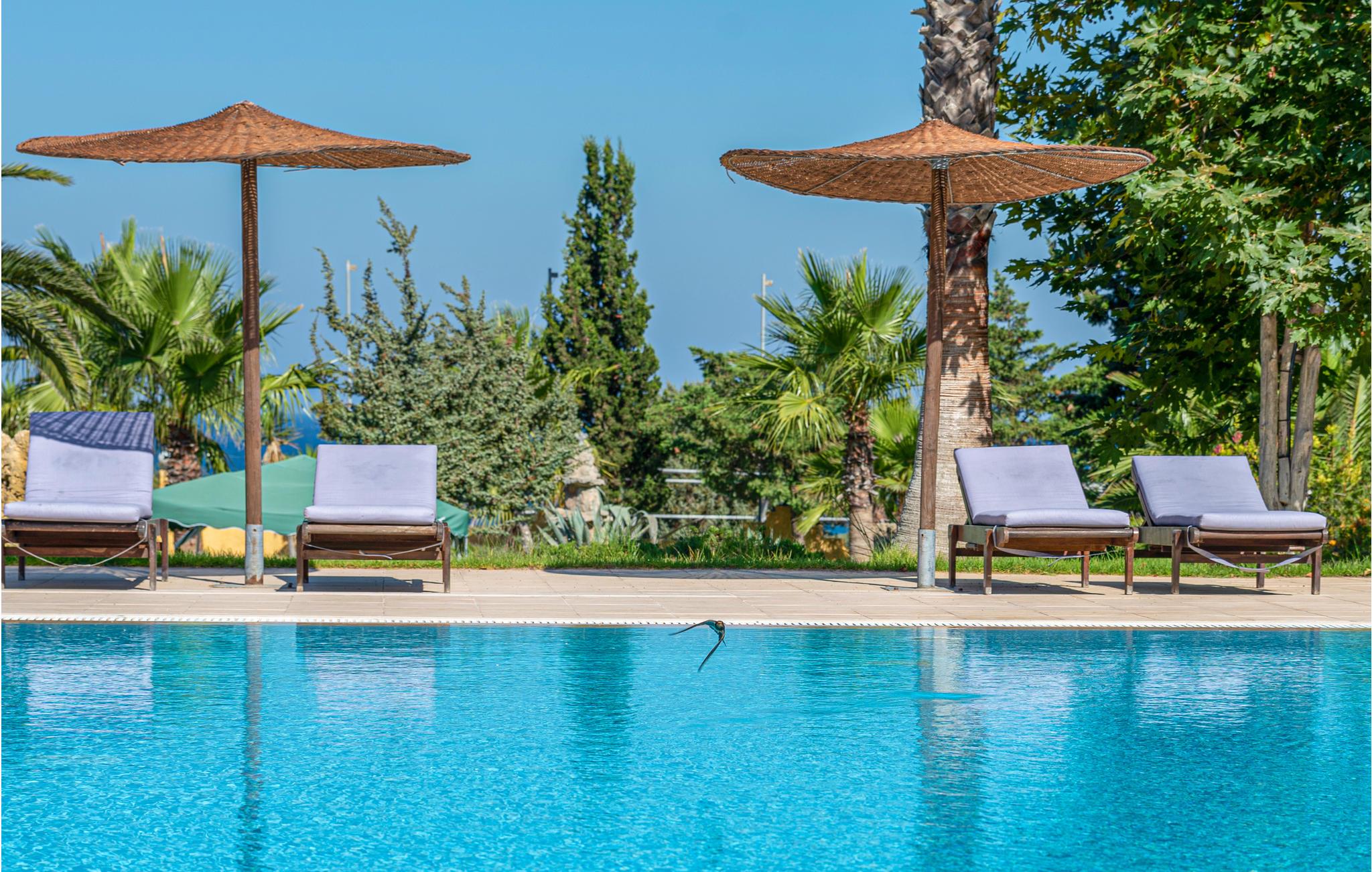Den herlige strand kan I nå på cykel eller til fods gennem et dejligt grønt naturlandskab. Eller slap af i poolområdet med både et hoved- og et børnebassin. Her kan I også nyde en kop kaffe eller en drink i baren eller under en af parasollerne.