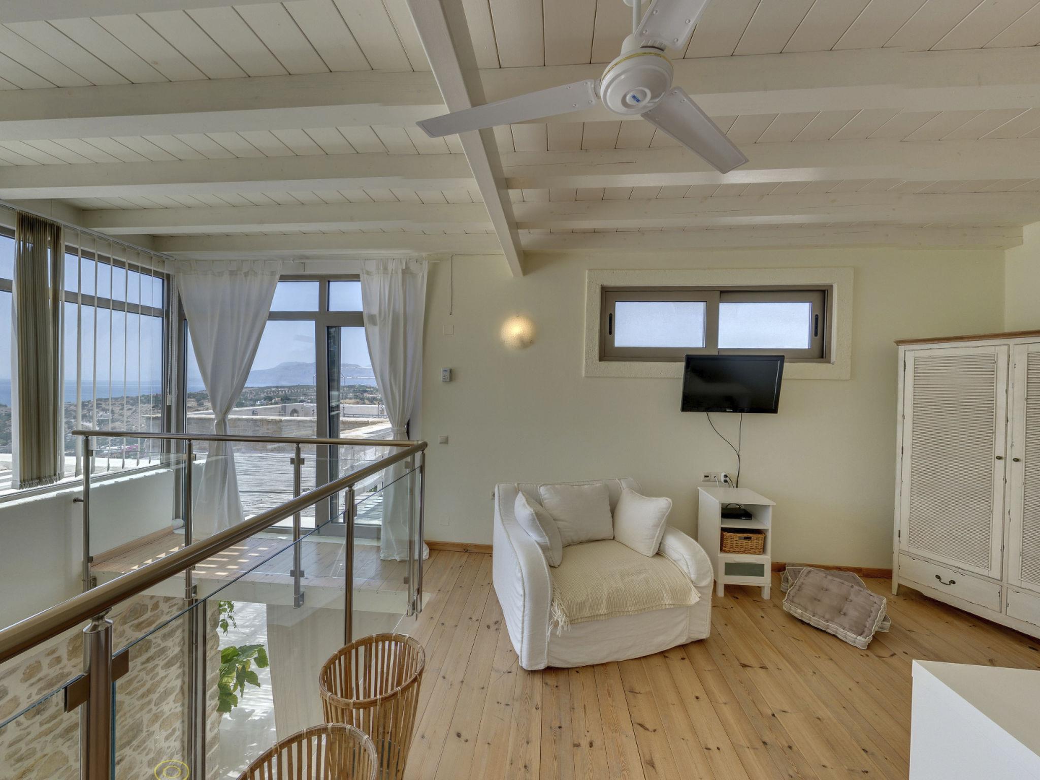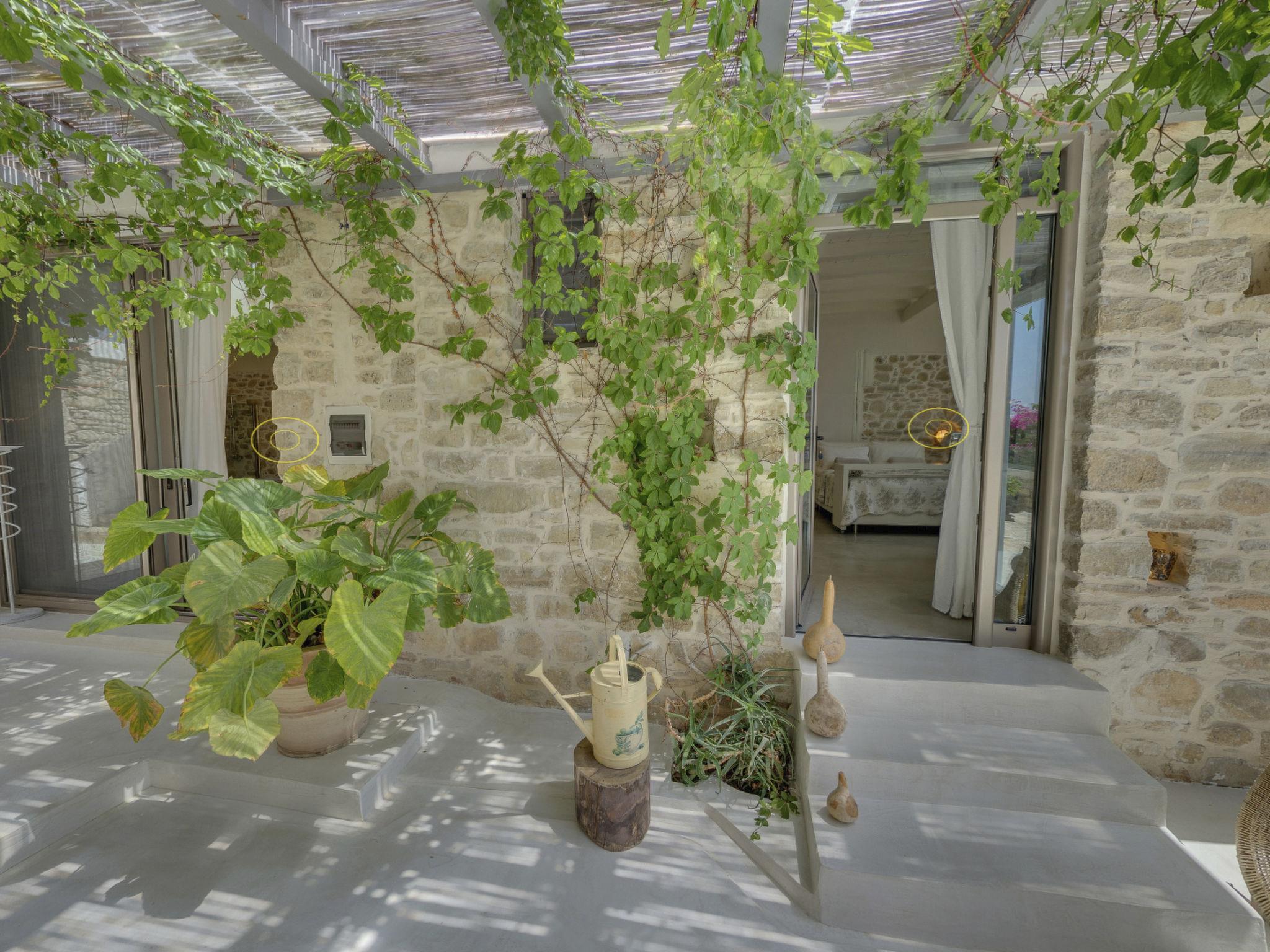 Luxury domicile with sea view to the Libyan Sea, mountain panorama Psiloritis as well as the Messara plain, top location on the mountain above Pitsidia, detached, fascinating 360° view, lots of light, bright and high rooms, natural stone and modern, alternate harmoniously with glass, on 350m² living space.