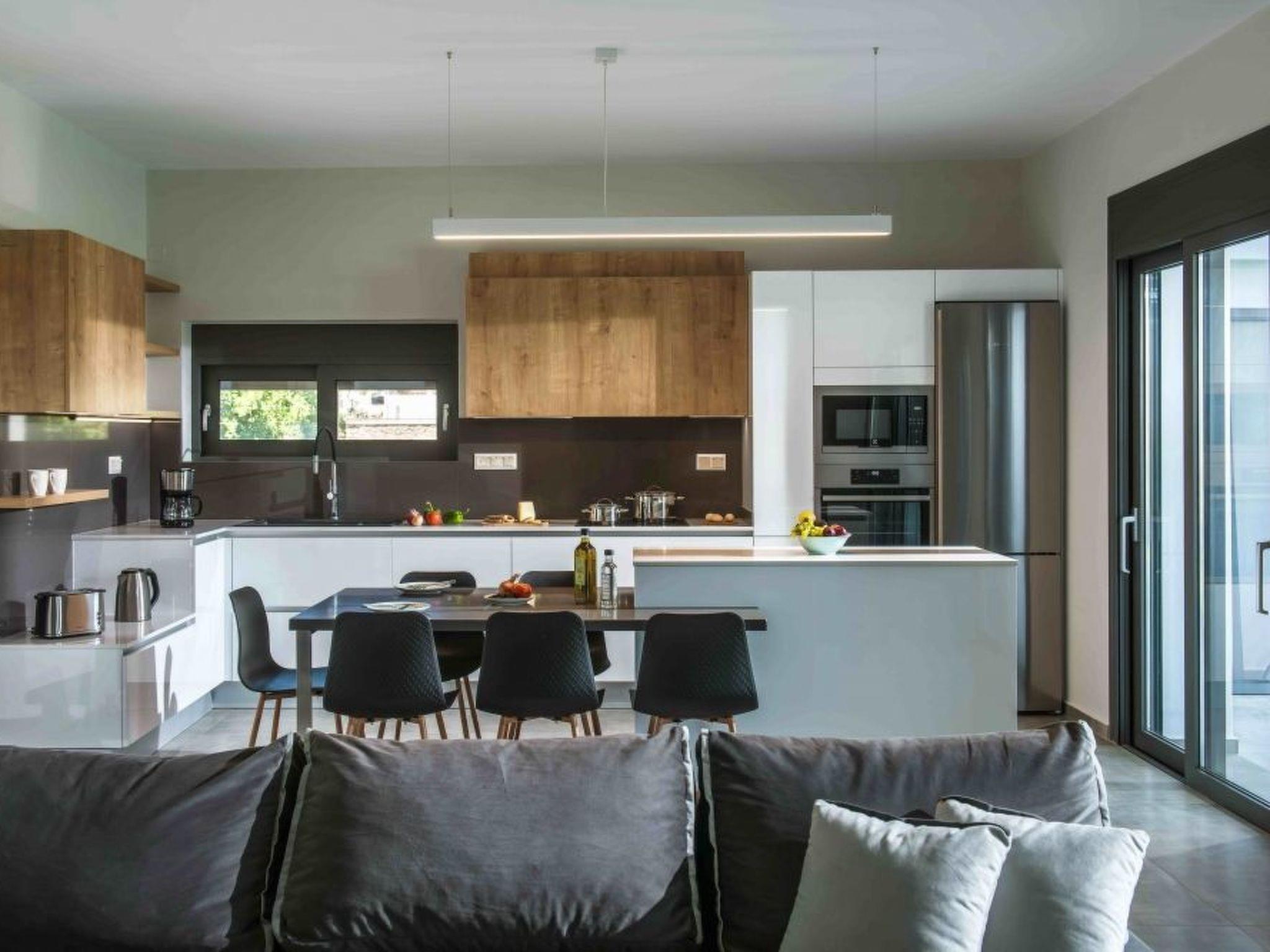 This 150sqm villa was built in 2020 and has a fully equipped kitchen with all modern appliances (electric hob with oven, extractor fan, fridge with integrated freezer, coffee machine, toaster, kettle), together with crockery, glassware and cookware. The kitchen is integrated into a modern furnished dining and living area. On the ground floor there is also a bedroom with a 2 x 2 metre bed and a bathroom with WC and bathtub as well as a utility room with washing machine.