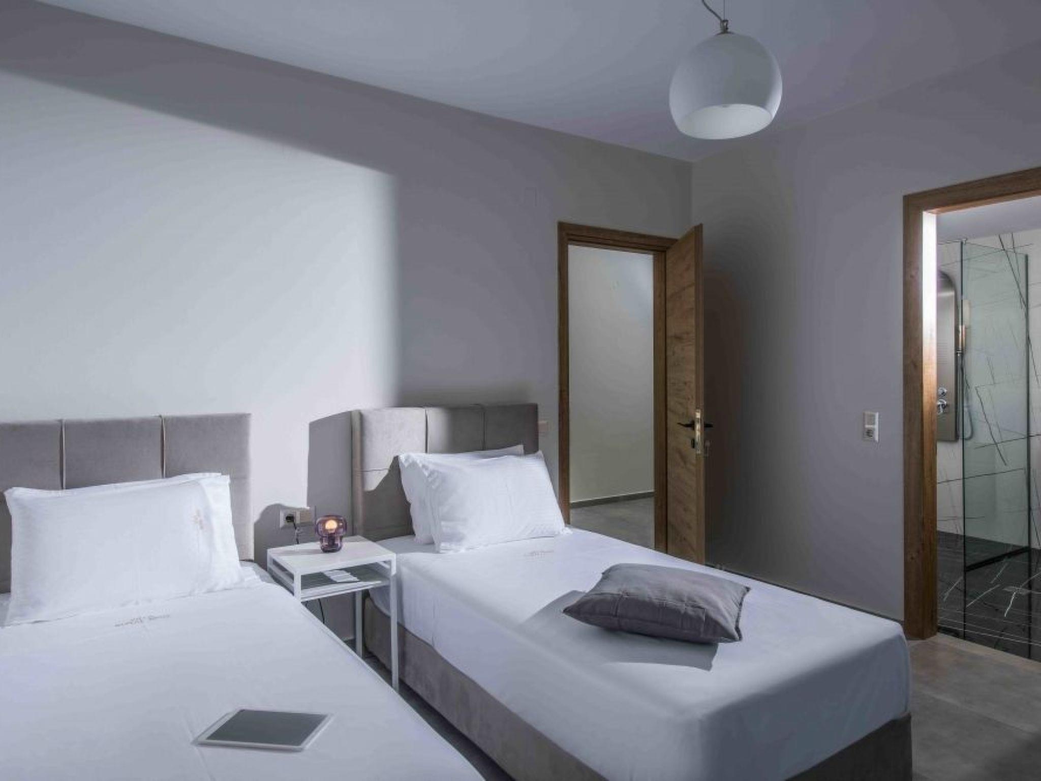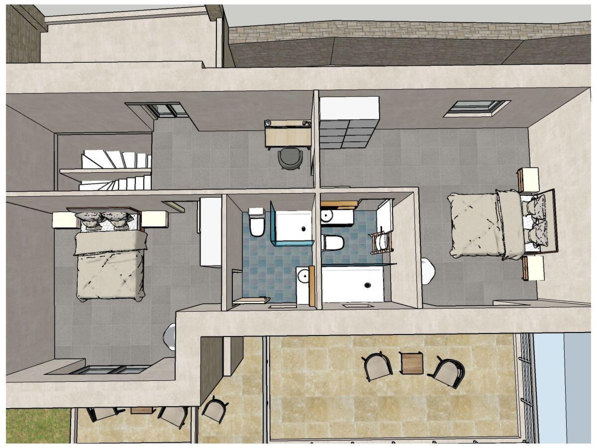 On the first floor there is another master bedroom with its own bathroom (shower, WC) and a second bedroom with two separate beds, which also has its own bathroom (shower, WC).