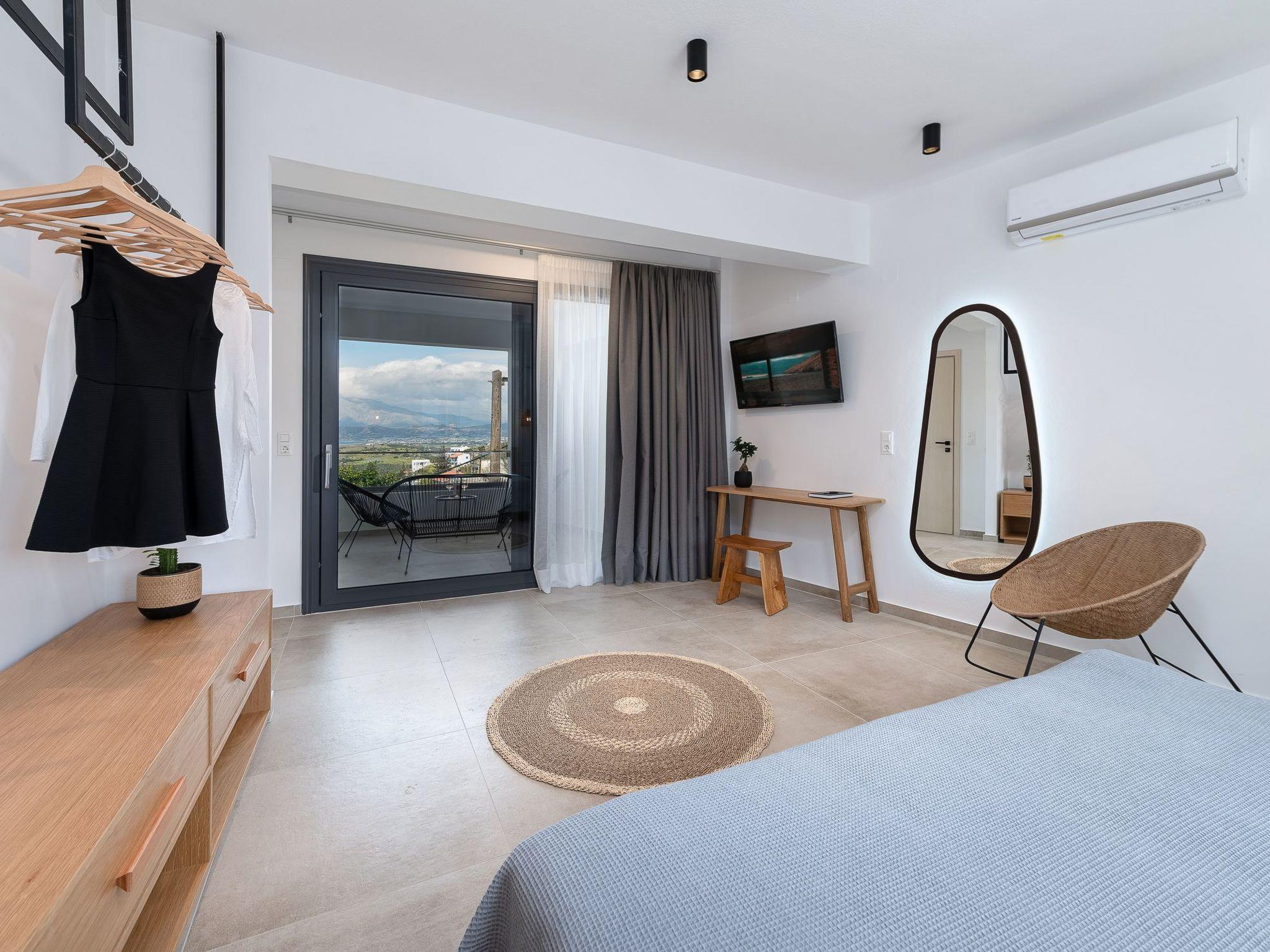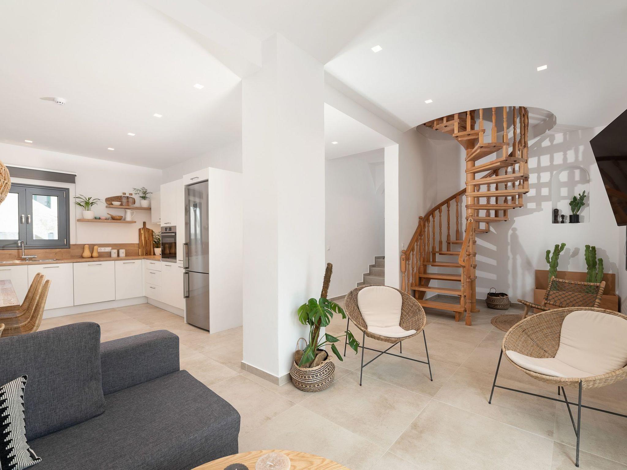 Modern boho style villa with pool for up to 8 people! VILLA Calma 2021! 4 bedrooms, 3 bathrooms, garden with fruit trees, parking for 3 rental cars, on the outskirts of Kamilari in a quiet location with sea views!Fully and comfortably equipped with all the amenities of a holiday villa: SAT-TV, free W-LAN, oven, grill, BBQ, microwave, hairdryer, dishwasher, washing machine - dryer, bed linen, hand-shower-pool towels, bathroom cosmetics, heating, air conditioning, mosquito screen, max. occupancy: 8 persons: 8 personsLiving area with couch, kitchen fully equipped for 8 personsBeds: 4 bedrooms, comfort 2 - layer CocoMat mattresses,Bathroom: 3 bathrooms, shower, WC, washbasin4 SAT-SMART-TV, large swimming pool with sun loungers, suitable for 8 persons, open complete kitchen with dining room and adjoining cosy living room, SAT-Smart-TV. Spiral staircase, 4 bedrooms, 2 en suite shower rooms, 1 shower room on the ground floor, (layout of the bedrooms: 2 bedrooms on the ground floor, separate shower room, laundry room, 2 spacious bedrooms with en suite shower room on the first floor, 1 balcony, 1 terrace, 1 children's play area, sea view of the bay of Messara, view over the village, Psiloritis mountains, large garden, barbecue/fireplace Outdoor living area new in Kamilari, a neighbouring village of Pitsidia and Kalamaki.On the edge of the village in a very quiet side street, 3 private parking spaces, steps to the house not suitable for the disabled, sheltered from view, in a quiet location, large vegetable garden, natural stone border.