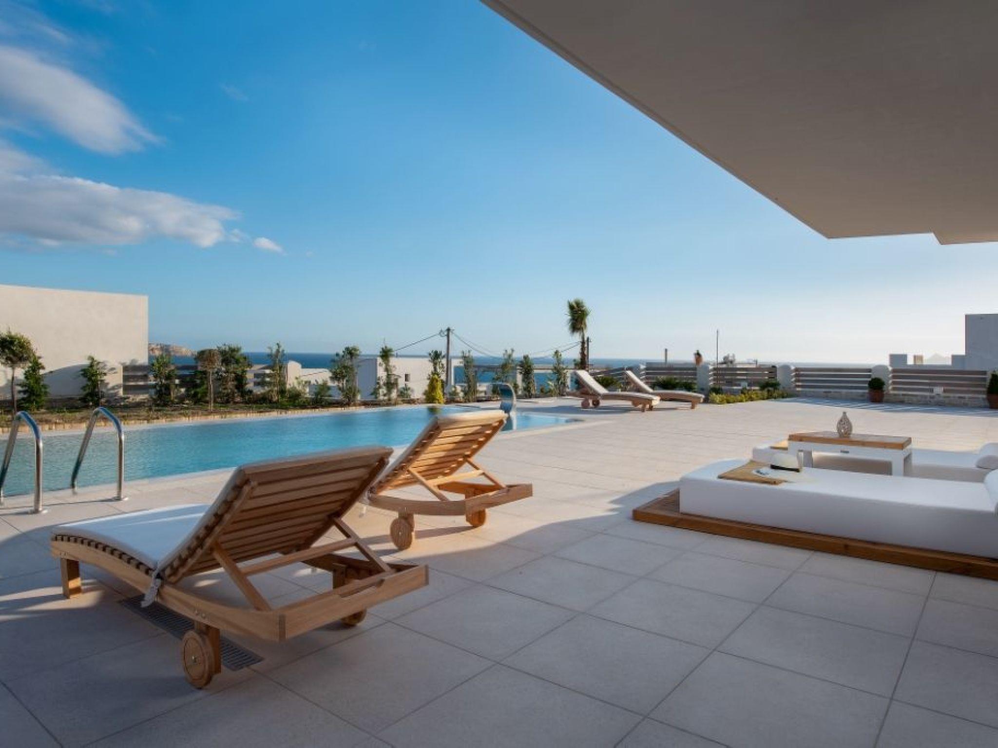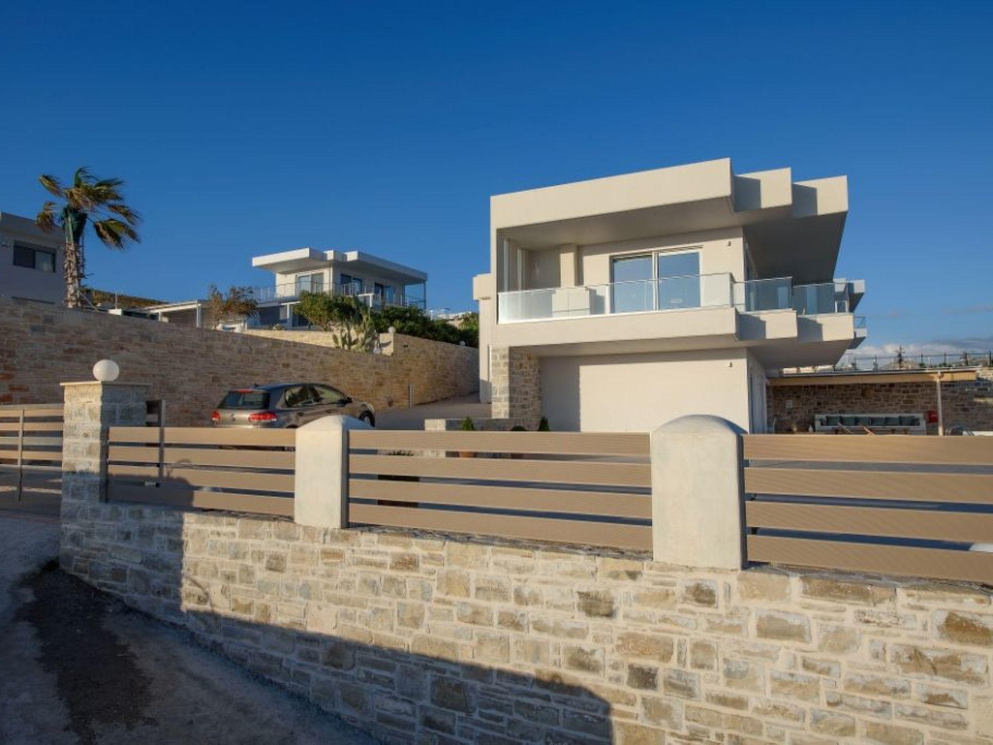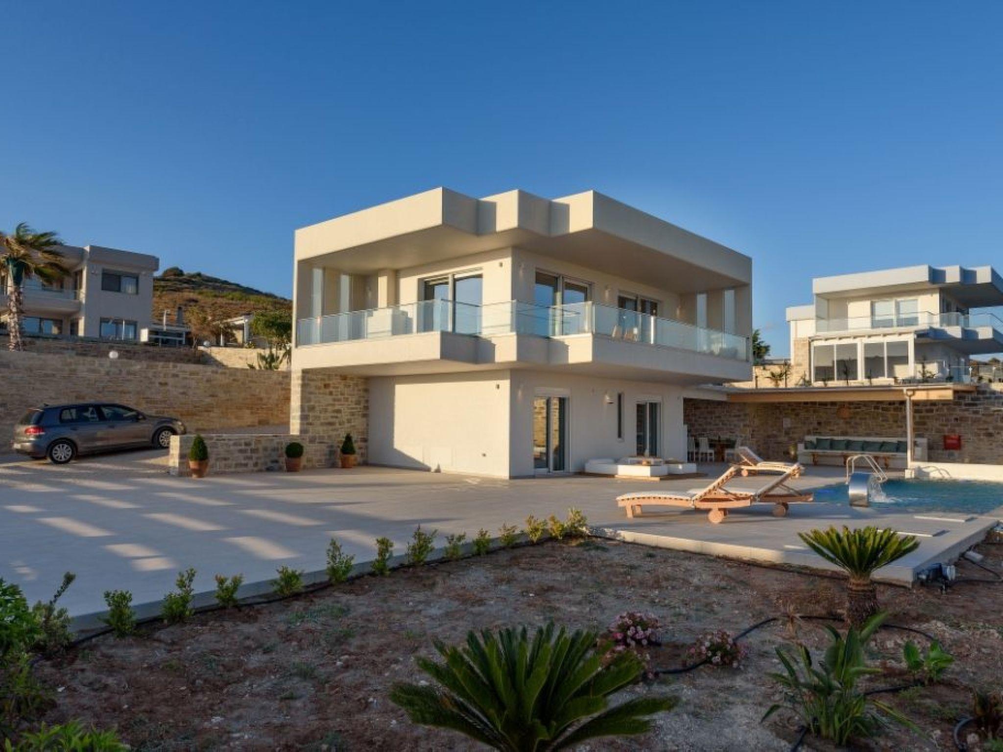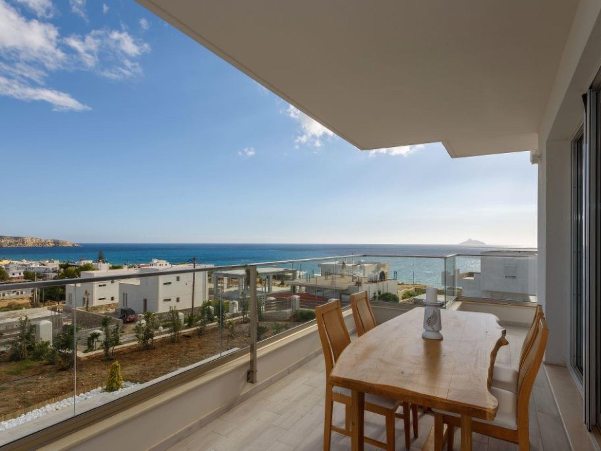 Large panoramic windows offer spectacular views of the Libyan Sea and the Paximadi Islands. If you are a nature lover and long for peace and quiet, this modern villa is the perfect choice for you. The villa, which has an open-plan kitchen/living room, a large sofa bed, 2 airy bedrooms with double beds 1.60 m x 2.00 m, 2 bathrooms and a guest toilet, can comfortably accommodate up to 6 people. The tasteful living area and the fully equipped kitchen with dining area, the large balcony, 43sqm, with seating area and dining table give an unobstructed view of the sea and in the evening of fantastic sunsets.