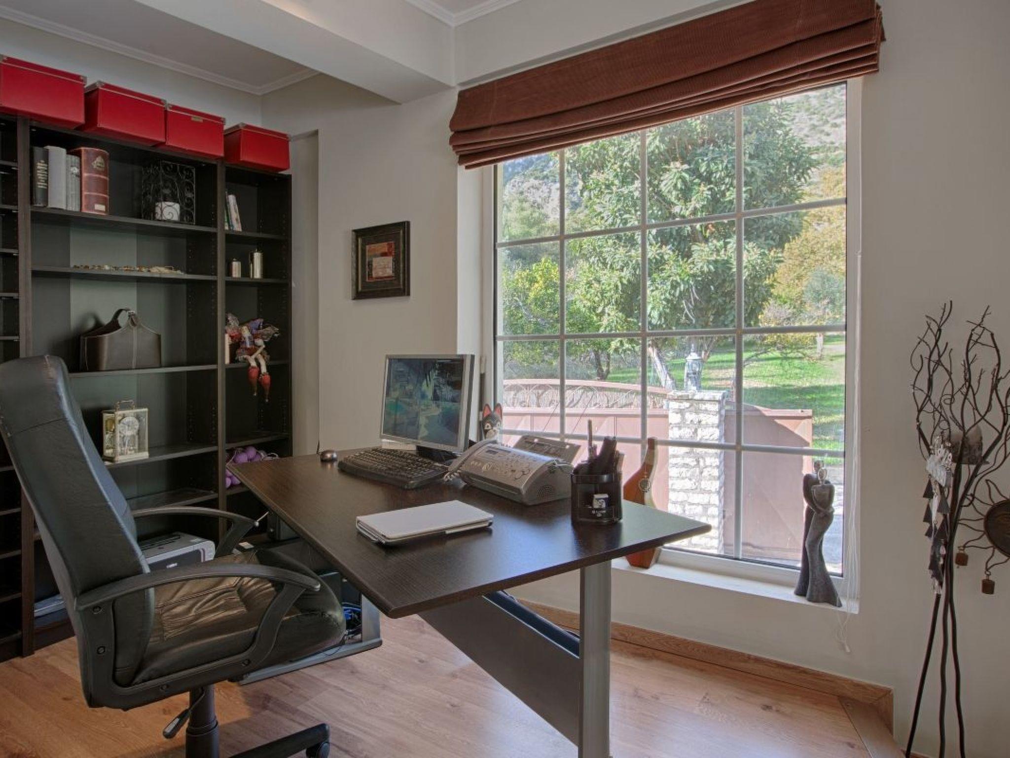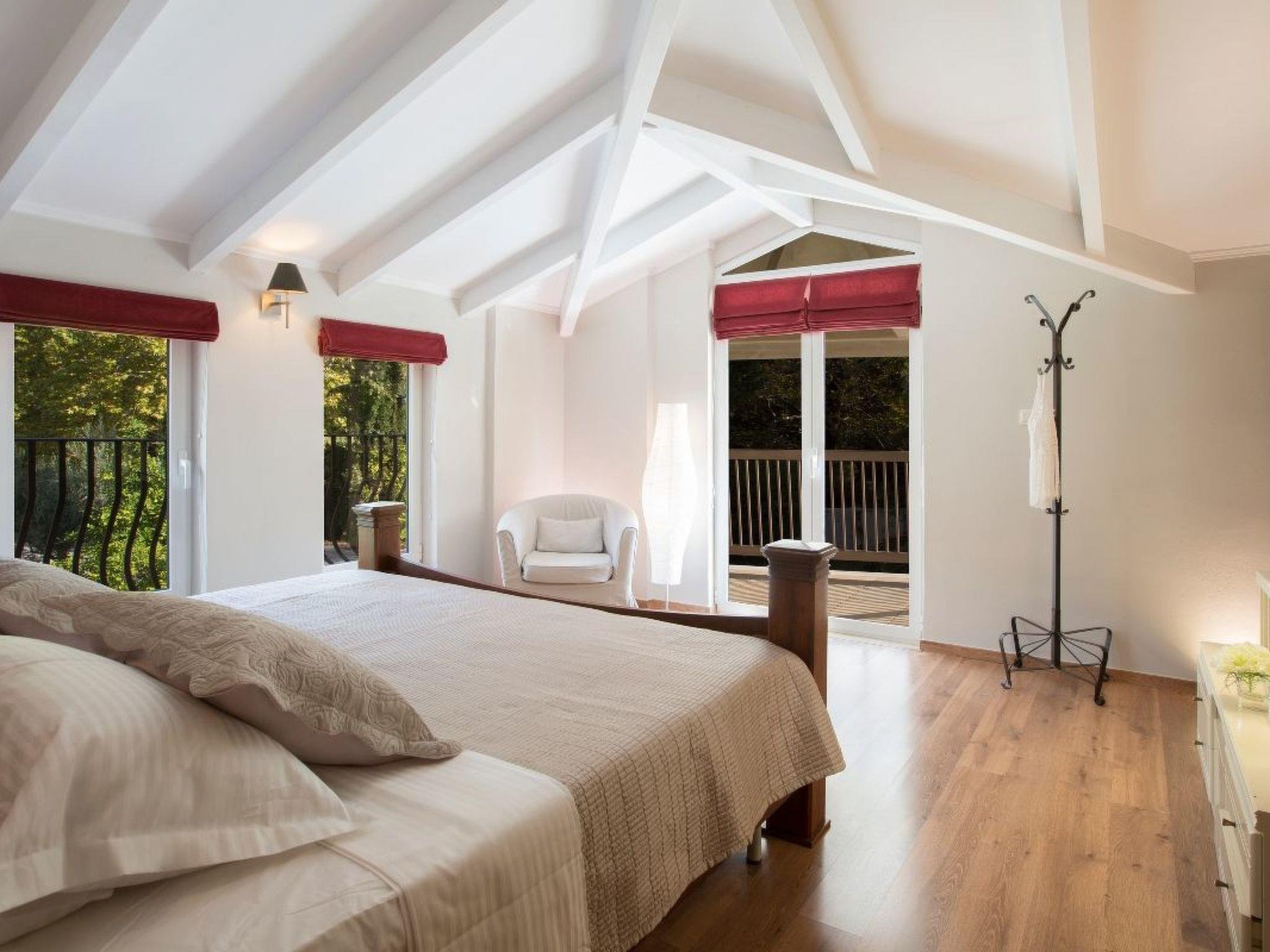 Inside, Villa Rina boasts a captivating classic motif with a touch of rustic charm. A creamy color palette enhances the space, providing a warm and welcoming atmosphere. The spacious, open living room features classic contemporary furnishings, complete with comfortable seating, an elegant fireplace, and sliding doors that invite guests to the terrace. The kitchen is a chef's delight, equipped with a double fridge/freezer, filtered water, ice-maker, and a curved breakfast bar for casual dining. The setting is complemented by an open office space on the first floor, offering privacy and tranquility beside a large mullioned window that allows for ample natural light.