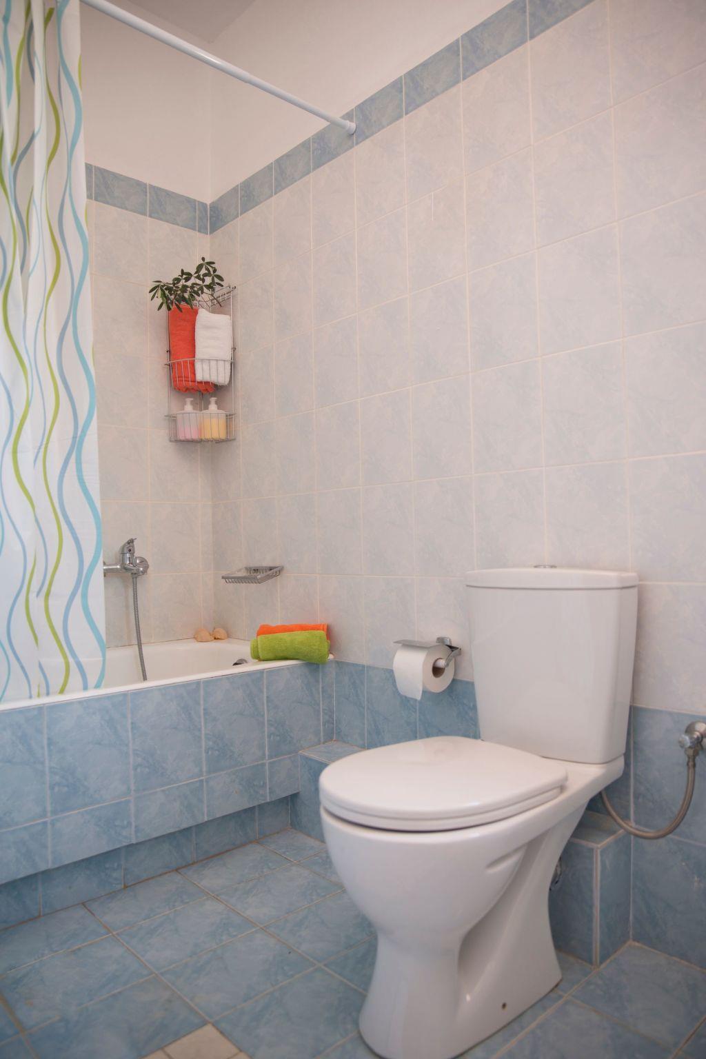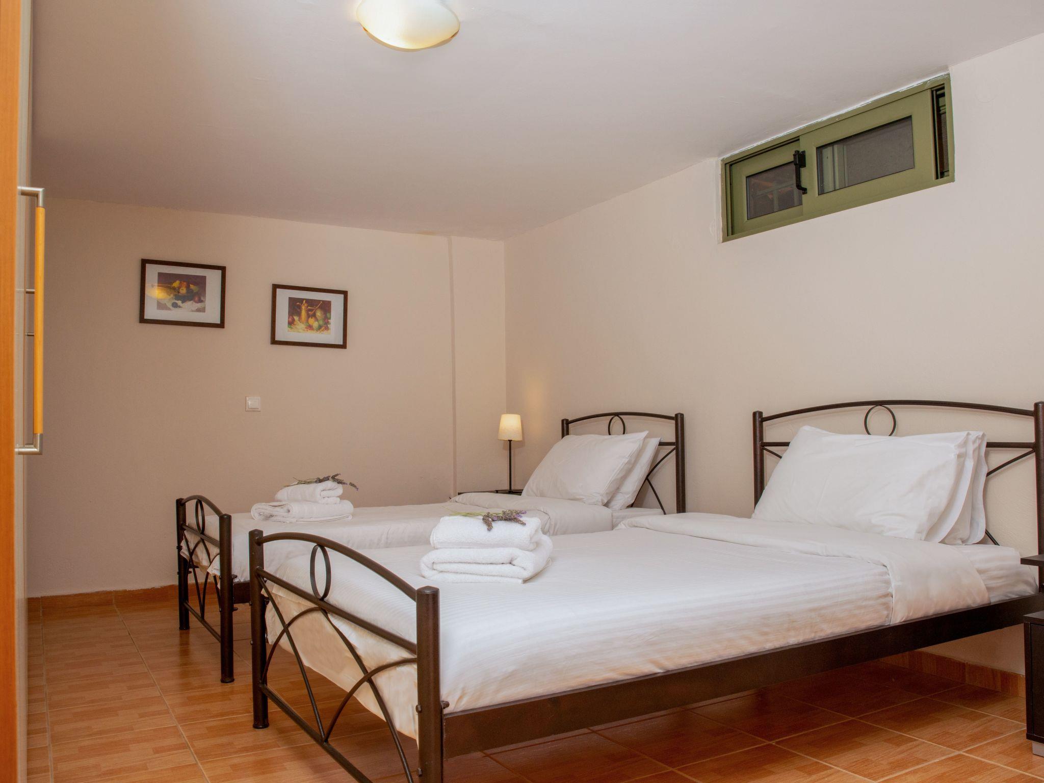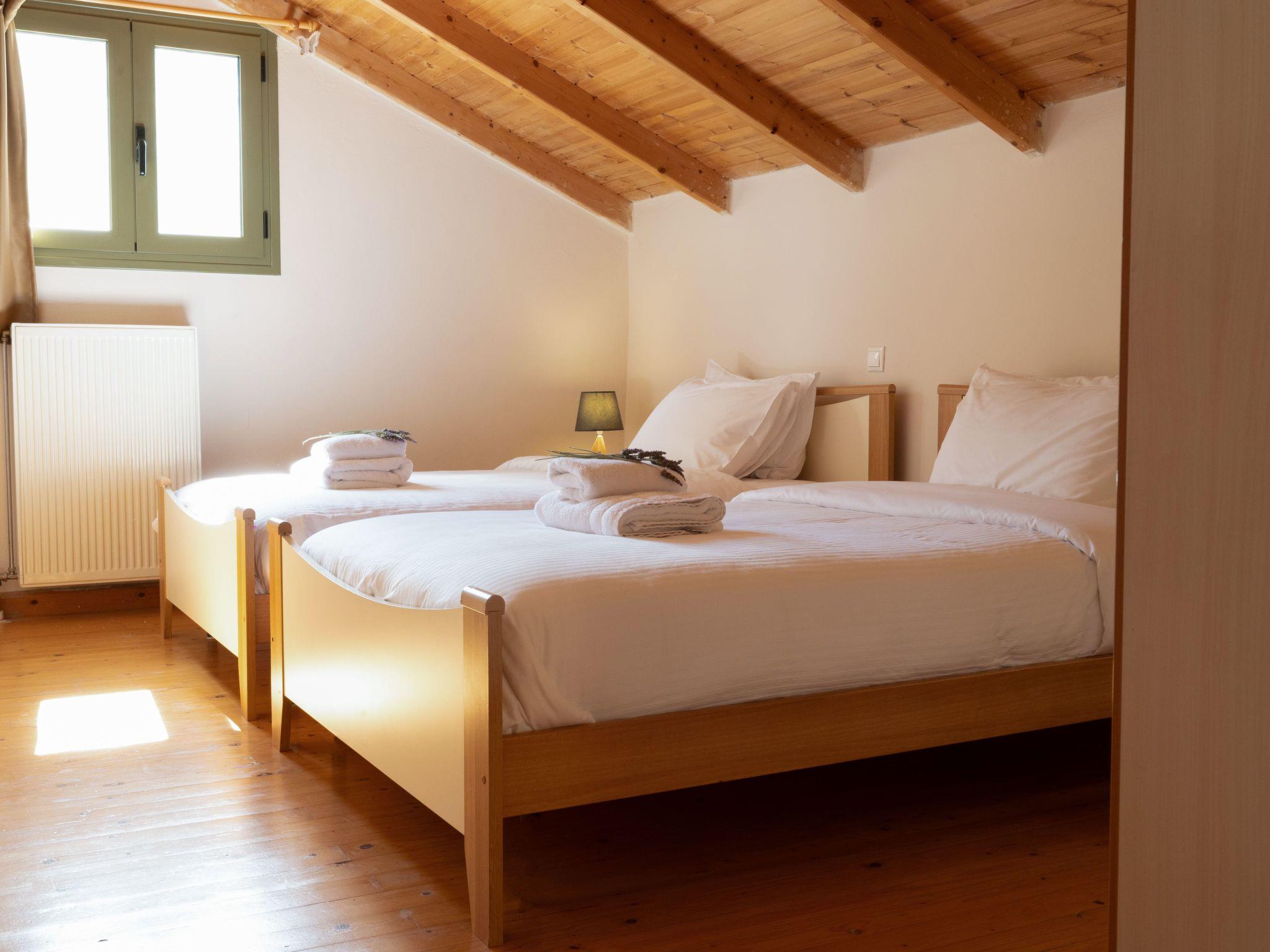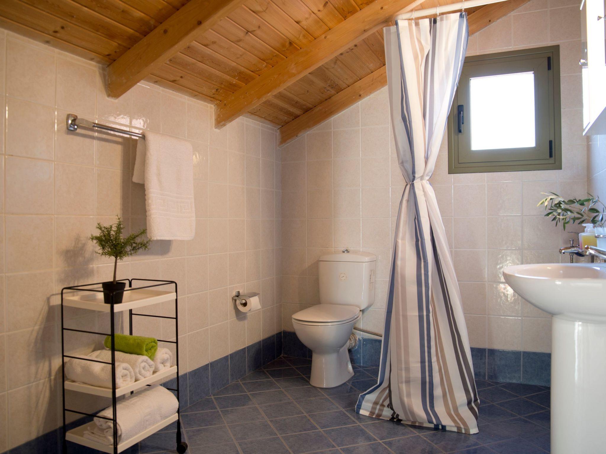 The ground floor is about 50 m² in size and comprises of the following rooms: A living room with a fireplace, a flat screen TV, a big sofa and chairs. There is also a fully-equipped kitchen with an oven, microwave, coffee machine, fridge and a dining area, as well as a bathroom with a bath tub. A marble staircase leads to the first floor, which includes: one big bedroom with double bed and one more with two single beds. The floor is complemented with a bathroom with shower. There is also a 3rd bedroom with two single beds at the basement of the house, which can be accessed from the ground floor. There is central heating and AC for all the rooms, except the 3rd which is the coolest and has a fan.