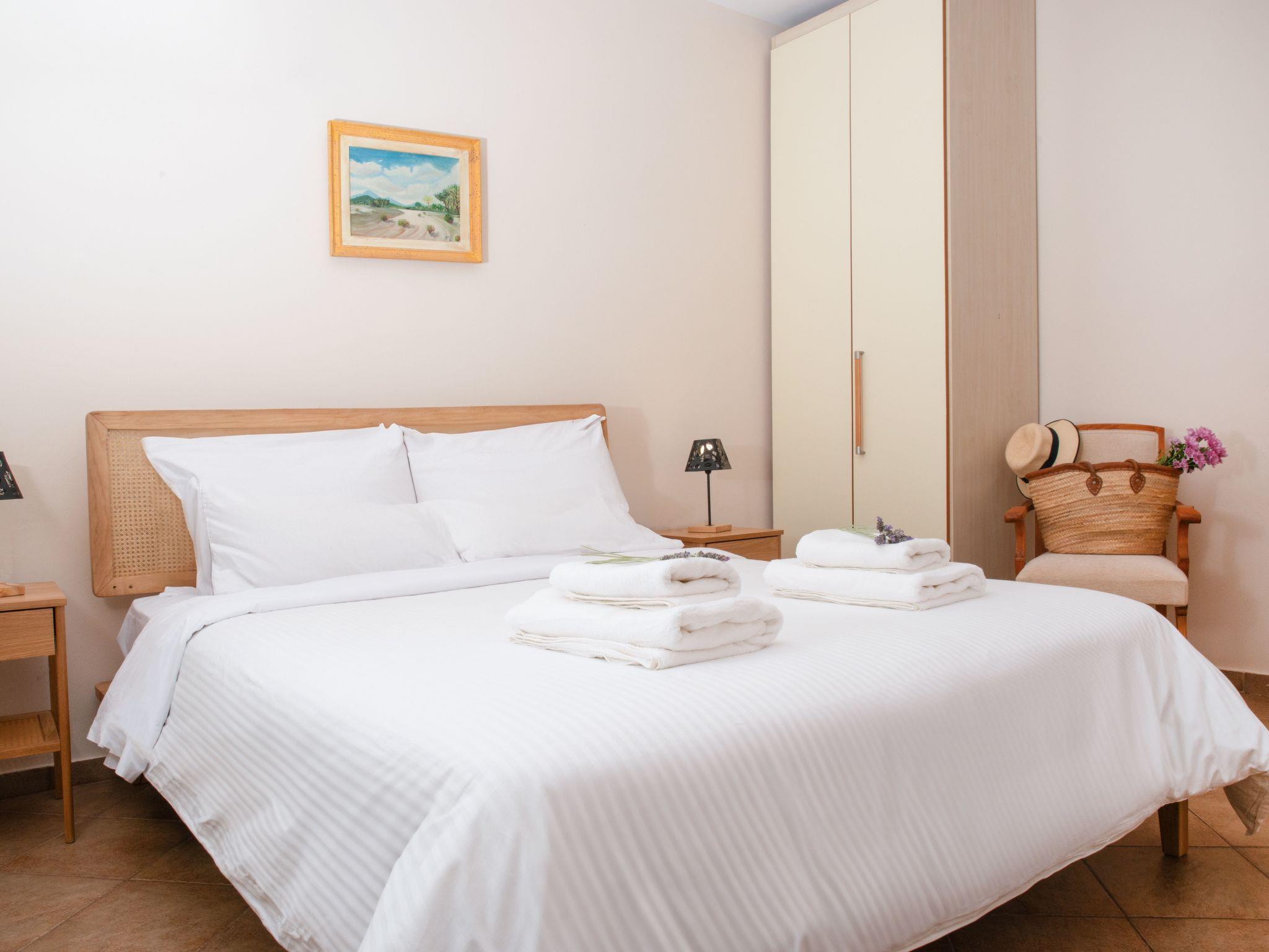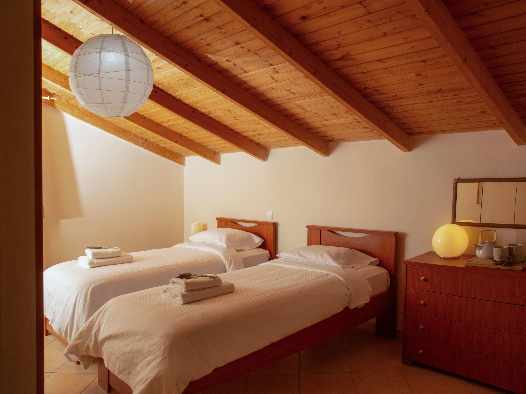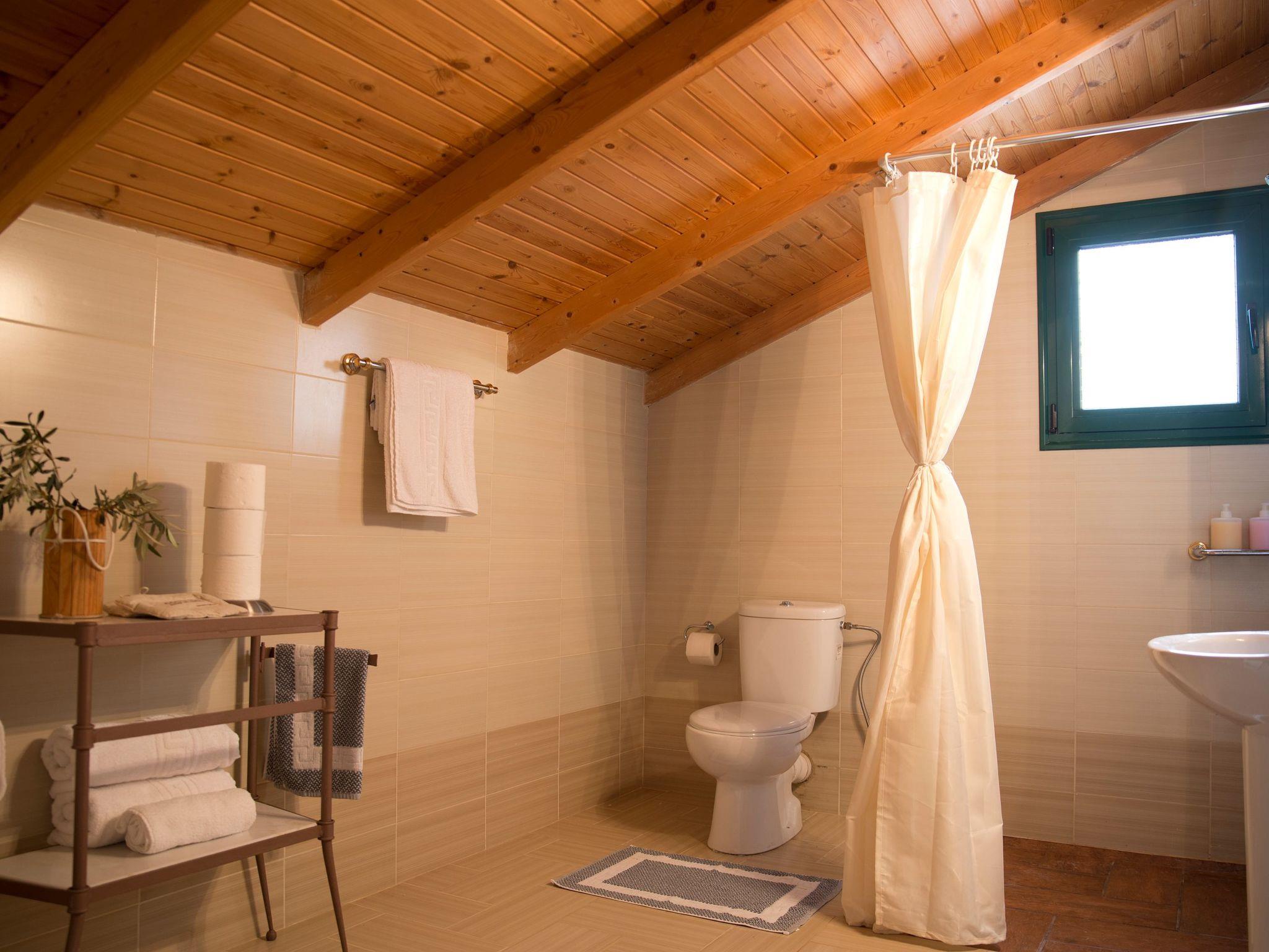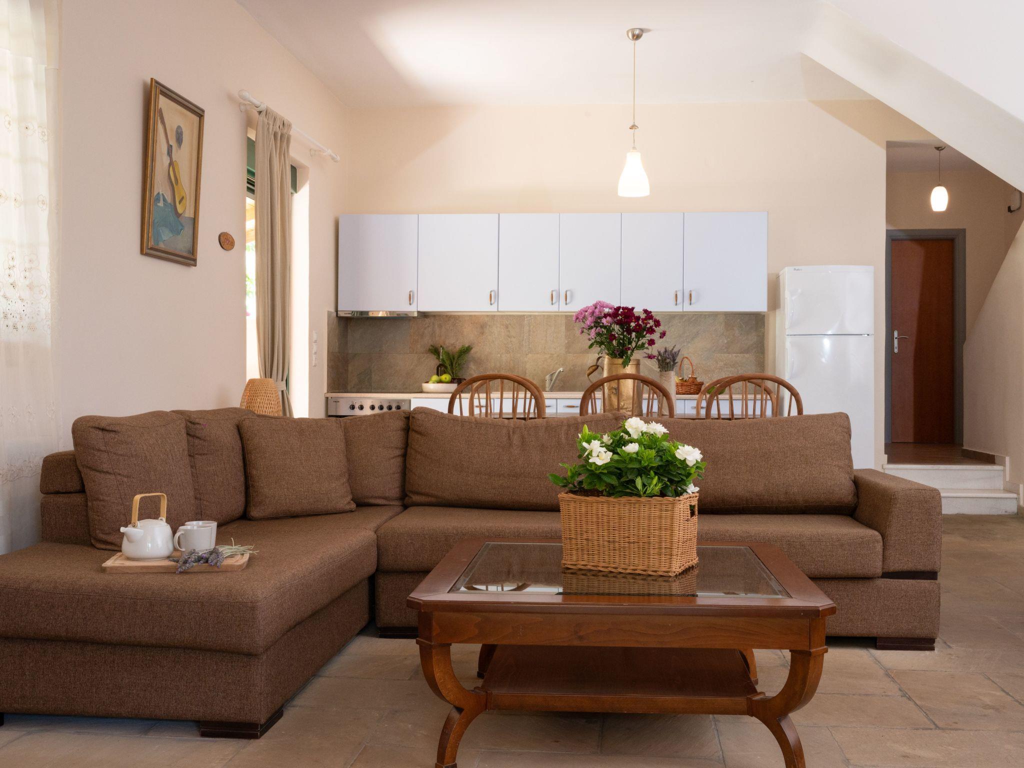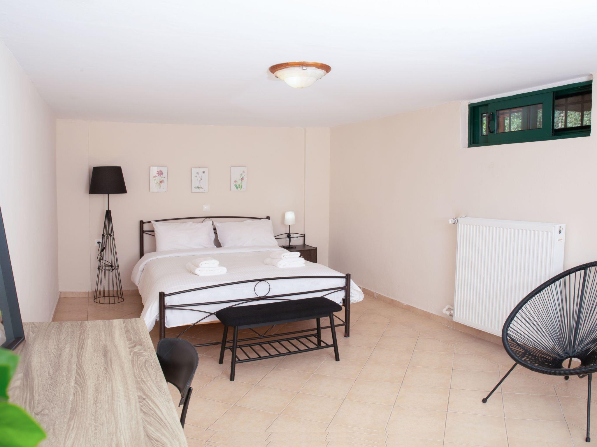 The ground floor is about 55 m² in size and comprises of the following rooms: A living room with a fireplace, a flat screen TV, a big sofa and chairs. There is also a bedroom next to it, which includes a double bed. Plus there is a fully-equipped kitchen with an oven, microwave, coffee machine, fridge and a dining area, as well as a bathroom with a bath tub. A marble staircase leads to the first floor, which includes: one big bedroom with double bed and one more with two single beds. The floor is complemented with a bathroom with shower. There is also a 4th bedroom with double bed at the basement of the house, which can be accessed from the ground floor. There is central heating and AC for all the rooms, except the 4th which is the coolest and has a fan.