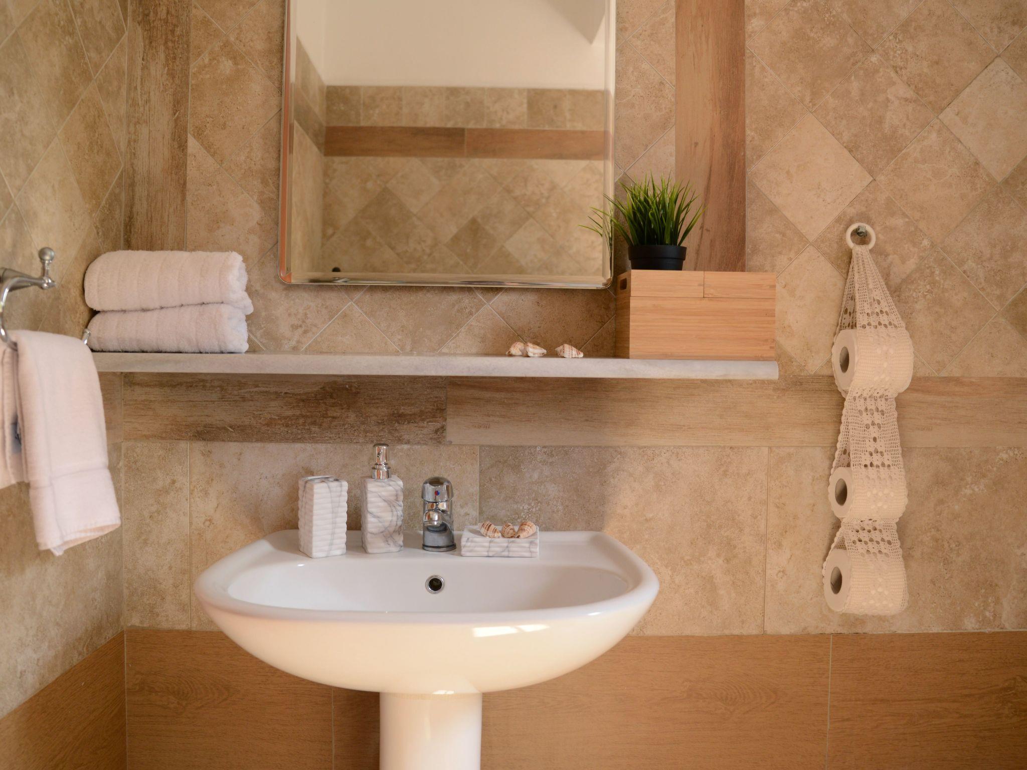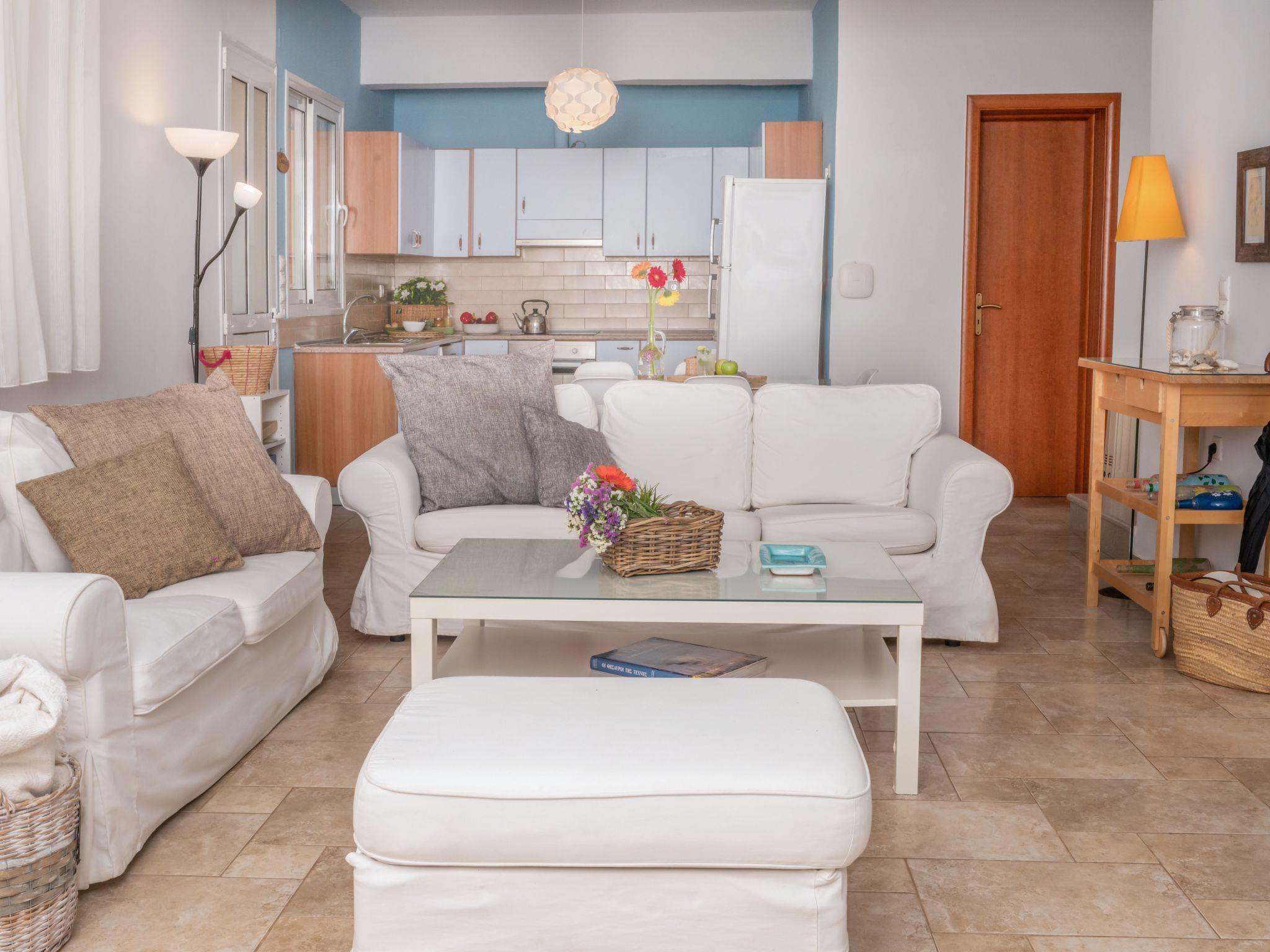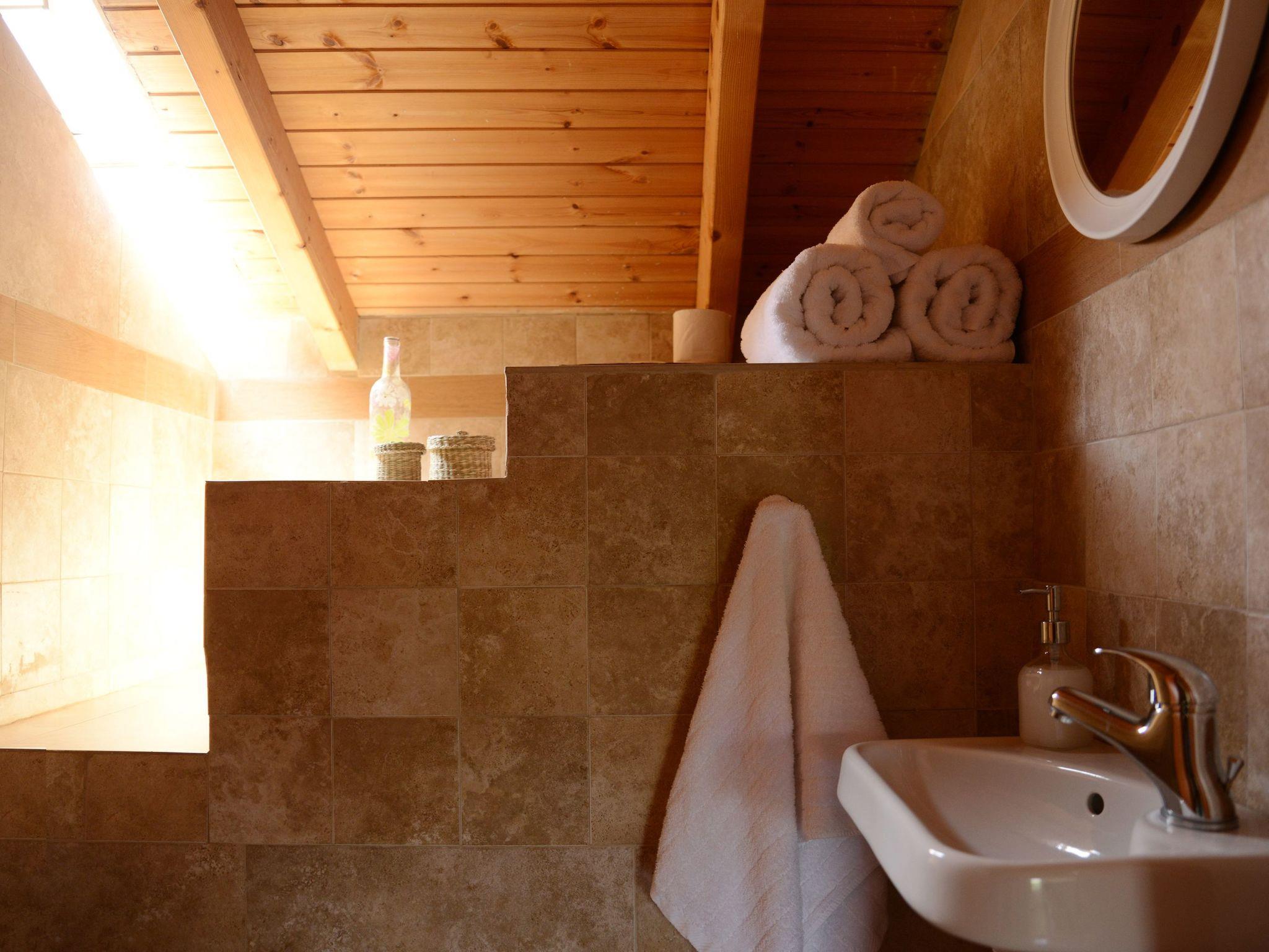 The ground floor is about 50 m² in size and comprises of the following rooms: A living room with a fireplace, a flat screen TV, a big sofa and chairs. There is also a fully-equipped kitchen with an oven, microwave, coffee machine, fridge, dishwasher and a dining area, as well as a bathroom with a shower. A marble staircase leads to the first floor, which includes: two separate bedrooms with double beds. The floor is complemented with a bathroom with shower and one extra toilet. There is also a 3rd bedroom with three single beds at the basement of the house, which can be accessed from the ground floor. There is central heating and AC for all the rooms, except the 3rd which is the coolest and has a fan.