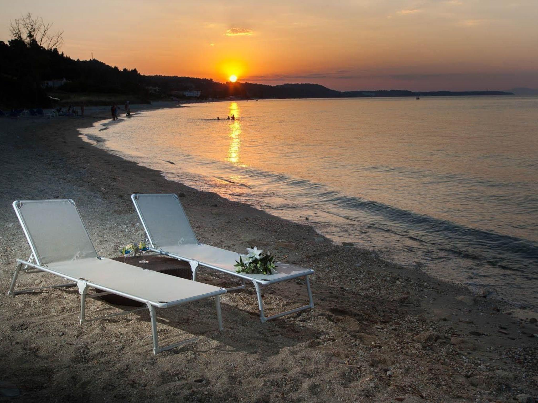 You are in a place where you can enjoy the sea breeze and the best Mediterranean climate. With private access to the beach, direct location to the crystal-clear bay with sunrises and sunsets, surrounded by idyllic countryside and several cycling and hiking trails. The ideal retreat from the hustle and bustle of modern life. Would you prefer to enjoy nature rather than water sports such as water skiing or windsurfing? You can still have a wonderful time in the area surrounding your accommodation, mountain biking, cycling tours, hiking, golf, mini golf, bowling, and so on. In general, you can see, hear, smell, taste and feel Greek culture in Halkidiki. When travelling around the peninsula, you can hardly get enough of the visual attractions that the natural landscape has to offer. Green pine forests alternate with golden flat sandy beaches, green meadows with olive and pistachio trees, steep coasts with extensive vineyards. You will be accompanied by the scent of herbs from the lush vegetation, birdsong and fresh, iodised sea air. For history buffs, there are also numerous museums, archaeological sites and artefacts to explore to familiarise you with ancient Greek culture. Take a trip to Kassandra, where the traditional market takes place, to Meteora, to the Pella theatre and open-air concert, to the ancient archaeological site of Olynthos or to the famous cave in Petralona. Also worth a visit is Athitos, a newly awakened traditional stone-built village with cobbled alleyways and marvellous panoramic spots and bathing bays. The town centre is approx. 700 m away on foot for shopping facilities.