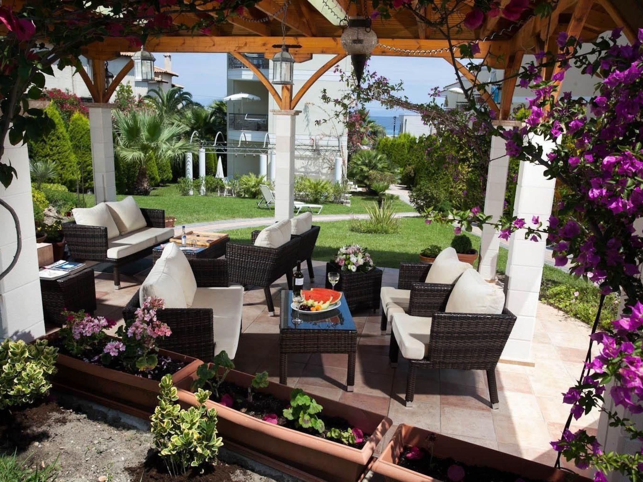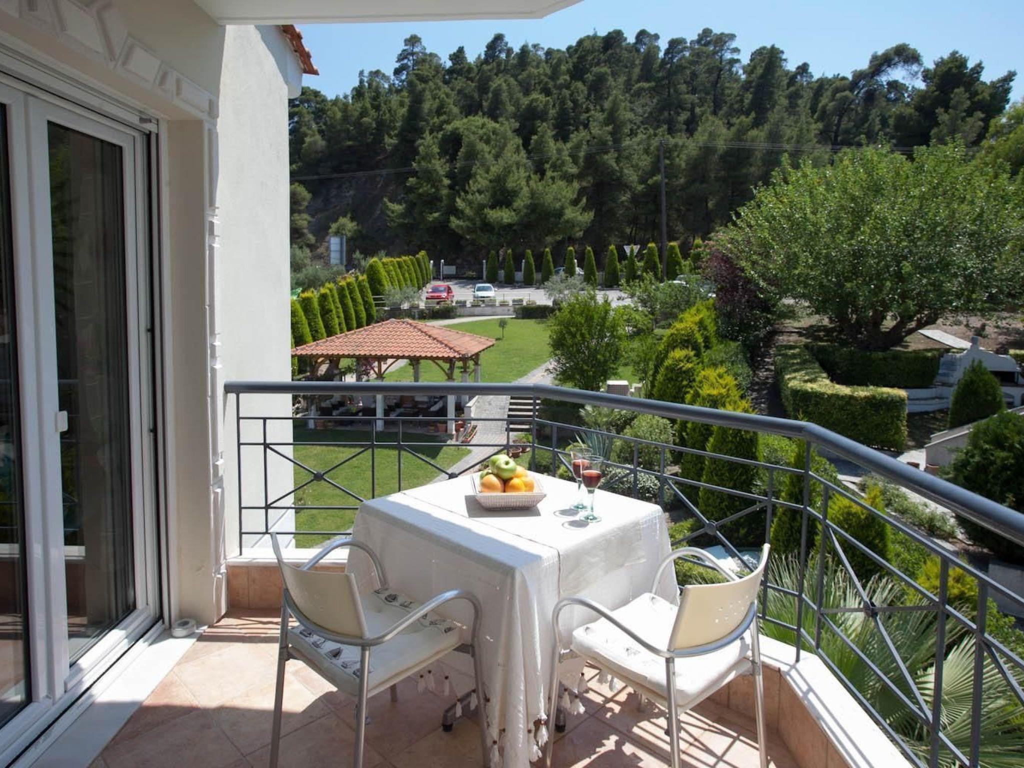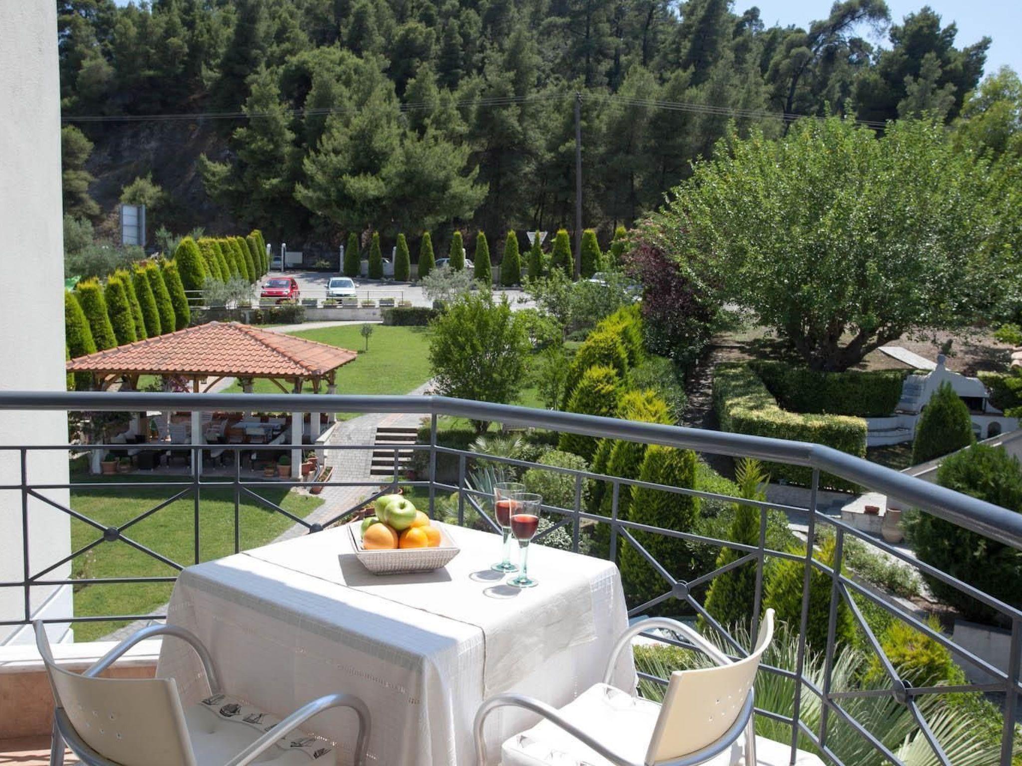 A park-like garden welcomes you with spacious grassy areas as well as cypresses, shrubs and palm trees. A large pergola and an outdoor barbecue invite you to eat and enjoy al fresco dining. Enjoy the beautiful weather on the communal terrace. The terrace is equipped with garden furniture, parasol and some garden loungers. The view of Mount Athos and the whole of Halkidiki is indescribable. The property is fenced. Enjoy the surroundings, the view of the garden and the beautiful weather on your own balcony with garden furniture.