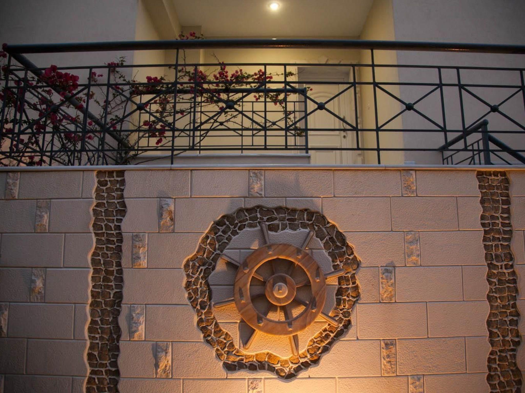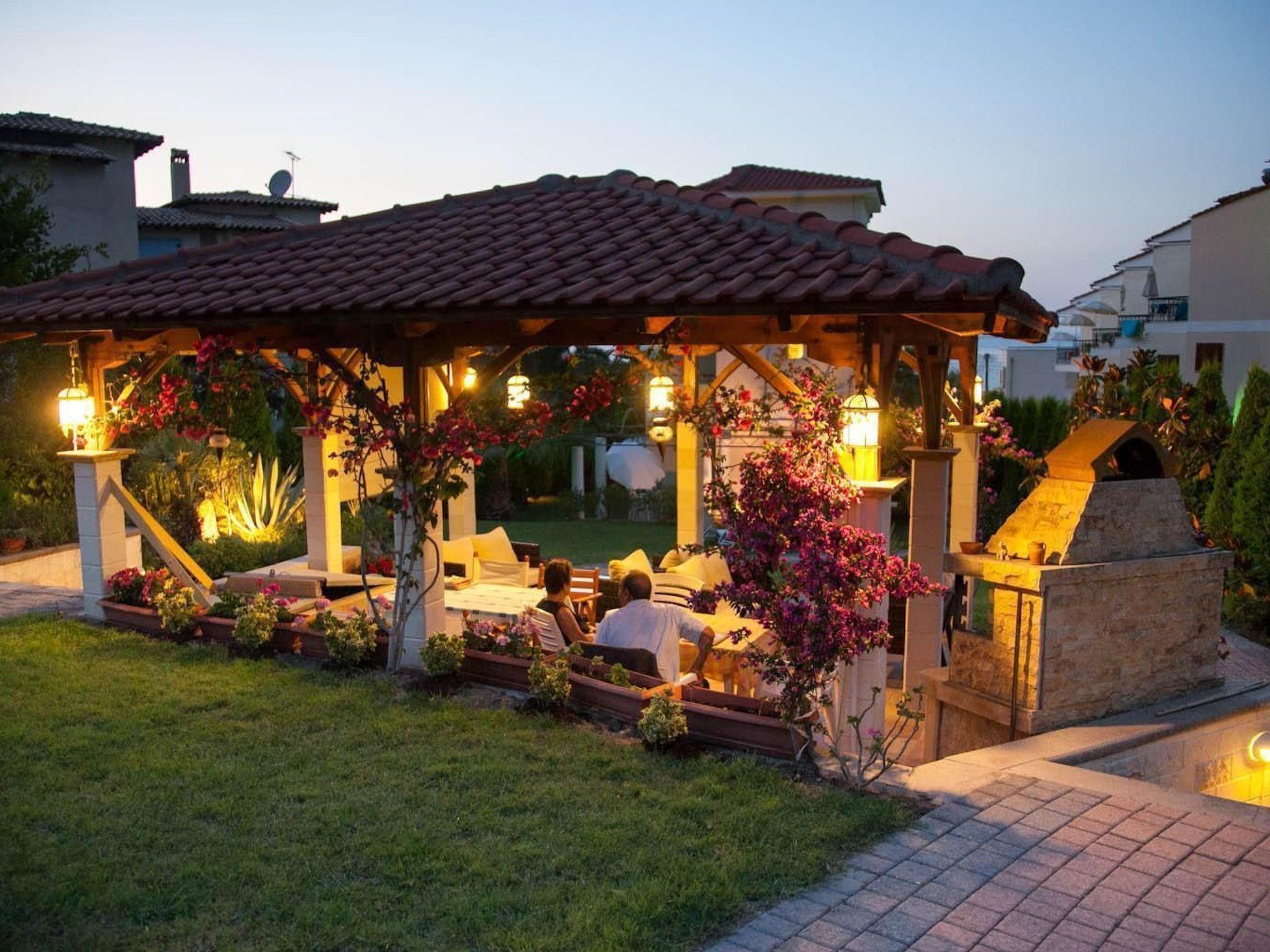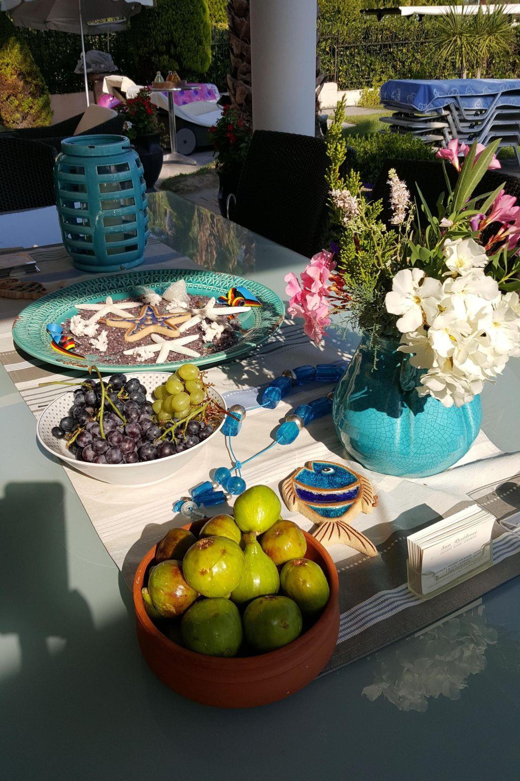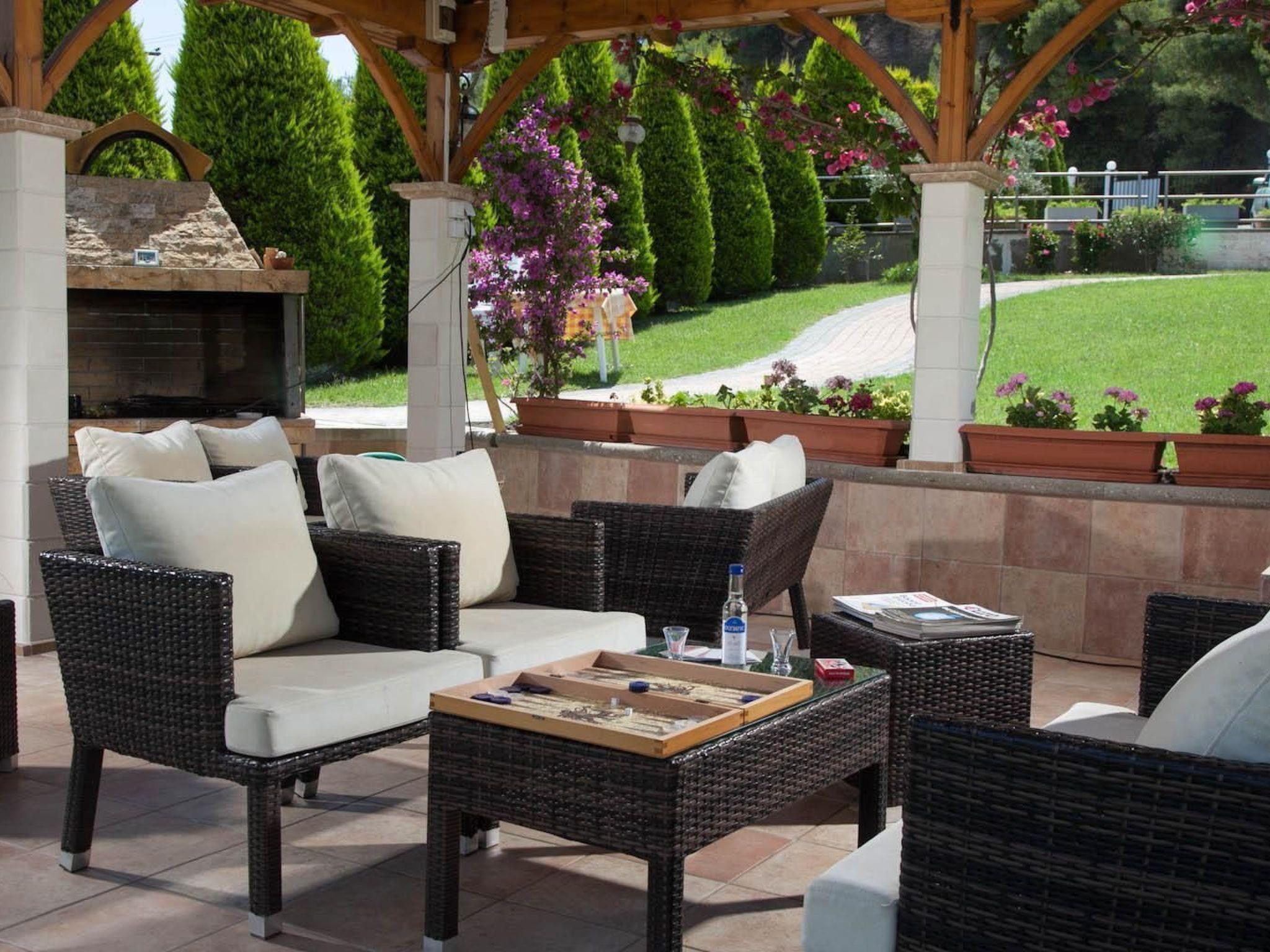 A park-like garden welcomes you with spacious grassy areas as well as cypresses, shrubs and palm trees. A large pergola and an outdoor barbecue invite you to eat and enjoy al fresco dining. Enjoy the beautiful weather on the communal terrace. The terrace is equipped with garden furniture, parasol and some garden loungers. The view of Mount Athos and the whole of Halkidiki is indescribable. The property is fenced. Enjoy the surroundings, the view of the garden and the beautiful weather on your own balcony with garden furniture.