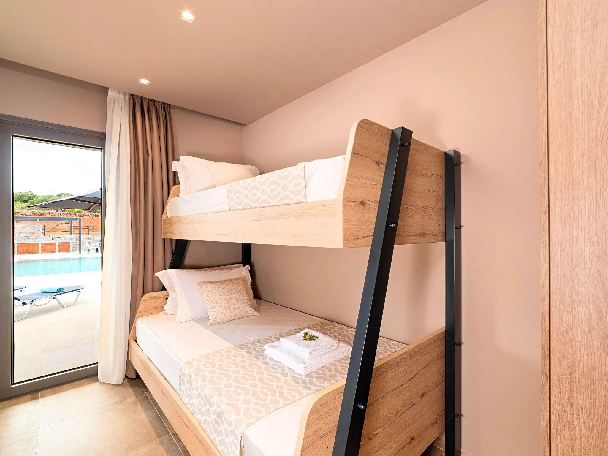 Ground floor* A bedroom with two single pushed together beds and private bathroom.* A bedroom with two single pushed together beds and private bathroom Upper floor* A living room with a large corner sofa (can accommodate two beds) and direct access to the terrace and the pool area.* Smart TV at the living room* Large Kitchen / dining area with an oven, a fridge, a coffee maker, tea facilities, a juicer, a toaster and a dish set.* A bedroom with a queen-size double bed. * A second bedroom with two single beds pushed together. * A third bedroom with a two bunk beds. * A large bathroom with shower.* Washing machine / Dryer* Large terrace overlooking the swimming pool* Air-conditioning in all areas.* Free WiFi internet access.* Outdoor dining set (table with chairs).* Iron and ironing board.* Safe deposit box.* Hair dryer.* Linen and towels.* Toiletries.* Swimming pool towels.* Baby cot.* High chair for children.* Towels and bed linen changed and cleaned every 3 or 4 days.* Private parking area.* Direct access to the swimming pool area.* Private swimming pool.* Sun lounge area with sun beds and umbrellas.* BBQ with cooking and dining area next to the swimming pool.Alpha Sissi Lux Villa can accommodate up to 12 guests.Guests of Alpha Sissi Lux Villa can also be provided with the following services, upon request and at extra cost:* Daily cleaning.* Daily linen and towel change.* Daily swimming pool cleaning.* Car rental service.* Transfer service.* Travel services.* Daily delivery of groceries.* Water sports.* Yacht cruises.* Babysitting.