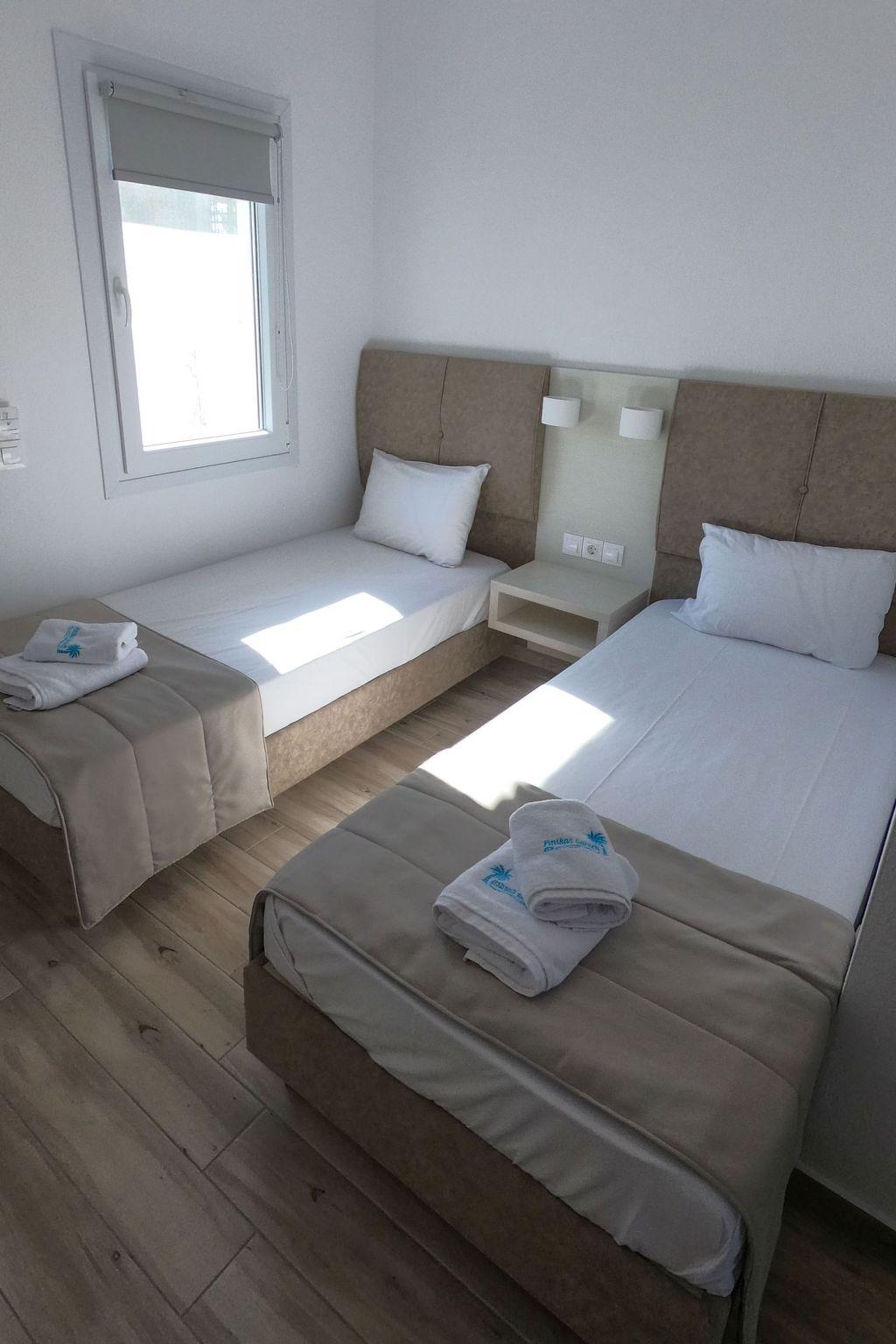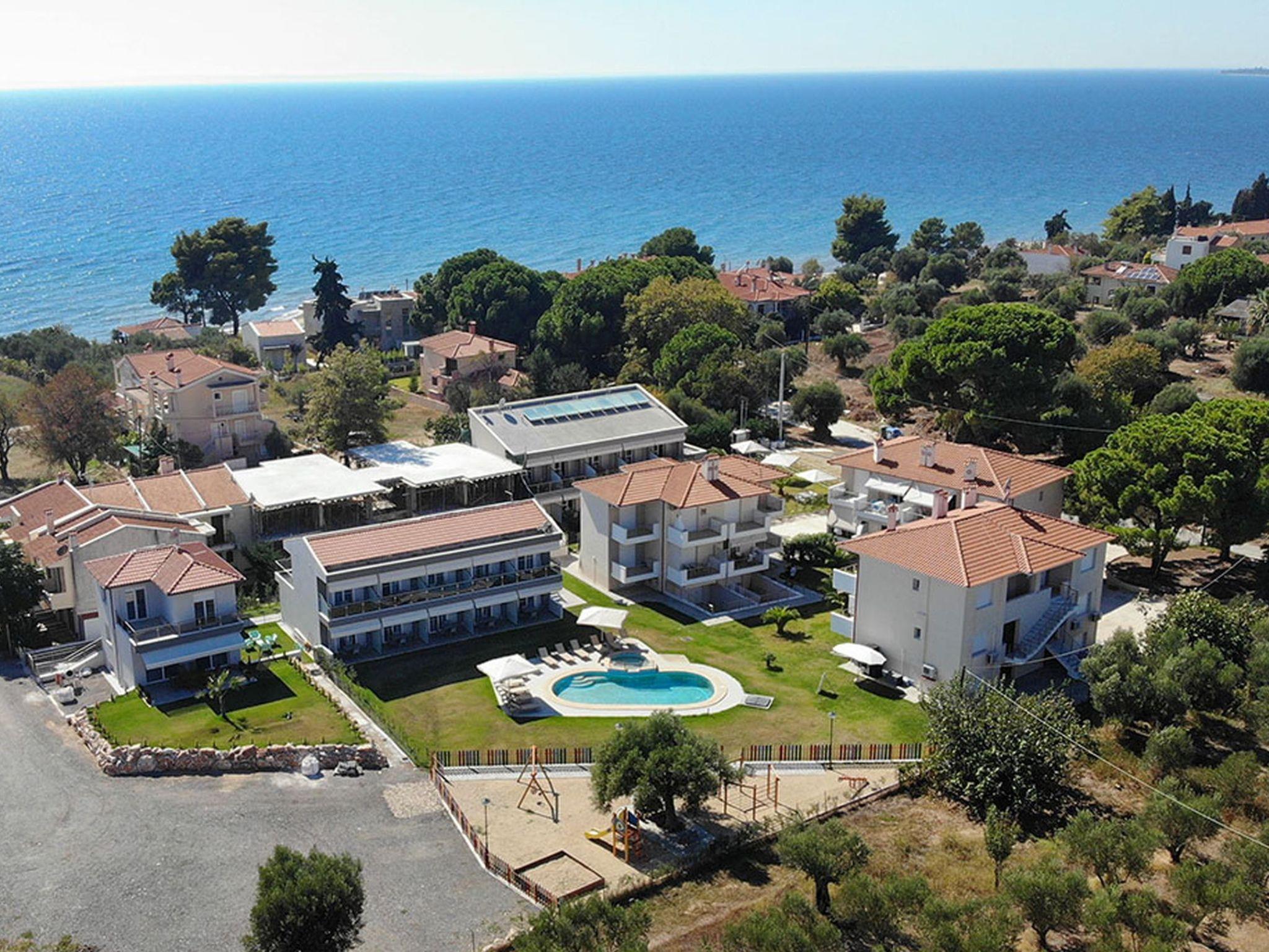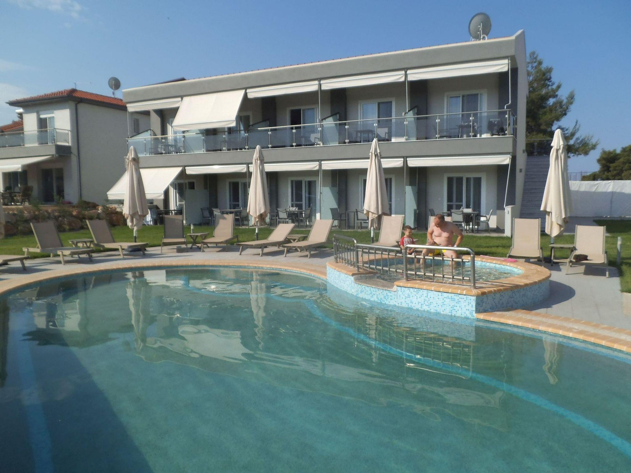 Finikas Garden Suites with garden, communal pool and children's playground The beach resort, built in 2018, is located in a green oasis with olive trees and palm trees. The luxuriously furnished flats with double bed and 2 single beds, kitchen, bathroom, large terrace or balcony can accommodate up to 4 people. The beach is only 150 metres away. Tavernas, cafeterias and shopping facilities are within walking distance. The marina and the centre of Nikiti Beach are 600 metres away. The large beach promenade of Nikiti invites you to take long walks in the evening. The resort is ideal for families with children, due to its quiet location, the swimming pool with children's area and the large children's playground. All infrastructural facilities are within walking distance.