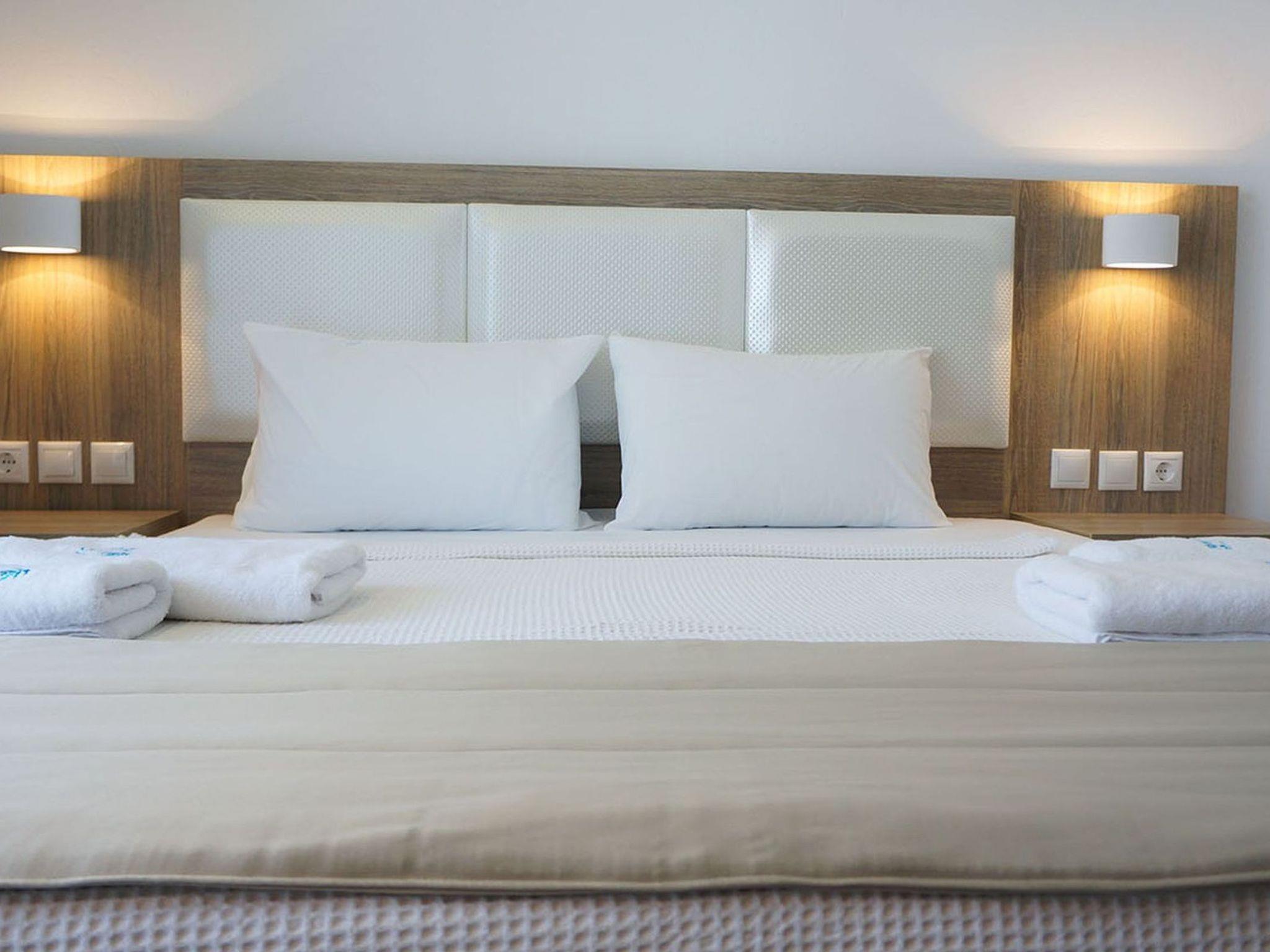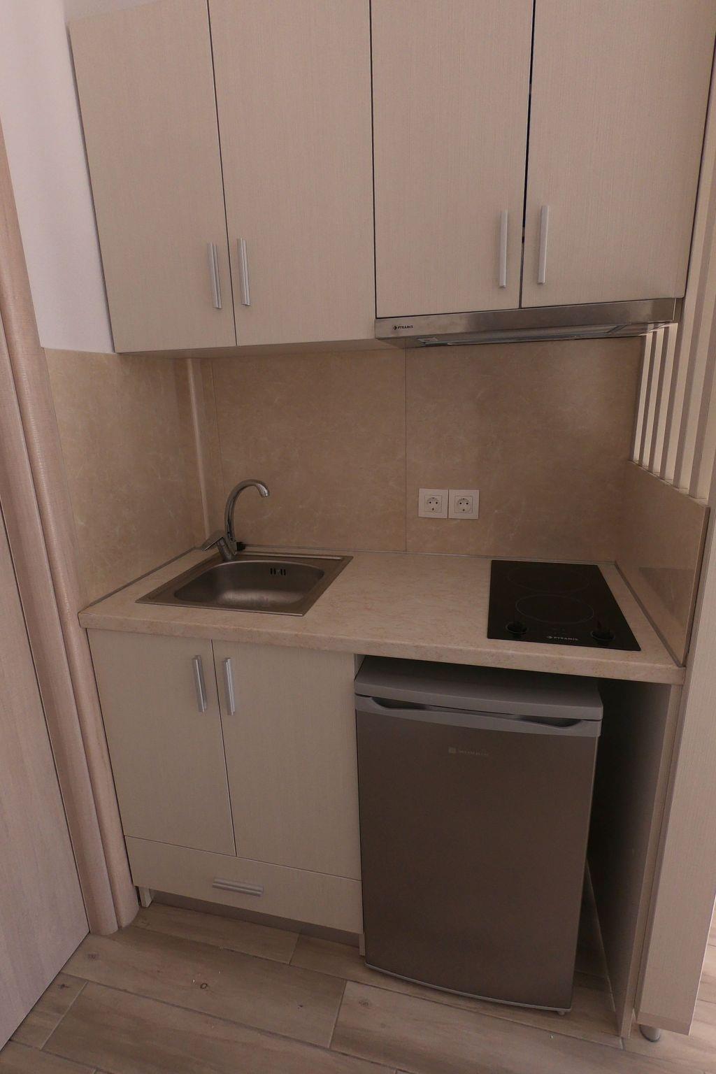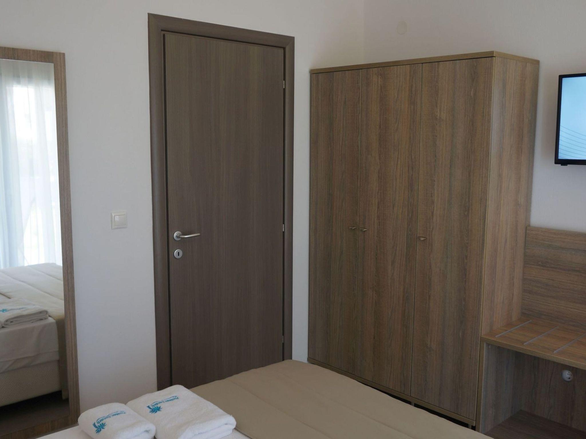 Finikas Garden Suites with garden, communal pool and children's playground The beach resort, built in 2018, is located in a green oasis with olive trees and palm trees. The luxuriously furnished flats with double bed and 2 single beds, kitchen, bathroom, large terrace or balcony can accommodate up to 4 people. The beach is only 150 metres away. Tavernas, cafeterias and shopping facilities are within walking distance. The marina and the centre of Nikiti Beach are 600 metres away. The large beach promenade of Nikiti invites you to take long walks in the evening. The resort is ideal for families with children, due to its quiet location, the swimming pool with children's area and the large children's playground. All infrastructural facilities are within walking distance.