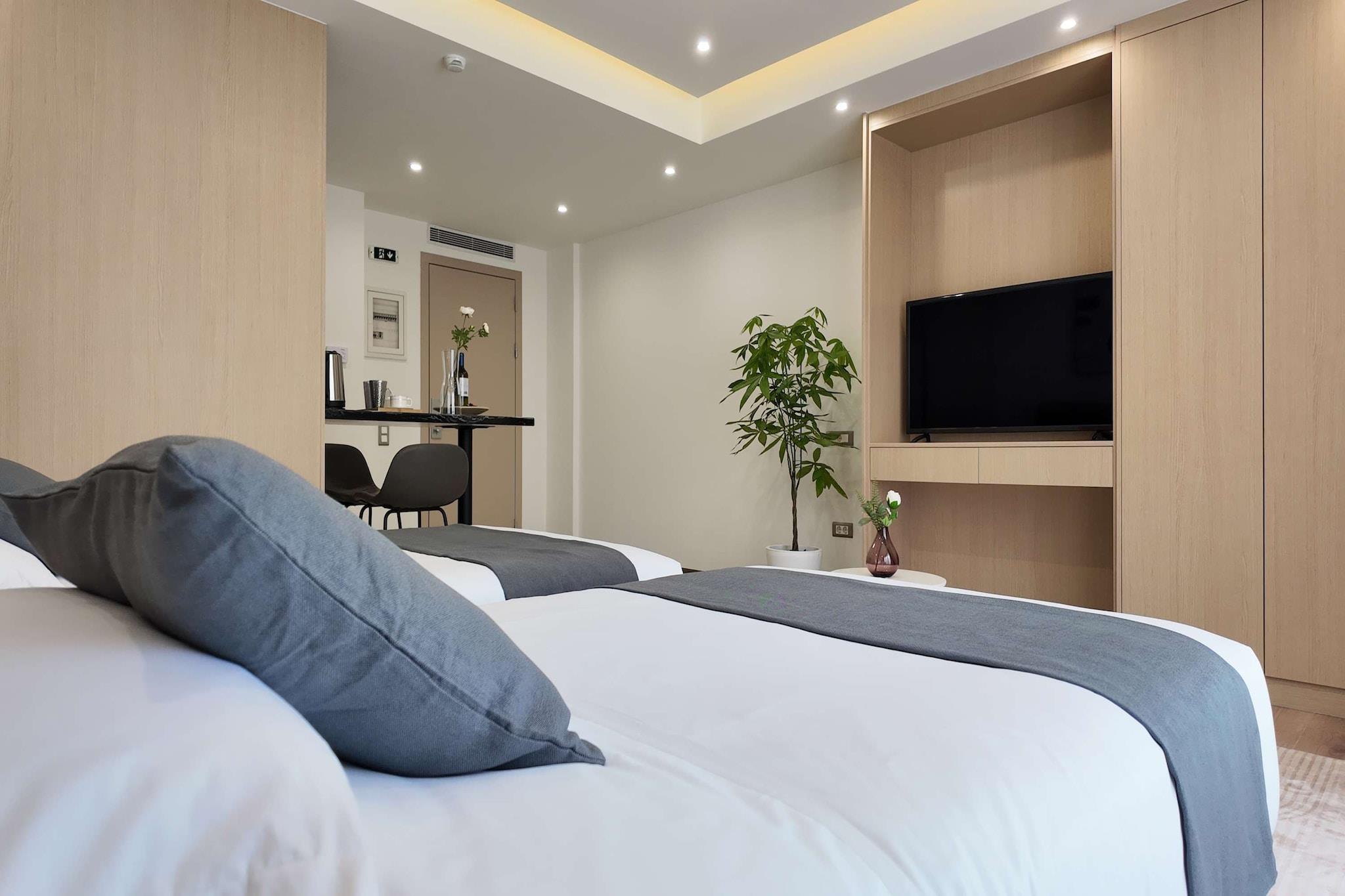 Beliggende i det pulserende hjerte af Piræus centrum tilbyder denne nyrenoverede lejlighed en sofistikeret urban flugt, hvor moderne stil møder maritim charme. Gæsterne bydes velkommen i et lyst, airconditioneret fristed, der åbner ud til en privat balkon med fredfyldt udsigt over haven. Uanset om du nyder en morgenkaffe fra kaffemaskinen på solterrassen eller slapper af midt i den frodige grønne delte have, tilbyder ejendommen en fredelig boligfølelse, samtidig med at du holder dig forbundet med højhastighedsinternet. Interiøret er omhyggeligt designet til to gæster og har et komfortabelt soveværelse udstyret med to enkeltsenge og et fladskærms-tv med kabelkanaler til afslappende aftener. Det funktionelle tekøkken er fuldt forberedt til dit ophold med mikrobølgeovn, elkedel og et spisebord, der er perfekt til afslappede måltider. For dem, der prioriterer wellness, har bygningen et dedikeret fitnesscenter til at opretholde din fitnessrutine, mens et moderne badeværelse fyldt med friske håndklæder og hårtørrer sikrer en problemfri oplevelse. Ekstra bekvemmeligheder som en elevator, en bar på stedet og inkluderet sengelinned og lagner gør dette til en virkelig ubesværet ferie. Eventyret ligger lige uden for din dør, da lejligheden er perfekt placeret til at udforske den athenske kyst. En kort gåtur fører dig til den travle Piræus Havn eller de solbeskinnede kyster ved Freatida Strand. Det omkringliggende område er en port til Det Ægæiske Hav med lokale sejladsmuligheder og ikoniske vartegn som Stavros Niarchos Foundation Kulturcenter og Flisvos Marina, der kun ligger en kort køretur væk. Det er et sted, hvor byliv og kystskønhed mødes for et virkelig mindeværdigt ophold.