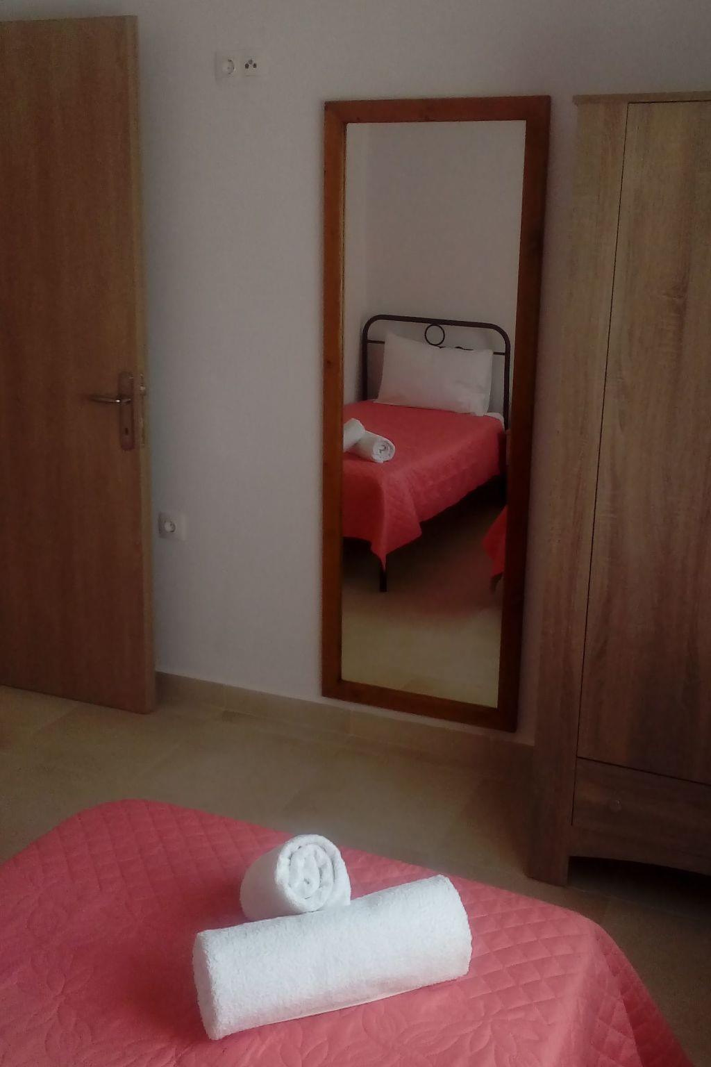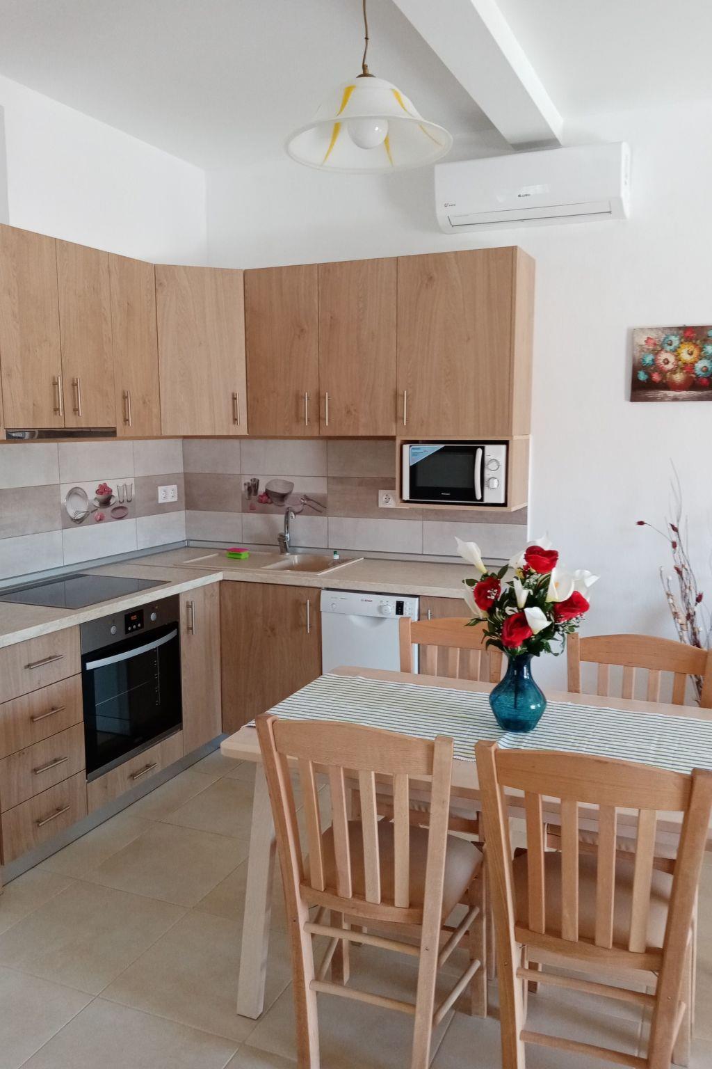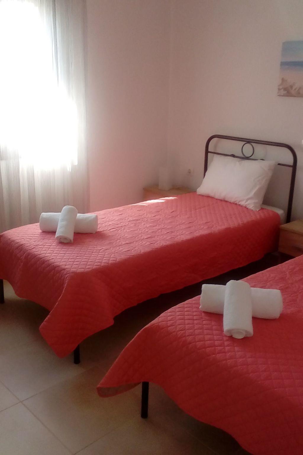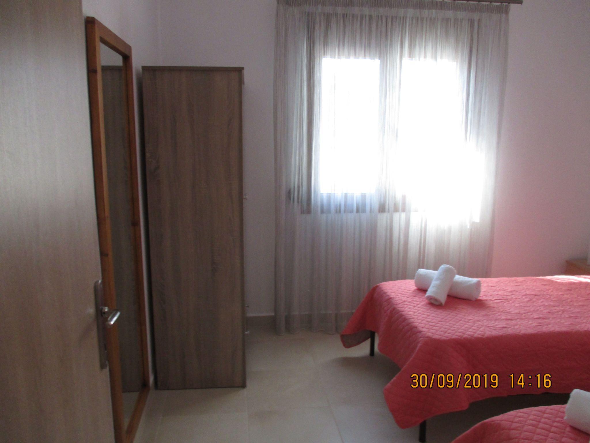 The flat has 2 bedrooms, one with a double bed and one with 2 single beds. Another person can sleep on the fold-out couch in the living room. A baby cot is also available. Babies and toddlers weighing up to 15 kilograms can sleep safely in there if required. The kitchenettes are fully equipped: Coffee machine, kettle, microwave, dishwasher, electric cooker, fridge and iron. In the bathroom you will find a washing machine and hairdryer. Hot water is supplied to the bathroom and kitchen by the solar system on the roof. A large flat screen TV hangs on the wall in the living room. A satellite dish on the roof ensures good reception of many German, English, French, Russian, Italian, Spanish and Turkish channels. Free Wifi is available. English and German books can be found in our bookshelf next to the front door should you get bored. Each flat has air conditioning in the living area and in the bedroom with the double bed.