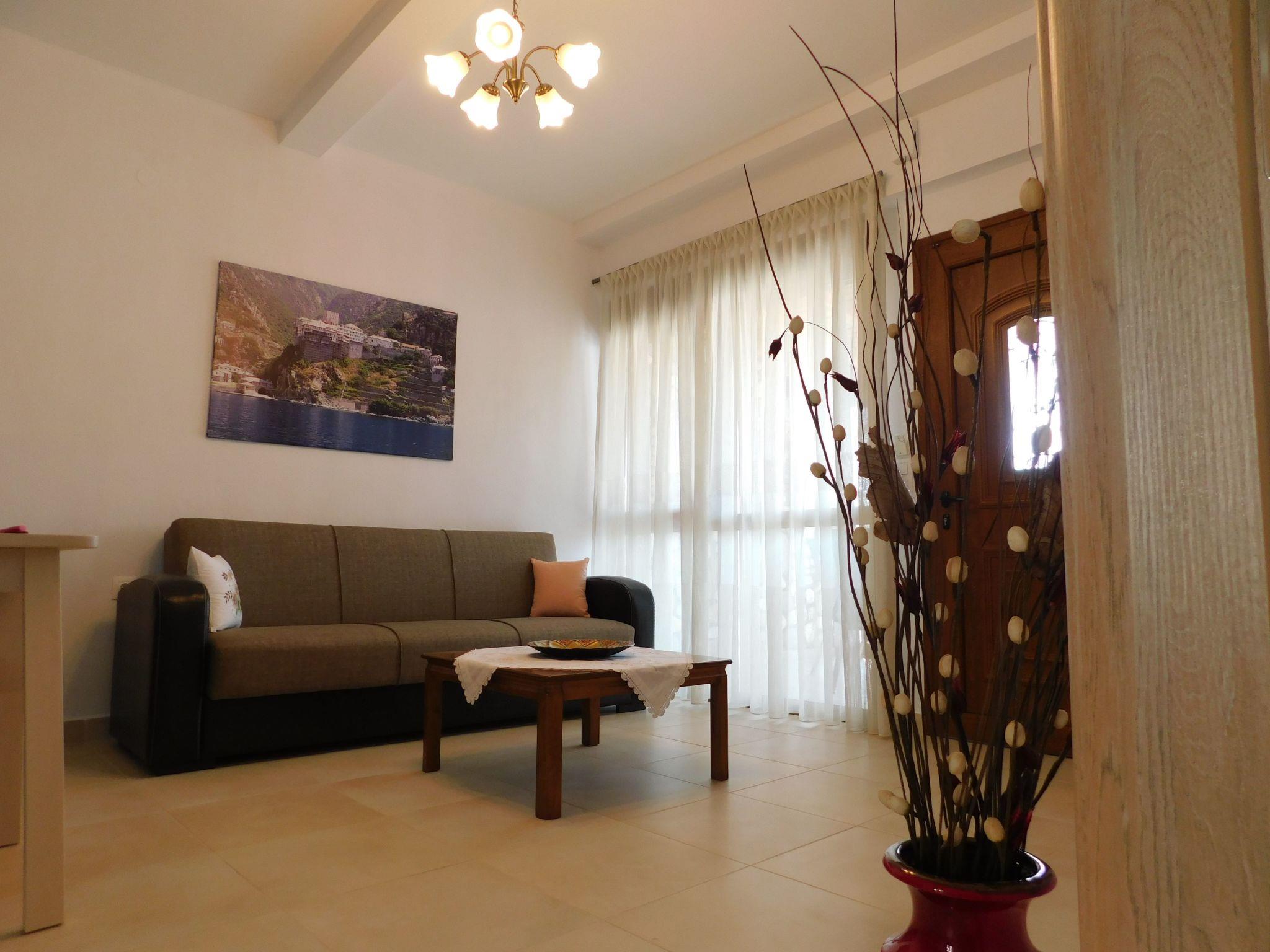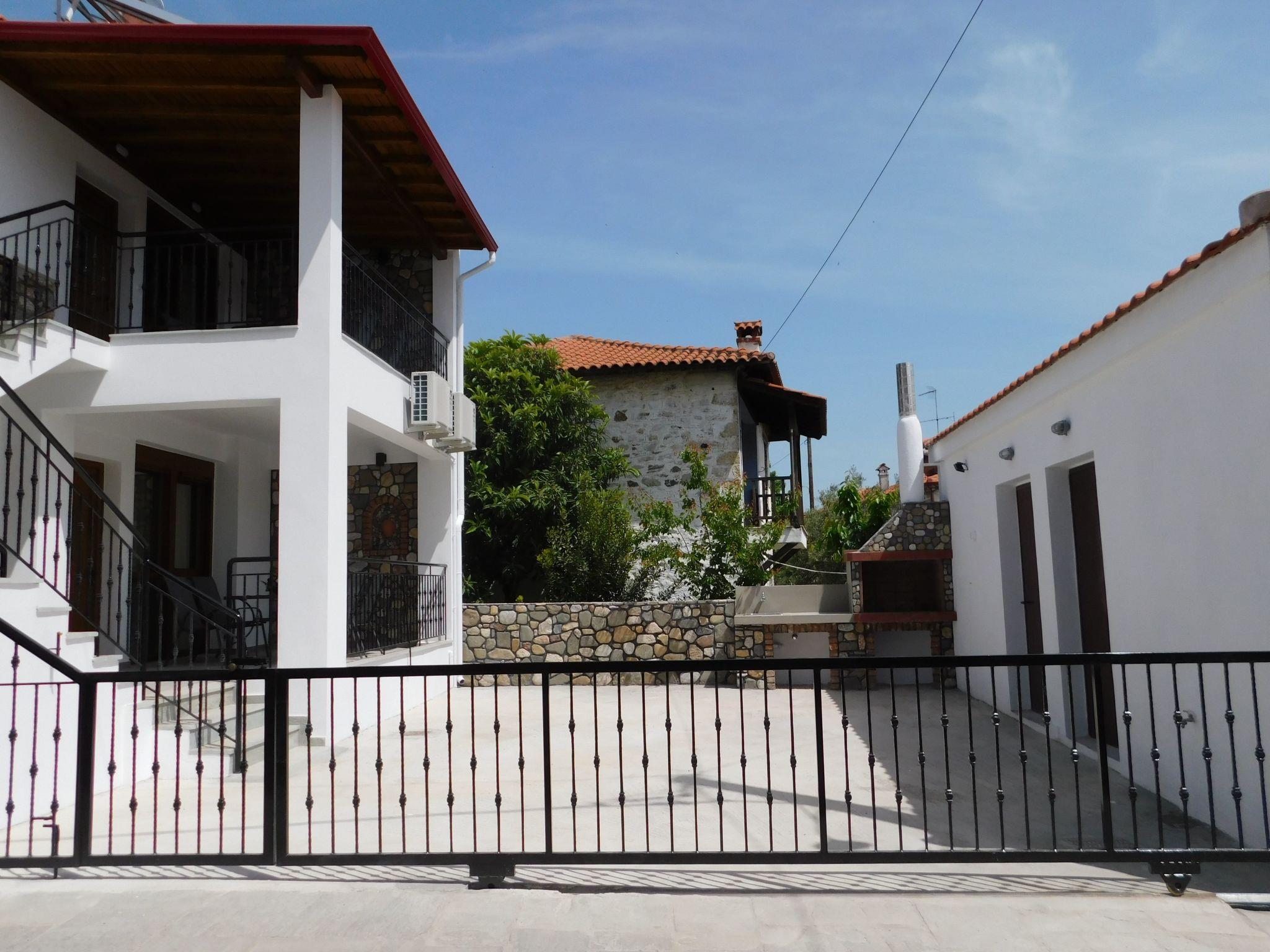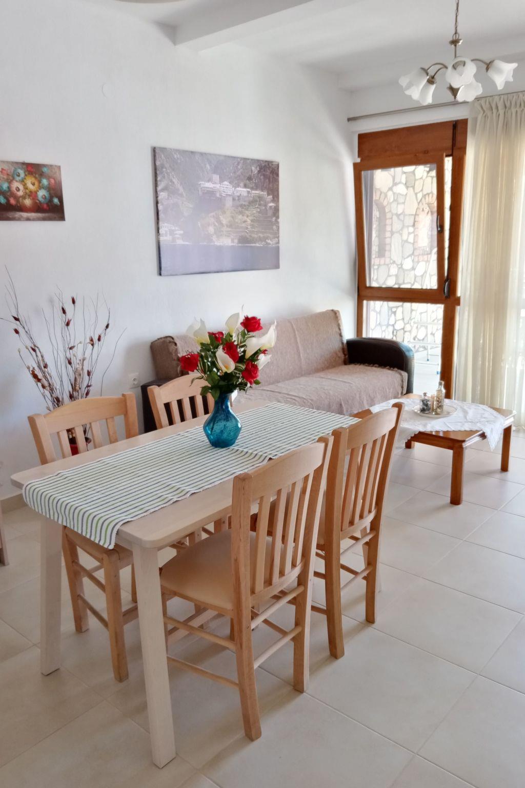 The nearest beach is only 10 minutes away by car. The bakery, supermarket, butcher's, greengrocer's and the square with cafés, pizzeria, bougatzerie and restaurants, ice cream parlours and fast food outlets are all within a 3 to 5 minute walk. Every Thursday there is a weekly market in the village of Agios Nikolaos with fresh fruit and vegetables. On Wednesdays and Fridays there is live Greek music in the centre of the village. In spring, usually on Good Friday, the first excursions by boat to the Holy Mount Athos begin. The harbour of Ormos Panagias is 10 minutes away by car and Agios Nikolaos is located on the Sithonia peninsula. The village is right next to the forest, where you can go hiking or mountain biking (early and late season). In sunny weather you can hire a boat and explore the island of Diaporos, opposite Vourvourou. There are marvellous sandy beaches with crystal clear blue water all over Sithonia.