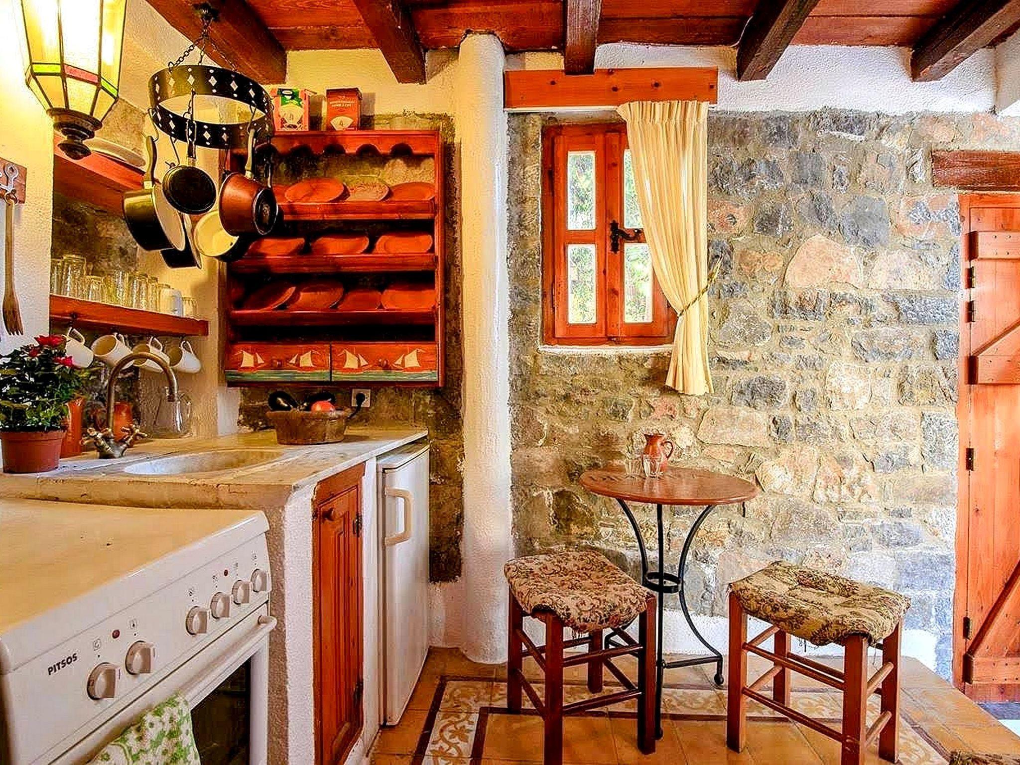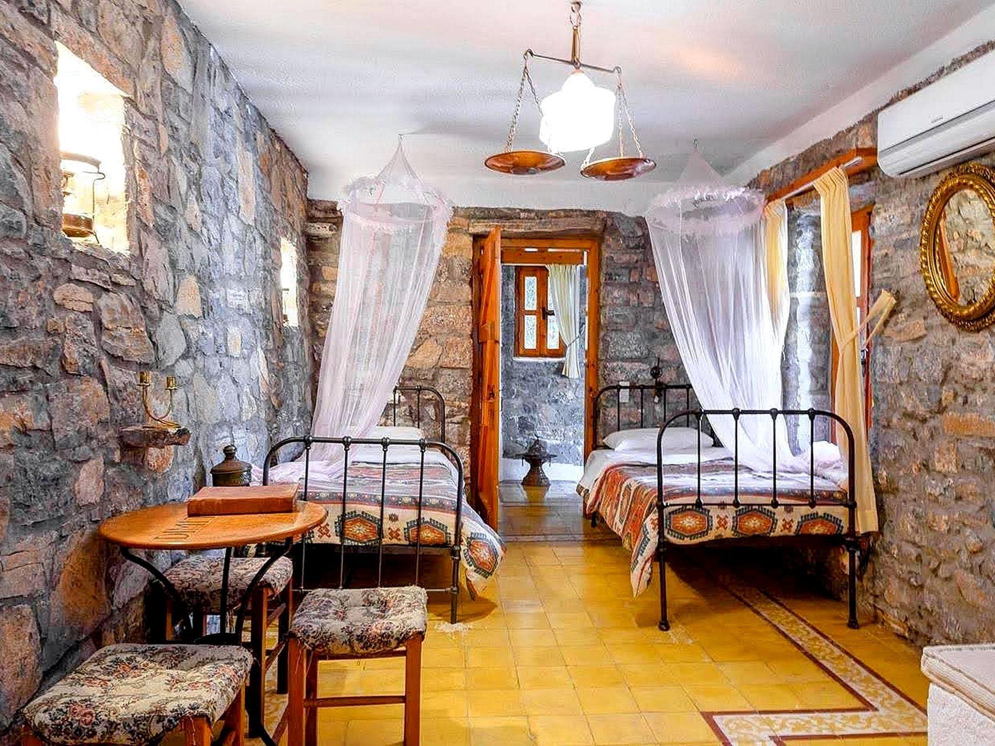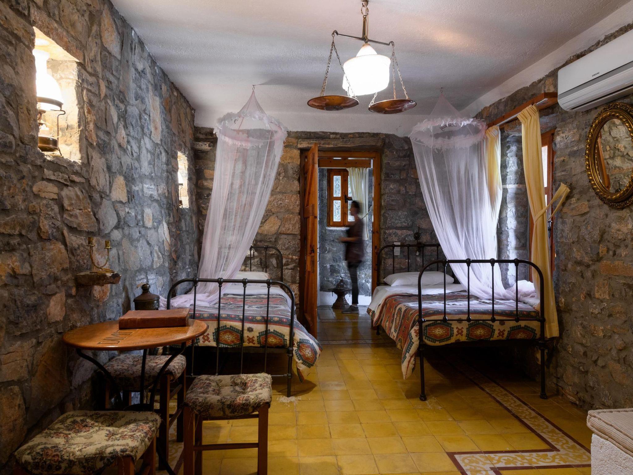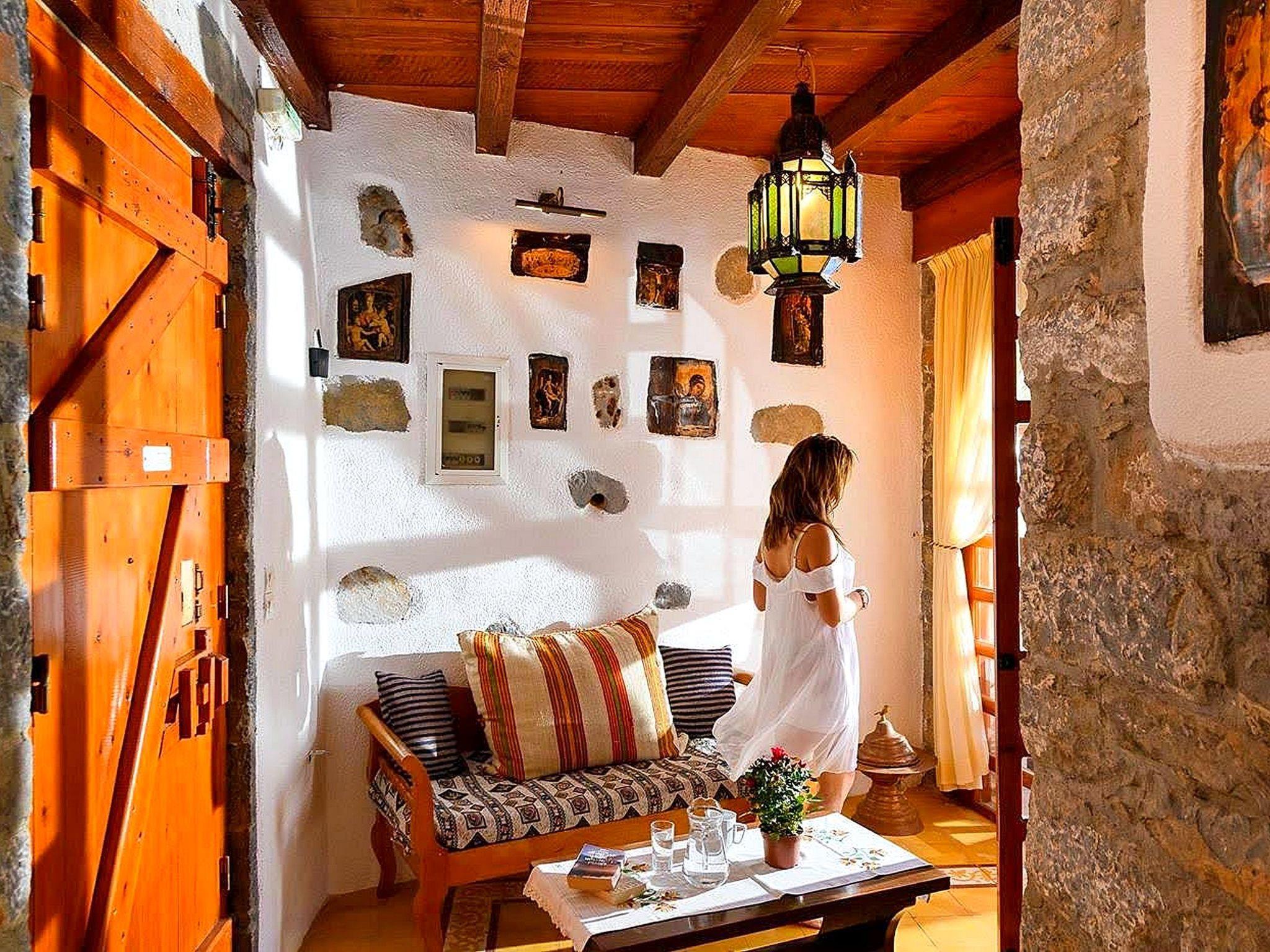 The traditionally built house combines rustic features with luxurious features. The interior features exposed brickwork, wooden beams and elegant furniture, creating a warm and homely environment. It can accommodate 4 persons. A/C included. Entering small dining and sitting area. On the right kitchen with all utensils. The door on the left leads to a bedroom with two single beds and further to the second bedroom with matrimonial bed. Adjoining the bathroom with Jacuzzi. In the outside area private dining table to sit four adults and next swimming pool to be shared with another Home. Private parking for two cars. All the furniture are copies of originals found in the Historical Museum of Heraklion, Crete, but the lamps and fittings are original. Tiles used are hand made, dated c 1920, taken from old demolished houses and the marble sink was found in a Turkish Hammam. The taps are copies of those of the 1920's. The reddish plaster on the walls is made of ground tiles, the same material that was used in the monasteries of the period 14th - 16th century. There is evidence handed down through the generations that there was a church on this site many years ago