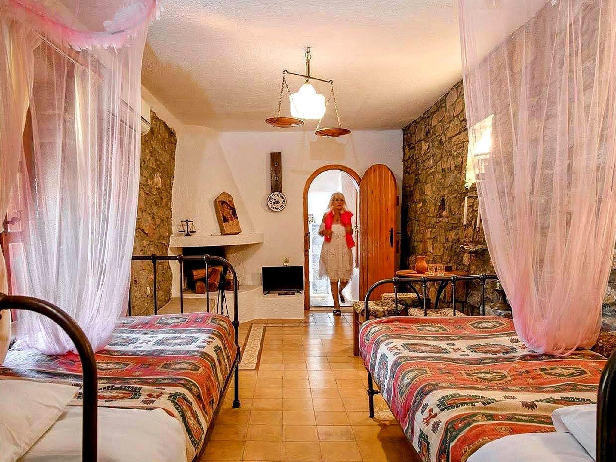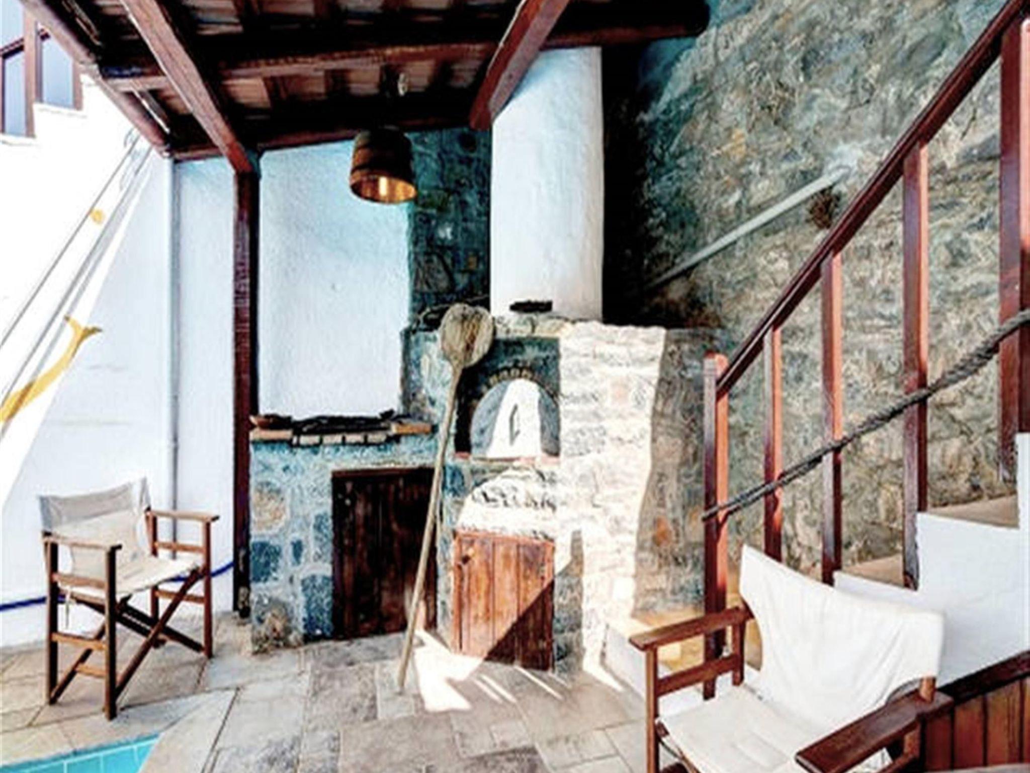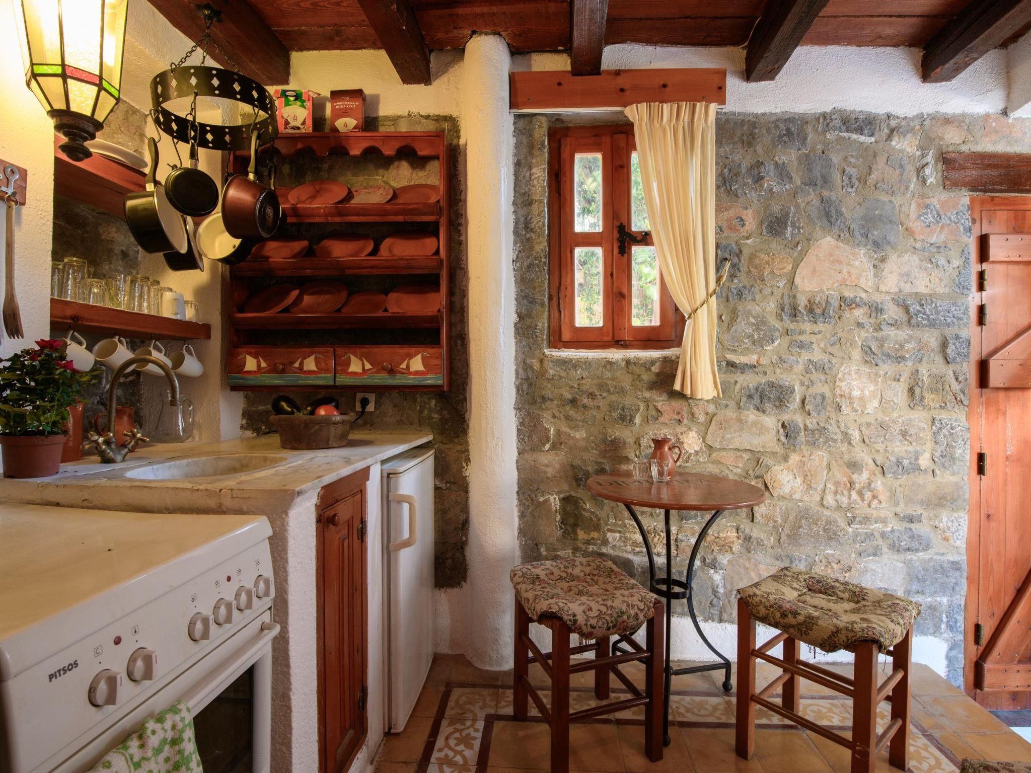The traditionally built house combines rustic features with luxurious features. The interior features exposed brickwork, wooden beams and elegant furniture, creating a warm and homely environment. It can accommodate 4 persons. A/C included. Entering small dining and sitting area. On the right kitchen with all utensils. The door on the left leads to a bedroom with two single beds and further to the second bedroom with matrimonial bed. Adjoining the bathroom with Jacuzzi. In the outside area private dining table to sit four adults and next swimming pool to be shared with another Home. Private parking for two cars. All the furniture are copies of originals found in the Historical Museum of Heraklion, Crete, but the lamps and fittings are original. Tiles used are hand made, dated c 1920, taken from old demolished houses and the marble sink was found in a Turkish Hammam. The taps are copies of those of the 1920's. The reddish plaster on the walls is made of ground tiles, the same material that was used in the monasteries of the period 14th - 16th century. There is evidence handed down through the generations that there was a church on this site many years ago