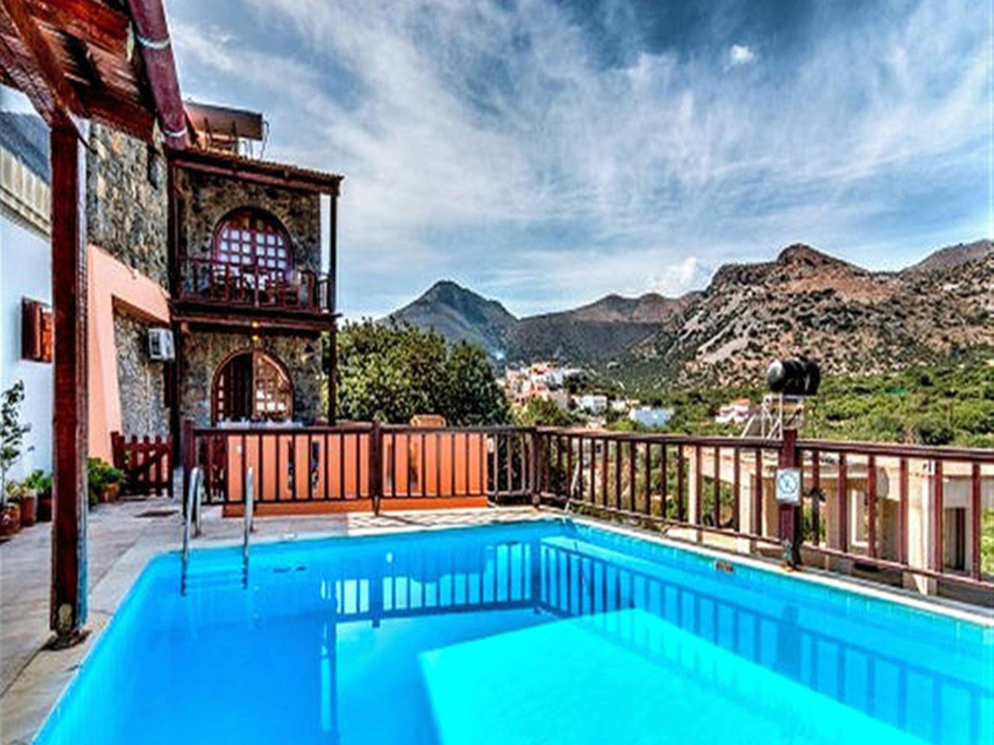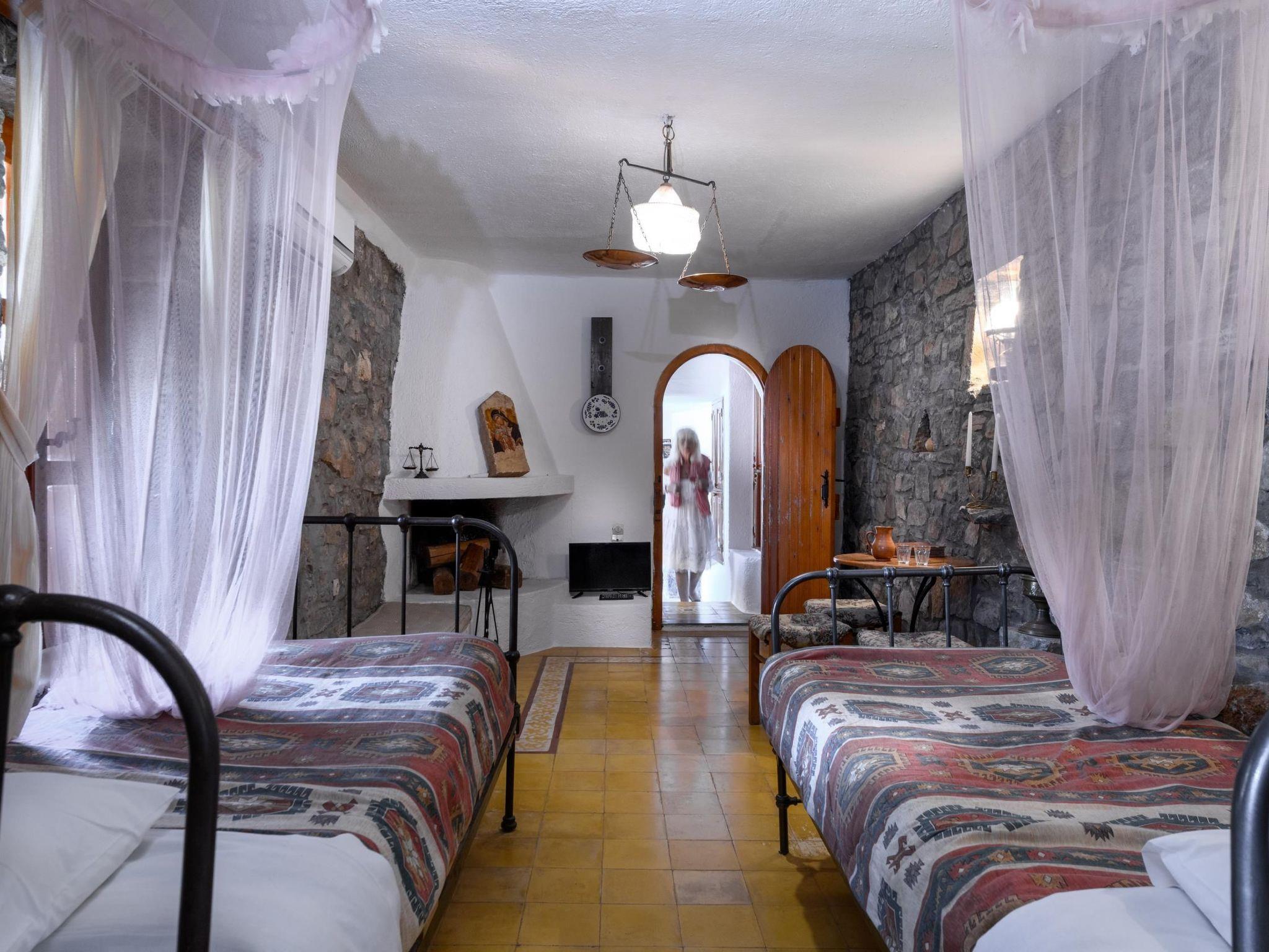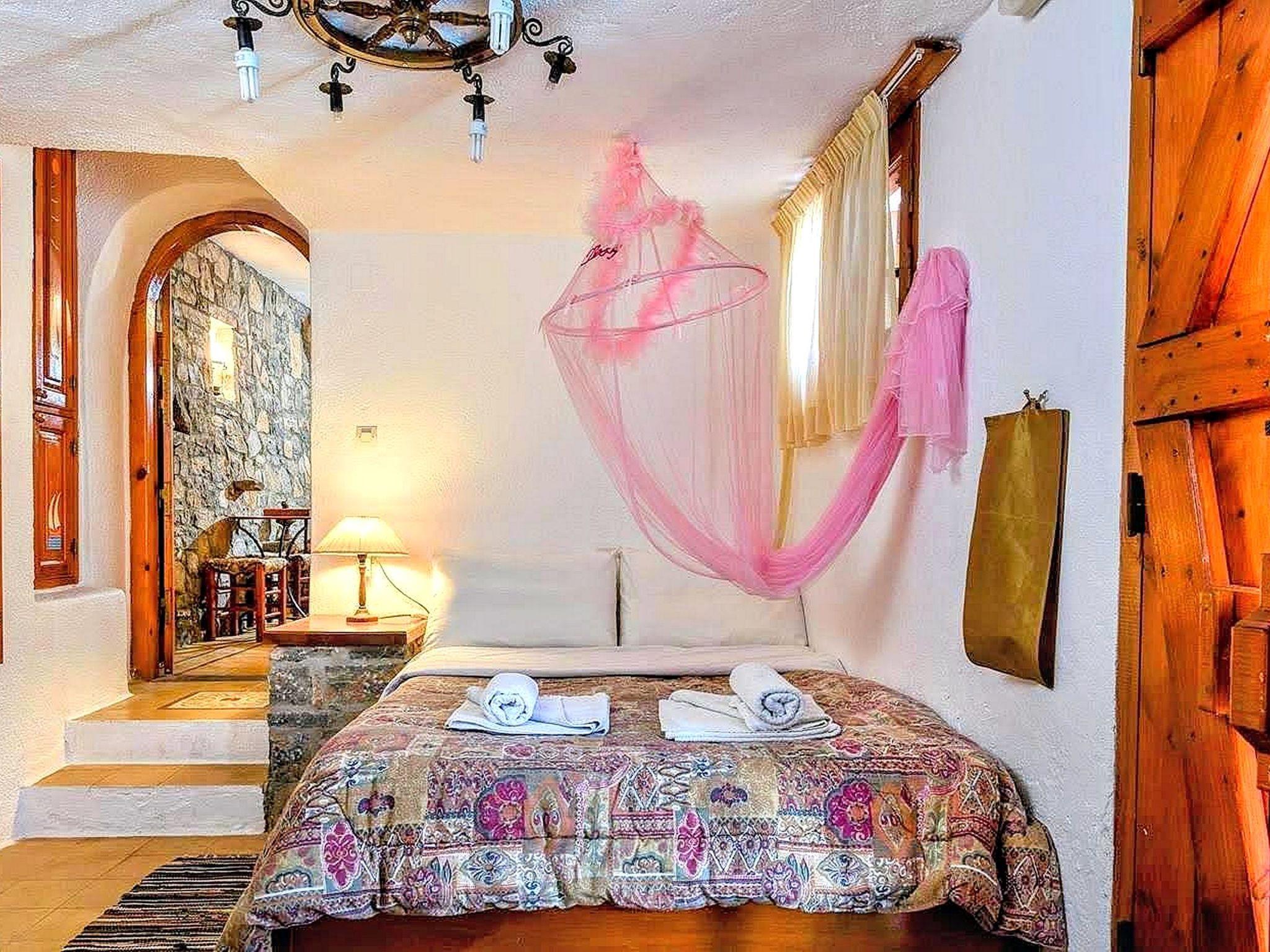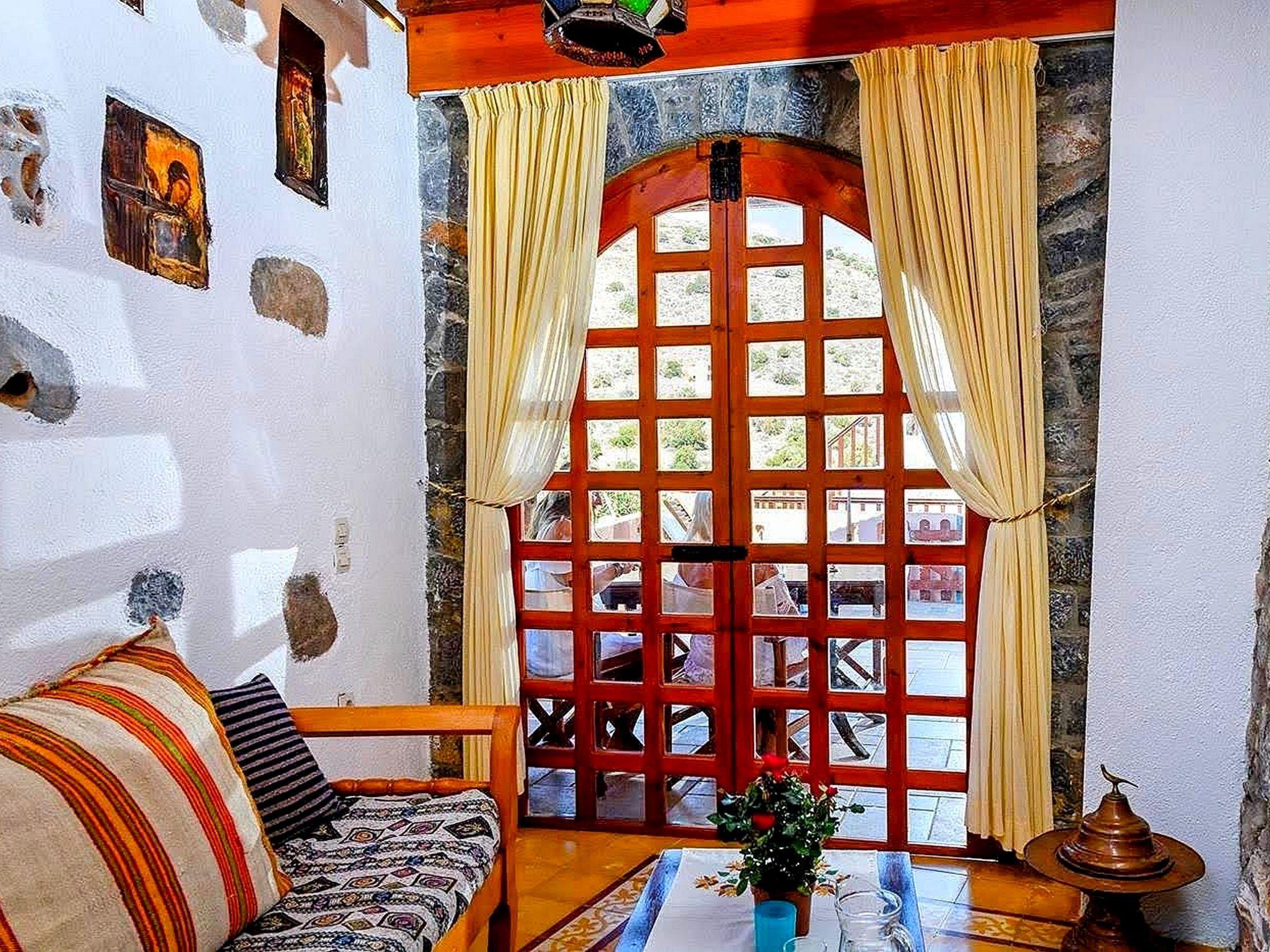 The traditionally built house combines rustic features with luxurious features. The interior features exposed brickwork, wooden beams and elegant furniture, creating a warm and homely environment. It can accommodate 4 persons. A/C included. Entering small dining and sitting area. On the right kitchen with all utensils. The door on the left leads to a bedroom with two single beds and further to the second bedroom with matrimonial bed. Adjoining the bathroom with Jacuzzi. In the outside area private dining table to sit four adults and next swimming pool to be shared with another Home. Private parking for two cars. All the furniture are copies of originals found in the Historical Museum of Heraklion, Crete, but the lamps and fittings are original. Tiles used are hand made, dated c 1920, taken from old demolished houses and the marble sink was found in a Turkish Hammam. The taps are copies of those of the 1920's. The reddish plaster on the walls is made of ground tiles, the same material that was used in the monasteries of the period 14th - 16th century. There is evidence handed down through the generations that there was a church on this site many years ago