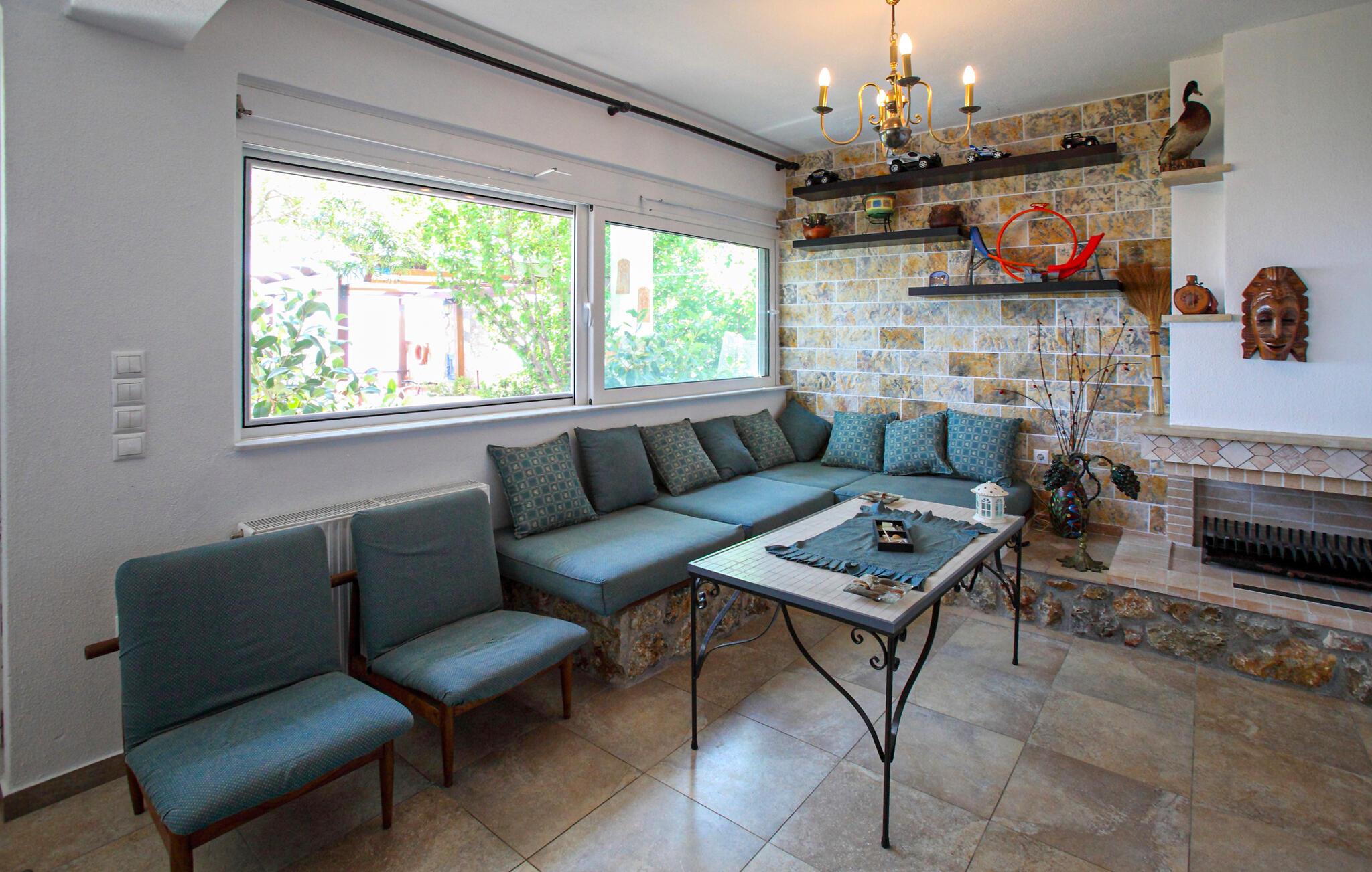 Dette komfortable feriehus er ideelt for en stor familie eller gruppe af venner, der ønsker at tilbringe afslappende dage i Grækenland. Beliggende i en lille, stille bugt, er det en fremragende base for at udforske Athens riviera eller for dagsture til Athen for at se sightseeing. Stueetagen har en separat indgang, en anden indgang fører til de to etager ovenover, som er forbundet med hinanden. Flere soveværelser giver plads til en stor familie.