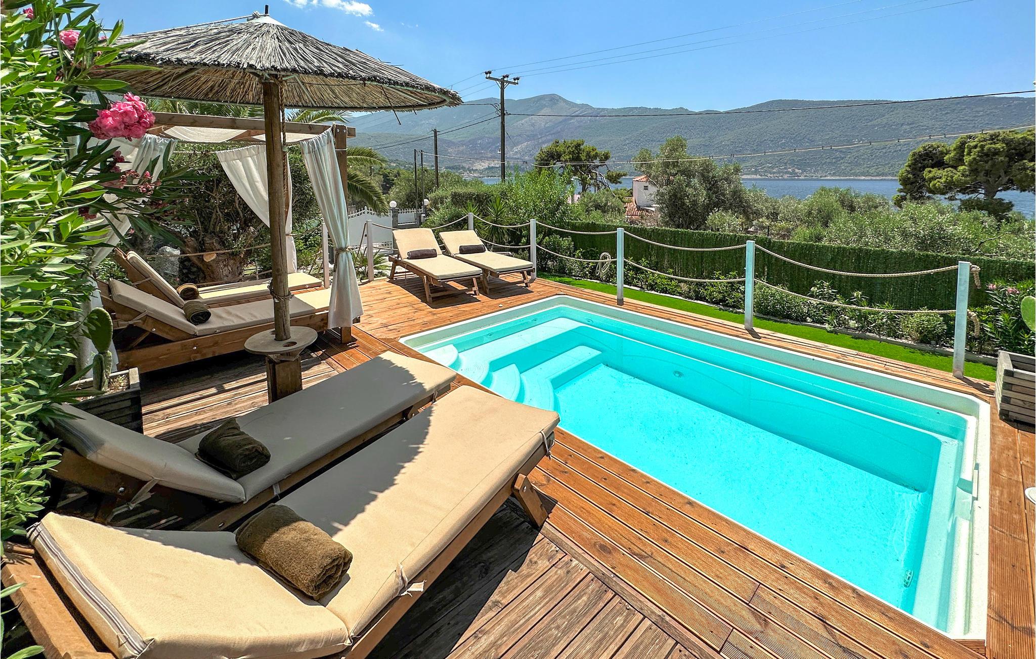 Ved Korinthbugten ligger dette feriehus, blot 20 m fra stranden Prosily i Porto Germeno. I haven er der både blomster og træer, i huset er der bl.a. to soveværelser, et godt udstyret køkken og en stue med sovesofa. Tag på opdagelse i det gamle citadel Porto Germeno, hvor I kan se ruinerne fra et af antikkens højeste tårn. Andre udflugtsmål: Vilia (10 km), Theben (20 km) og Athen (48 km) med mange aktiviteter, monumenter og seværdigheder. Området ligger omgivet af skovklædte bjerge, og Kithaironbjergene som er populære blandt paraglidere.