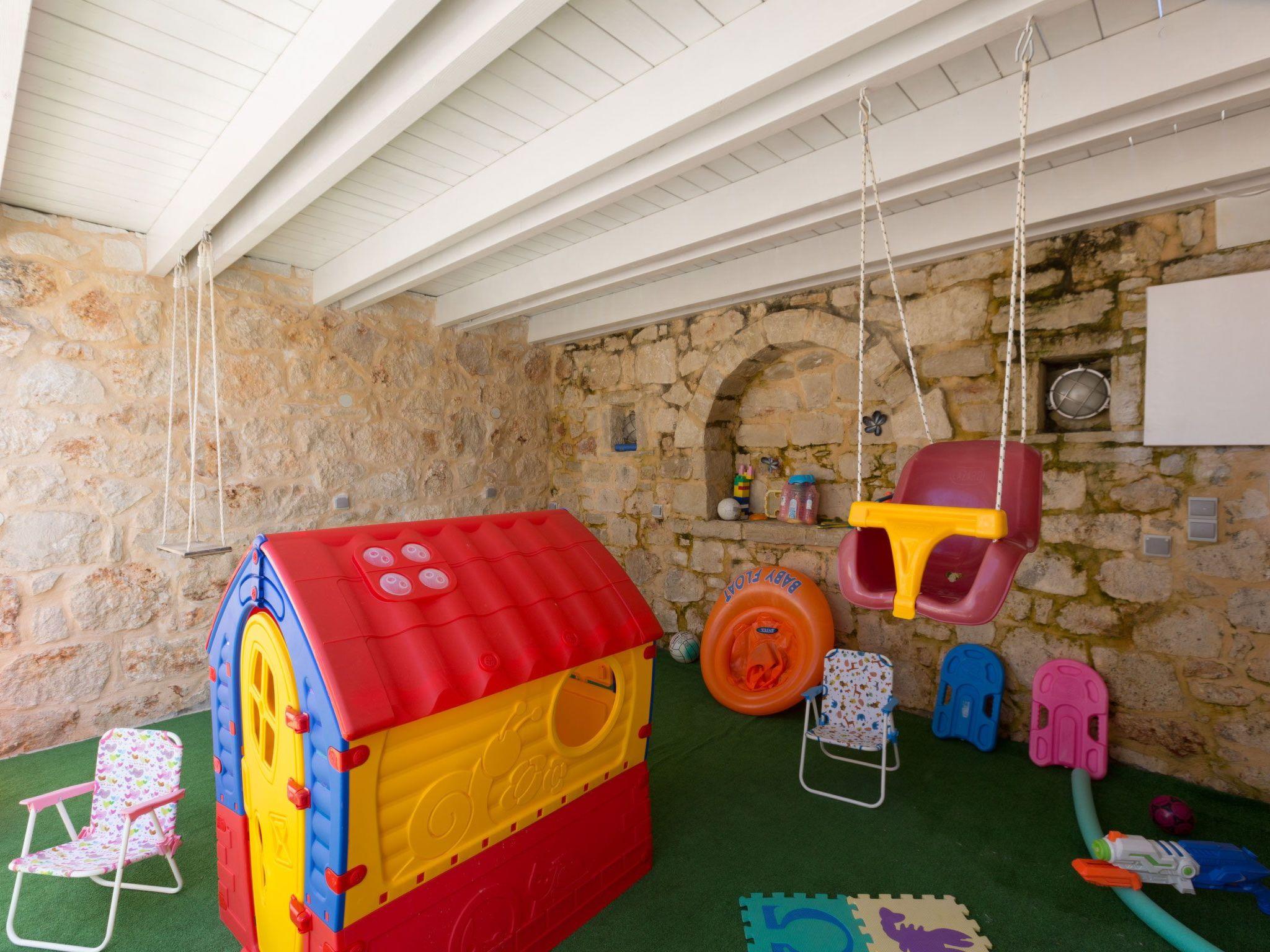 After entering the stone paved path leading to the secure garage and leaving your car, you climb up the staircase and find yourselves in the outdoor area of Kampos Villa, which could only be described as a summer fantasy! To start with, there is a big sunbathing terrace, featuring a 25 sq. m. private heated swimming pool (1.50m deep) and a lawn covered area, equipped with sun beds, umbrellas and an outdoor shower, where you can relax and enjoy the sun and fresh country side air all day long! It also features an outdoor sitting area and stone built BBQ facilities with an extra sink, for doing the cleaning up, after enjoying you homemade meal and al fresco dining!o make things even better, the two Villas share a shaded playground area, located right next to the BBQ facilities, with children’s toys and covered with a soft pad, where our younger guests will love to spend their time, as well as an extra relaxation area with sun beds and umbrellas. Additionally, guests have access to the wonderful vegetable garden, where they can help themselves to fresh vegetables for their meals!Pool Heating Policy:-The pool can be heated March-May, October-November and the days with outside temperature less than 25 °C.-The pool needs 24h prior notice, before the arrival, to reach 23 °C. The pool should be heated for minimum 3 days use per time. Prior notice is required.-Water temperature can reach up to 26 °C degrees, depending on the outdoor temperature.-In case of rain there won’t be a possibility to use the pool.
