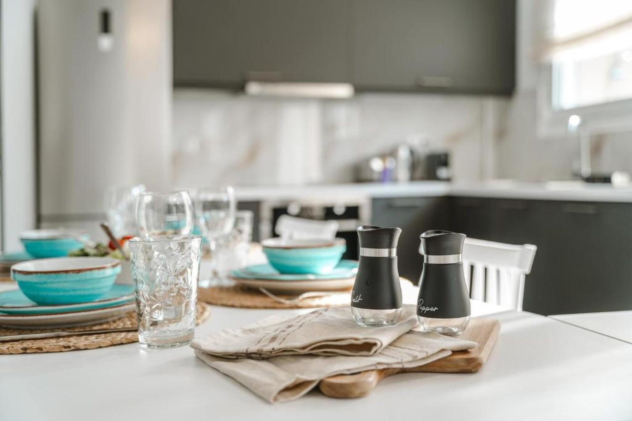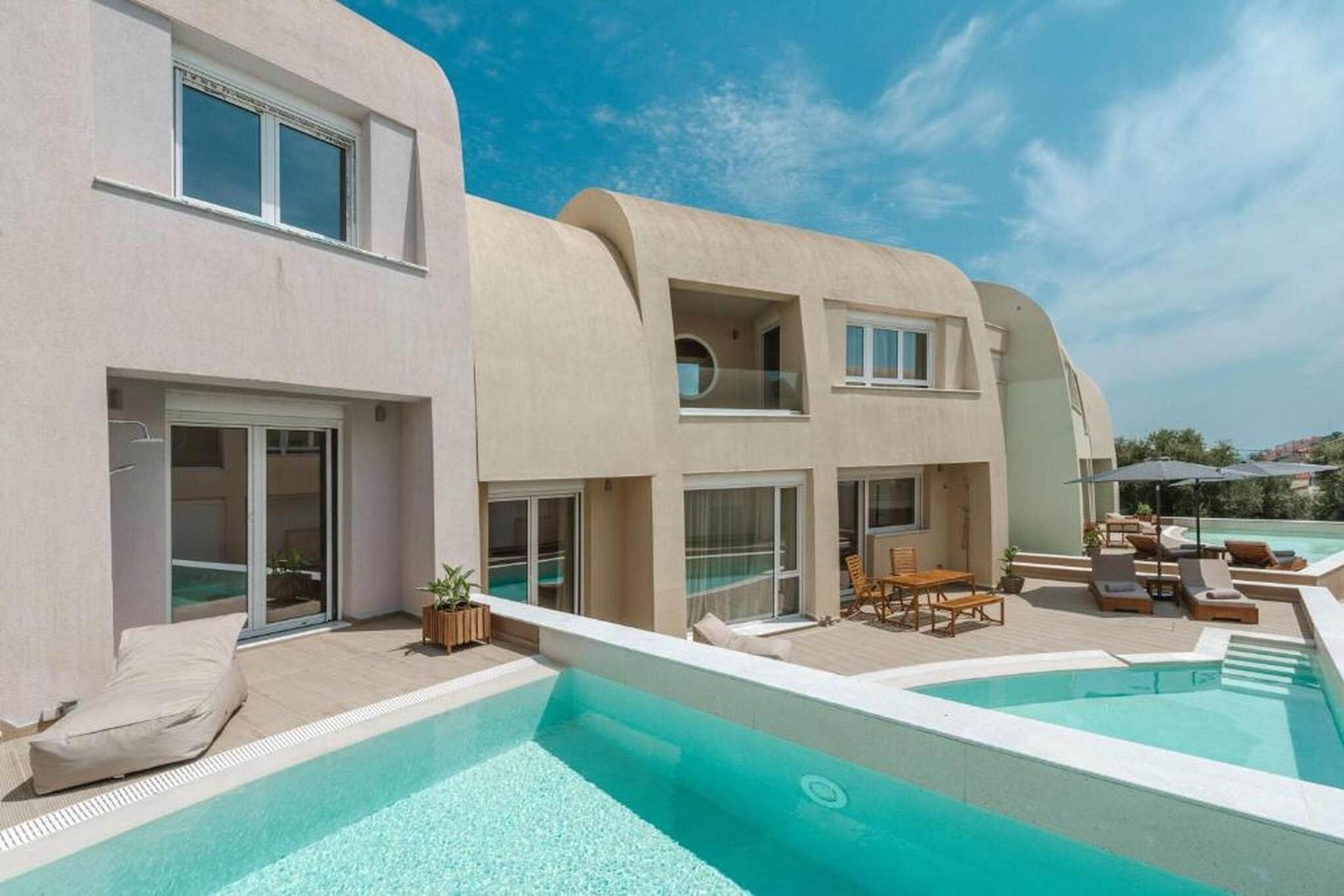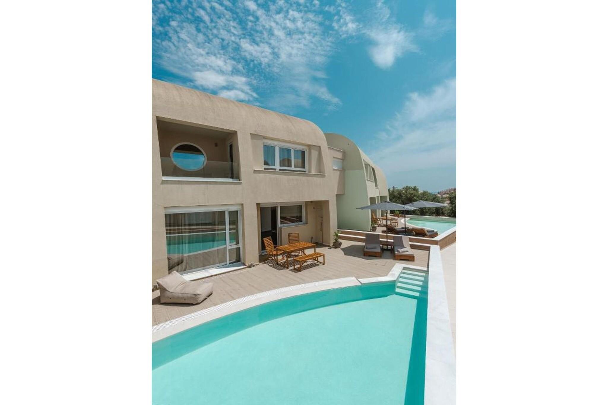 Fordyb dig i en raffineret middelhavsferie på Tortuga Luxury Villas Sivota, hvor moderne arkitektonisk elegance møder den uberørte naturlige skønhed ved den joniske kyst. Denne villa på 130 m²-135 m² med tre soveværelser er designet til kræsne rejsende og tilbyder en problemfri blanding af indendørs og udendørs ophold og førsteklasses faciliteter. Villaen er perfekt egnet til grupper eller familier på op til seks personer og har en sæsonåben privat swimmingpool og en rolig terrasse, der giver et afsidesliggende fristed at slappe af i Grækenlands afslappede rytme. Interiøret er et udstillingsvindue for sofistikeret komfort med tre soveværelser med eget badeværelse, store dobbeltsenge og en rummelig opholdsstue med fladskærms-tv med satellitkanaler og højhastigheds-Wi-Fi (100+ Mbps). Det fuldt udstyrede åbne køkken inkluderer high-end apparater såsom espressomaskine, ovn, opvaskemaskine og endda et raclette-sæt til mindeværdige aftener. Hver detalje, fra de lydisolerede værelser og allergivenlige sengetøj til regnbruserne og designertoiletartikler, er omhyggeligt udvalgt for at sikre et fredeligt og luksuriøst ophold. Ideelt beliggende i et roligt boligområde i Sivota, kun 17 minutters gang (1,4 km) fra det krystalklare vand ved Zavia-stranden og en kort tur på 1,5 km til den pulserende Sivota-havn. Ejendommen tilbyder bekvemmeligheden af gratis privat parkering på stedet, lufthavnstransport og fuld tilgængelighed for handicappede gæster. Uanset om du nyder en grillfest på terrassen eller nyder udsigten over bjergene og poolen fra din private balkon, tilbyder disse villaer en autentisk og fornemt græsk ø-livsoplevelse.