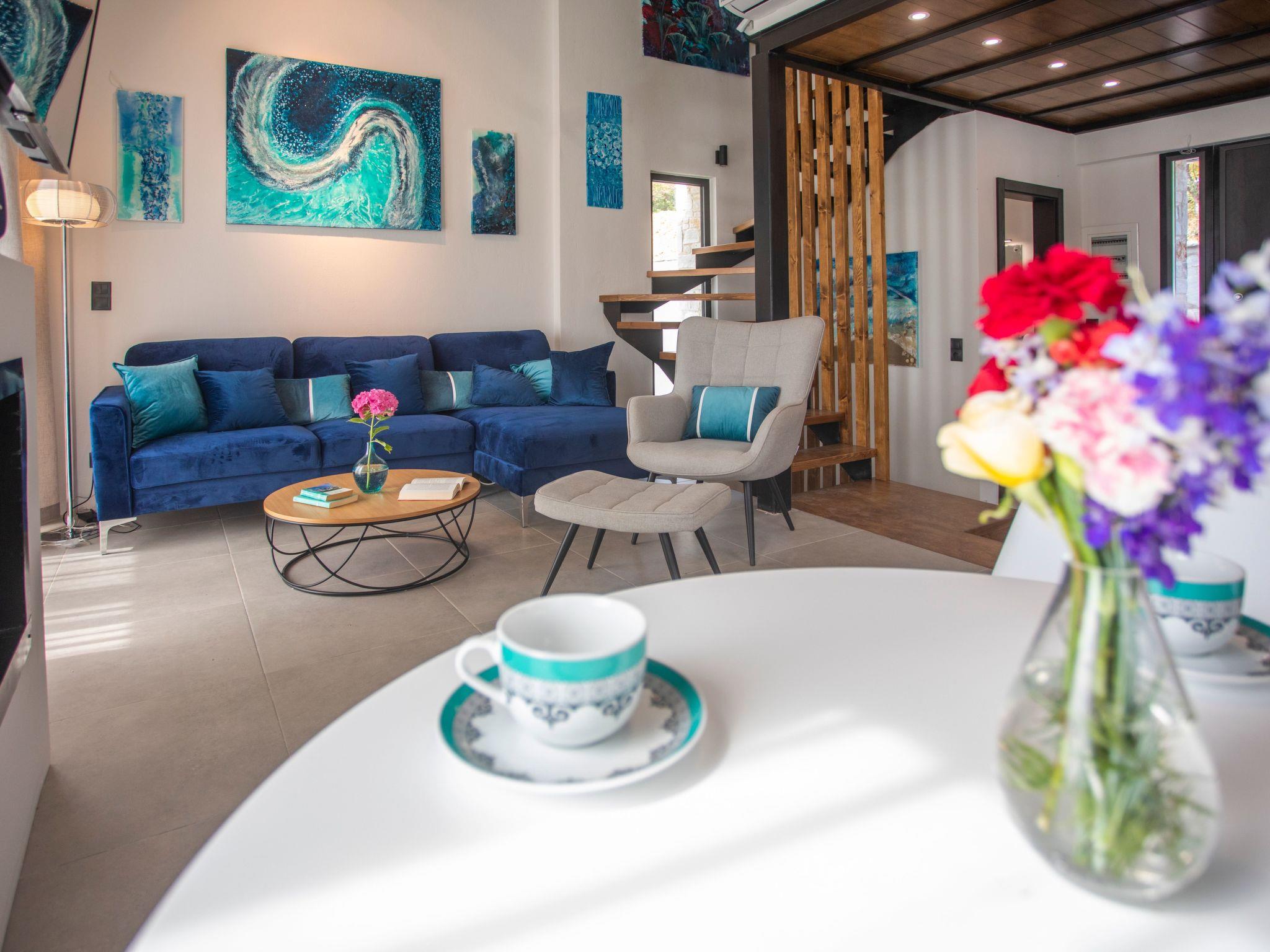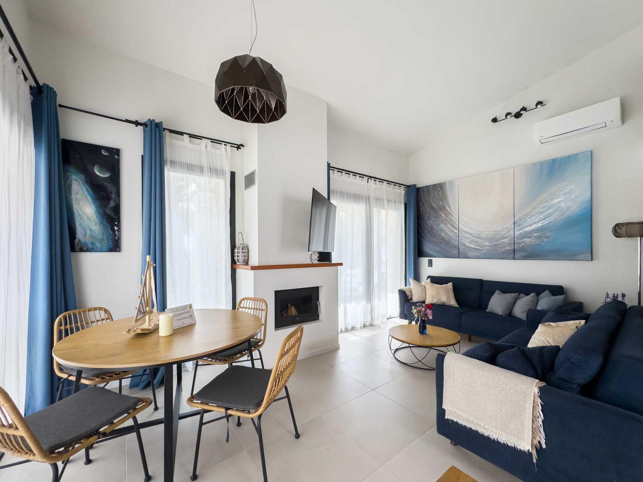 Inside, each villa showcases three spacious en-suite bedrooms, sophisticated indoor-outdoor living spaces and a fully equipped kitchen, all thoughtfully designed to cater to both family gatherings and moments of personal solitude. Attention to detail is evident throughout, with bespoke furnishings and curated artwork that pay homage to the natural beauty and cultural spirit of Skiathos. The interiors are bathed in warmth, artistry and personal touches, with original paintings inspired by the island’s landscapes, lending each space a unique and inviting aura.