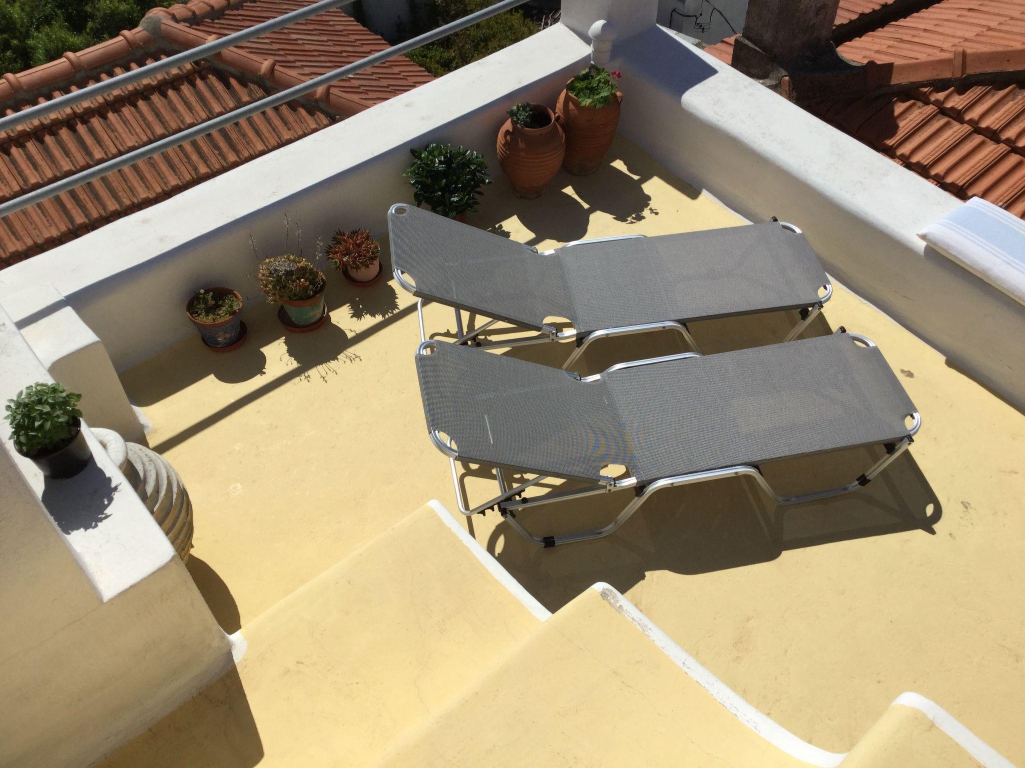 The third floor tops the cosy interior. Stairs lead to the breathtaking roof terrace of 30 m², partly sunny and partly in the shade, providing a grill, a marble sink for washing up breakfast crockery, terrace furniture and a 270-degree view over the roofs of the town and along the harbour. You can park by the harbour, about 600 metres from the accommodation, next to a bus stop and a taxi stand. Parking is generally free in Skopelos.