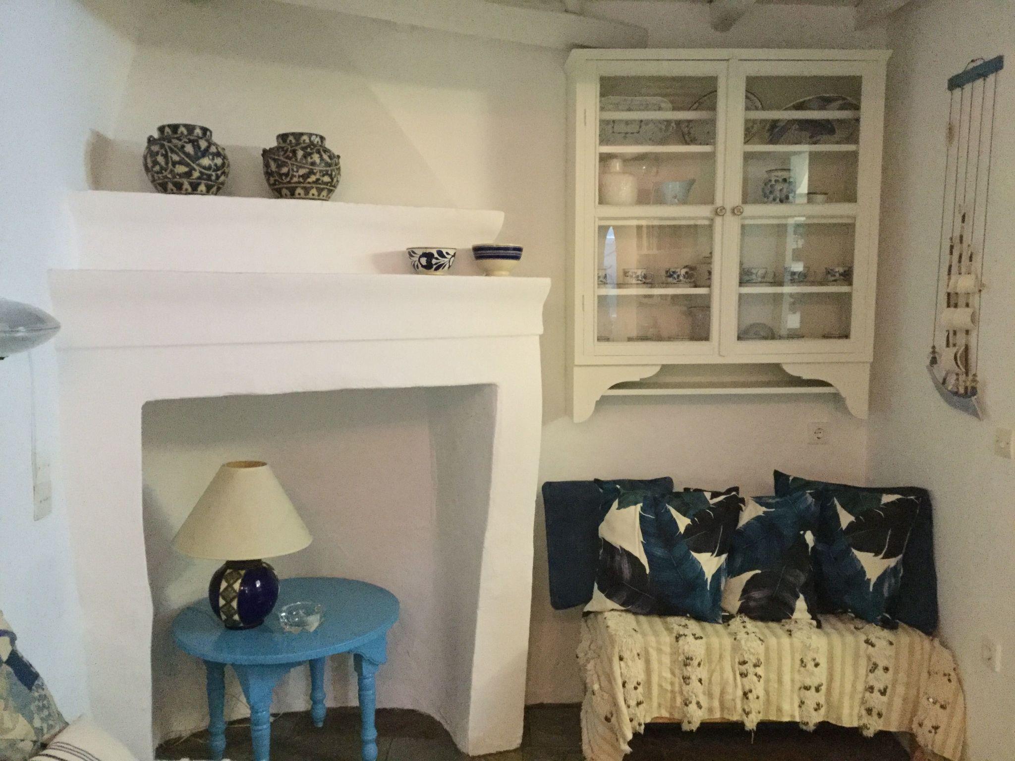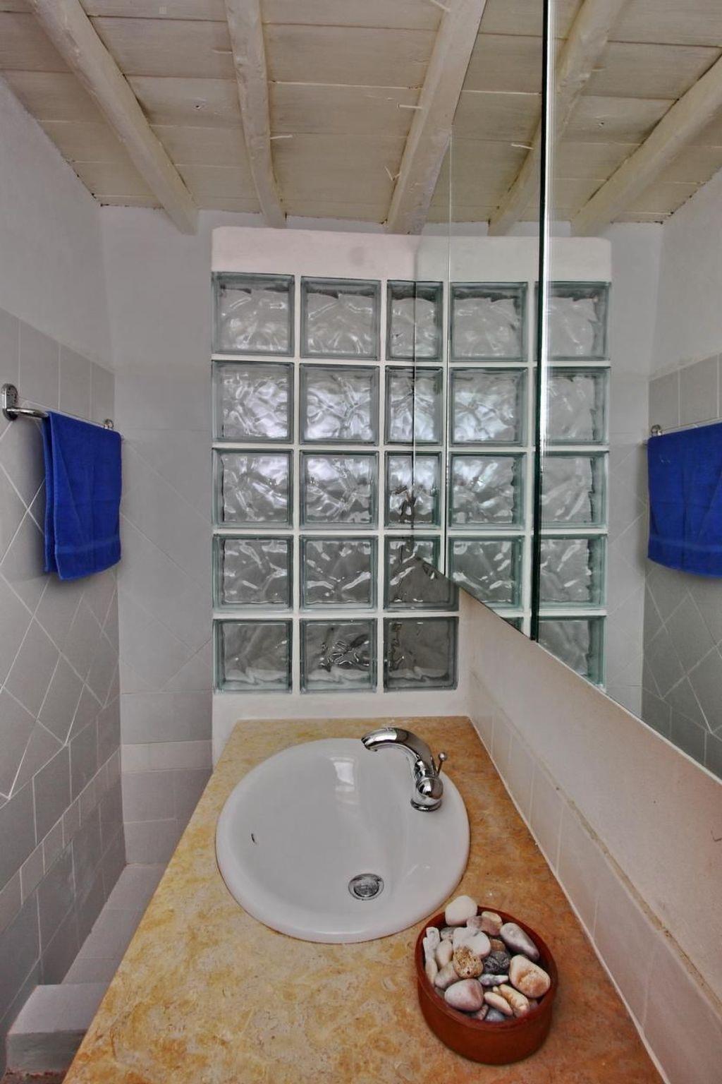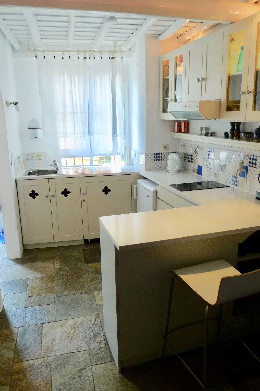This house is a perfect mix between traditional decoration and functional modern comfort,. You will feel very comfortable here. An archway leads from the entrance hall to the comfortable living room, comprising a lounge area and an open kitchen, which is well-equipped and includes a tove, fridge, freezer compartment, microwave, Nespresso Machine, toaster and kettle and has a marble worktop. Next to the kitchen there is a counter with two stools. You can also sit at a round table or on the two sofas in the living room. There are bookshelves with a Lot of books, CD’s and a CD player. The bathroom provides a shower, WC and washbasin, and combines history and modern times. Wooden stairs lead to the open sleeping area with two separate single beds, which stand one next to the other as a double bed (each 90 x 200cm, box spring mattresses). The unique old parquet floors are very eye-catching, as well as the high ceilings. A little greek table, two chairs and an antique sofa adorn the sleeping area, which has a silent fan and air conditioning for warm and cold function. Hand towels are provided, but you should bring your own beach towels.