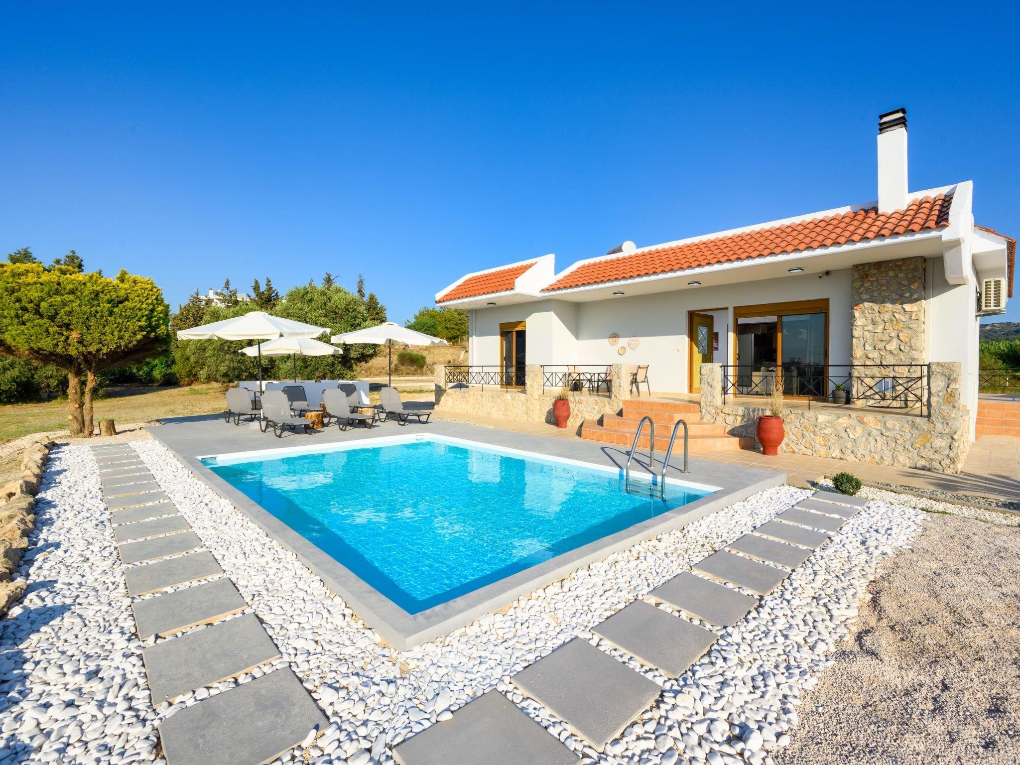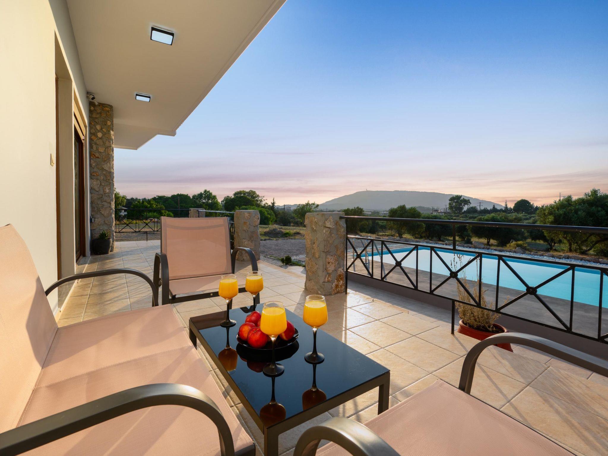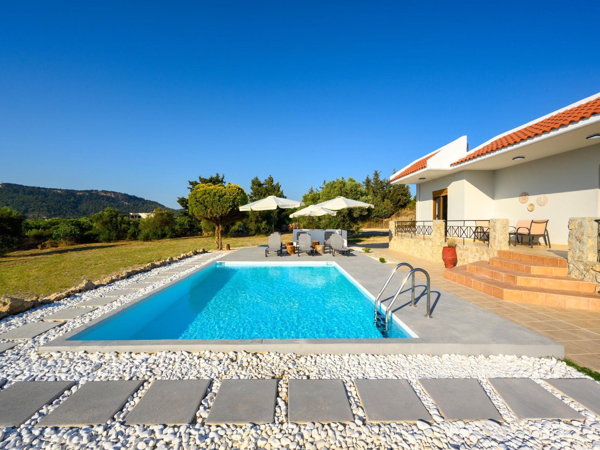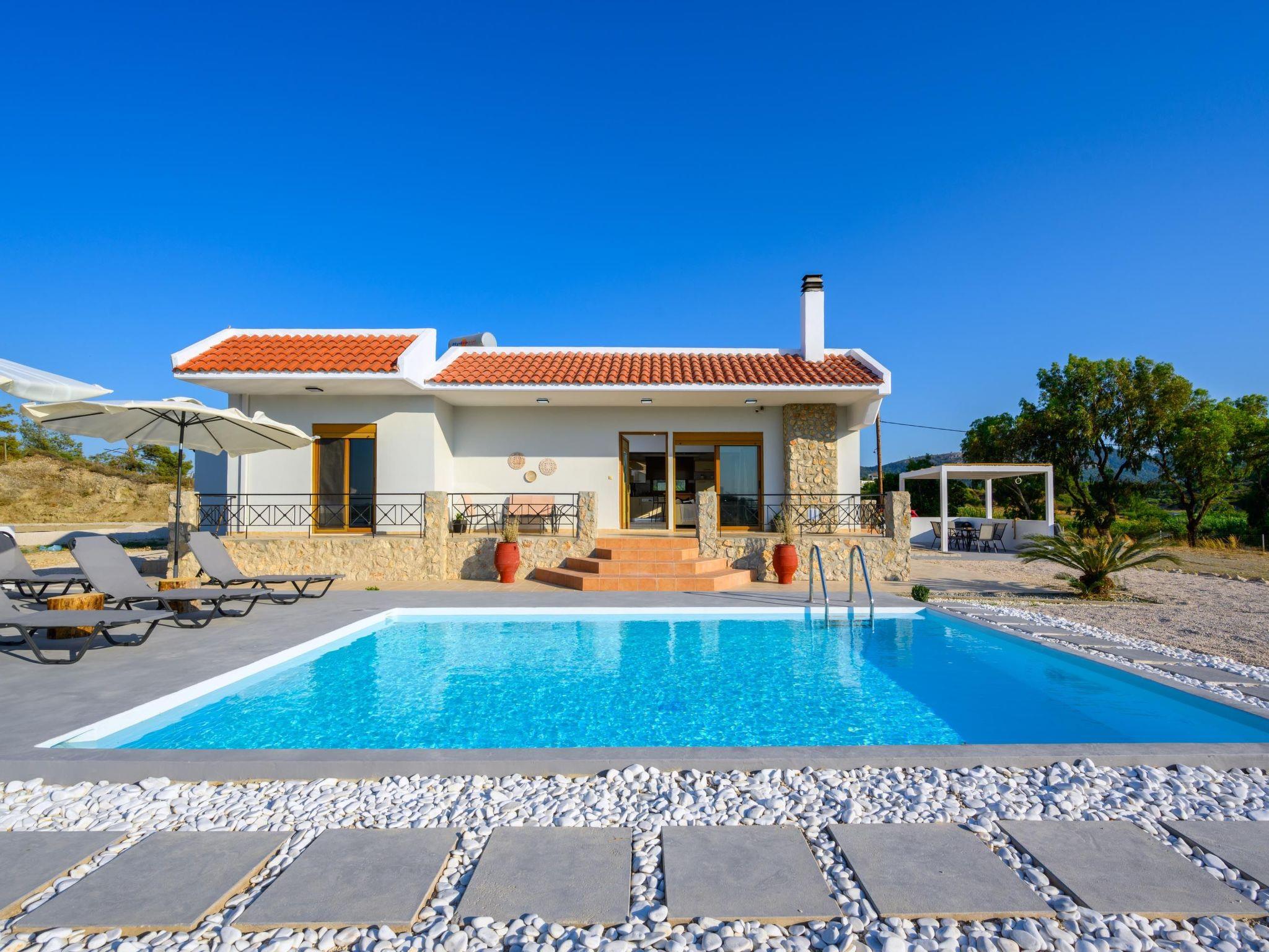This unique villa is set in the calm and serene area of Pastida on a high point surrounded by hills; with views of olive groves, Filerimos, and beyond. Pastida is a village that has to offer you everything you might need during your stay and is located only 5 minutes' drive far from the villa. The coastline is found at a driving distance of only 10 minutes. Also, the airport of Rhodes is found really close to the villa, only 10 minutes. You should not miss visiting the center of Rhodes as well as the Old City of Rhodes. They are found at a driving distance of only 30 minutes. Also, Valley of Butterflies is near the villa, only 20 minutes. There you will have a chance to admire the beauty of Greek nature and see something truly unique! Rhodes has many places that worth visiting, one of them is the Lindos Acropolis, the most incredible archaeological site on the island. It is found at a distance of 50 minutes drive.