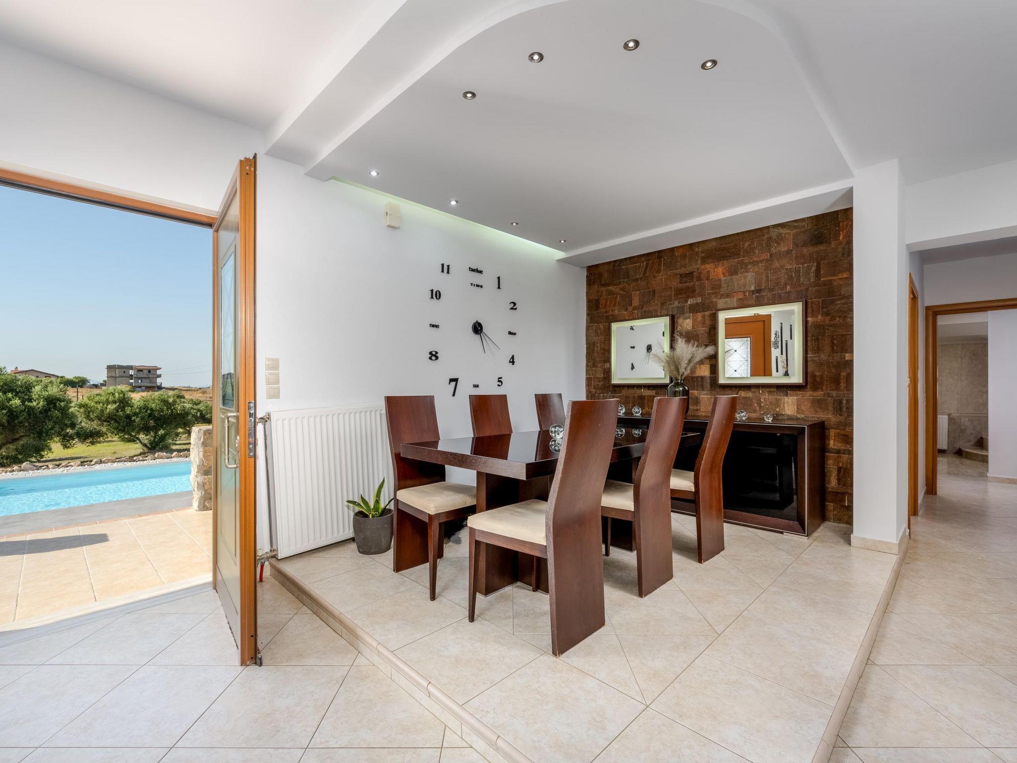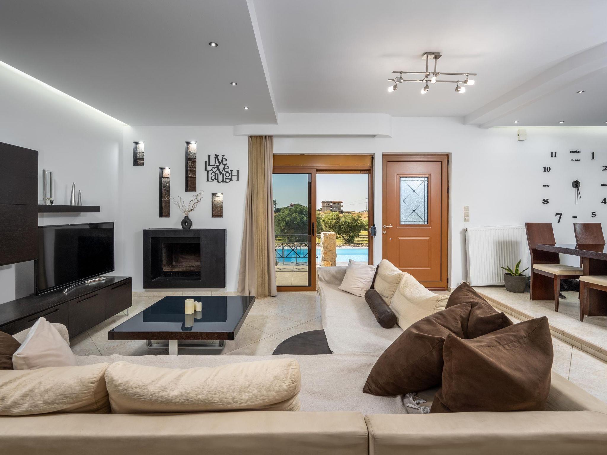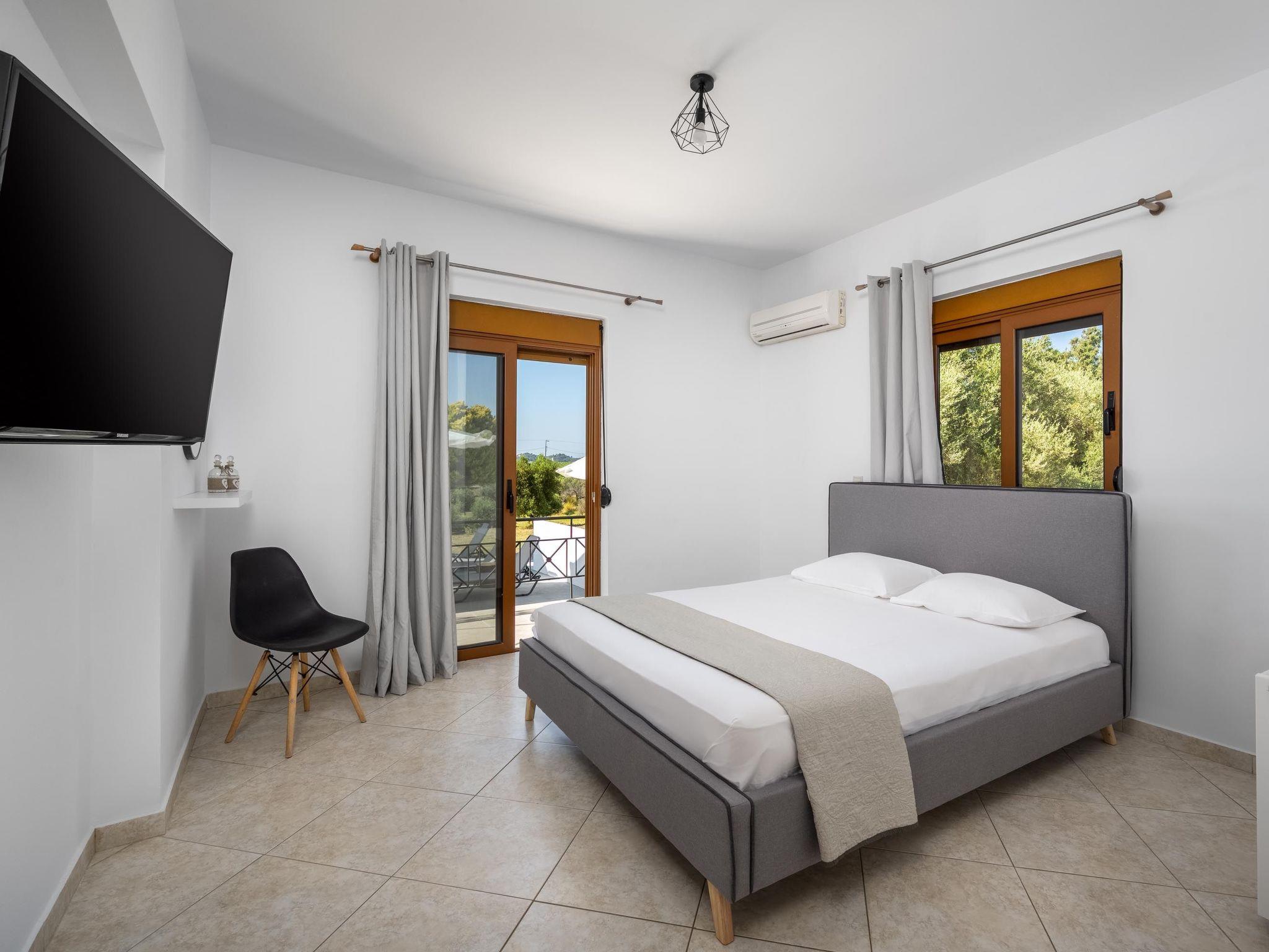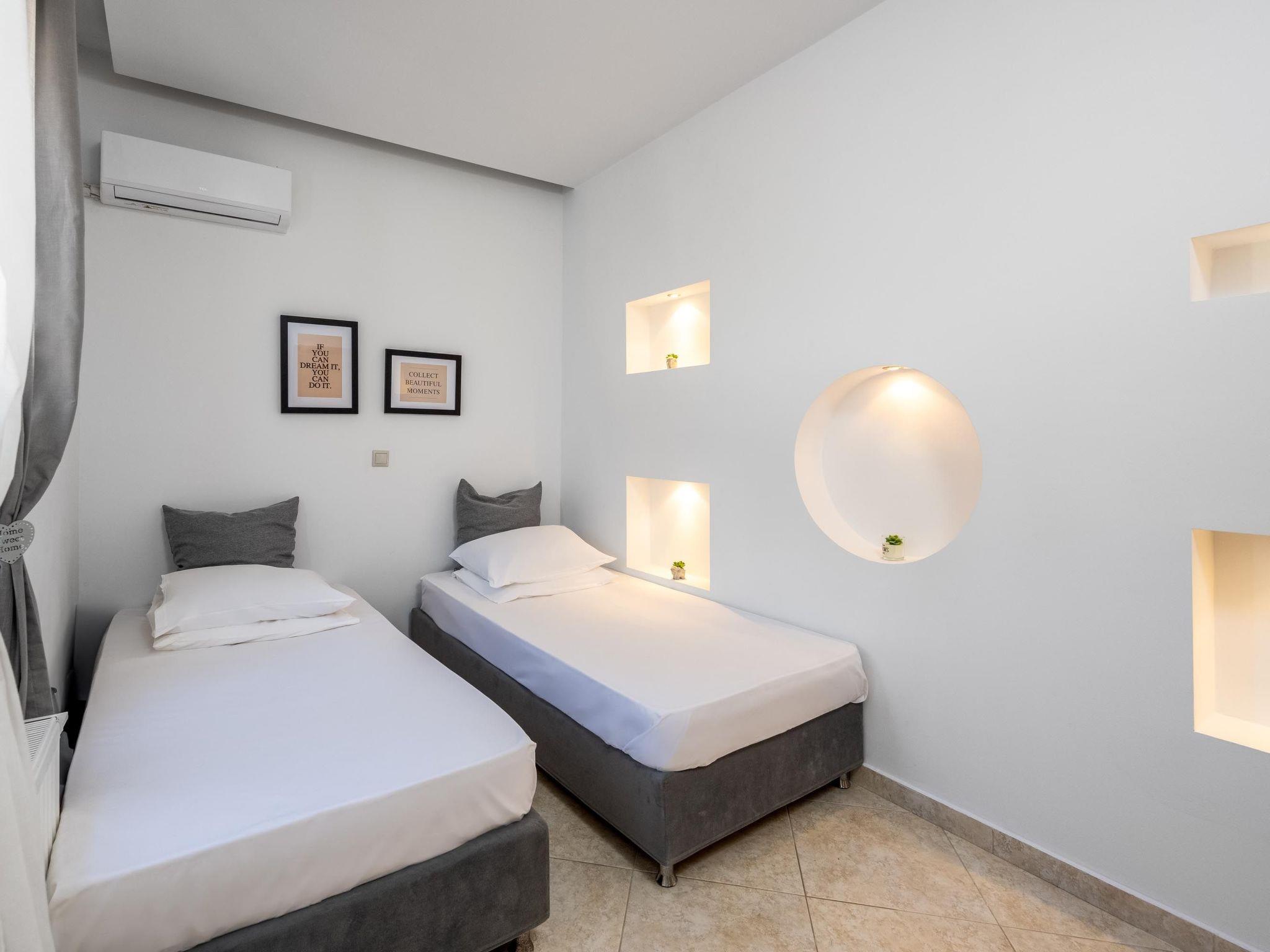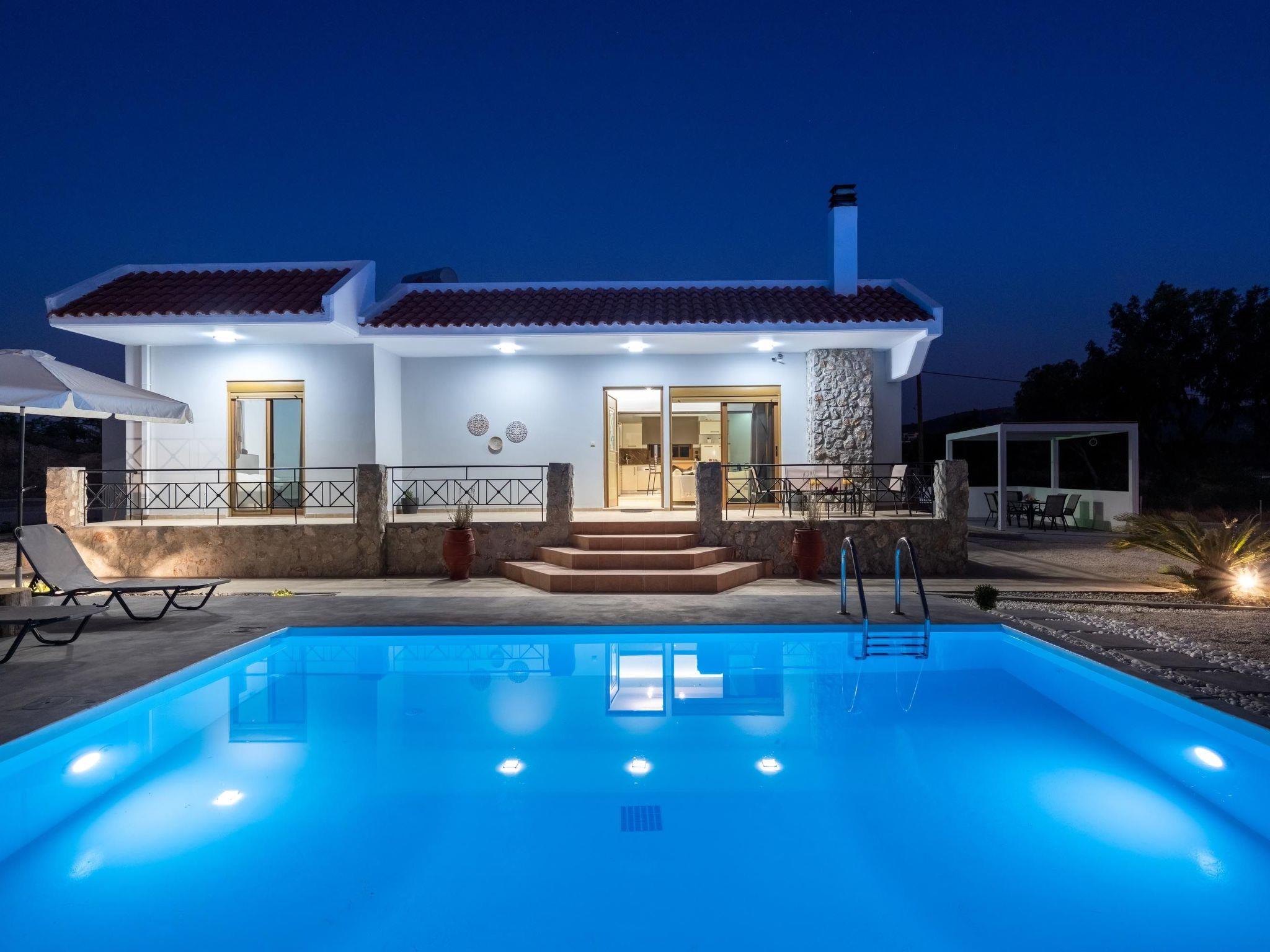 There are 3 air conditioned bedrooms, two with double beds and one with twin beds. The house has a spacious, modernly equipped kitchen and a comfortable dining area. The living room has access to a furnished terrace with panoramic views of the surrounding area and offers a unique setting for relaxation. There’s a screen TV and a free Wi-Fi access throughout the property. Outdoors, you’ll find a private swimming pool with its sunbeds to work on your tan under the rays of the Aegean sun. The surrounding area is quite inviting and welcoming. Also, there’s a BBQ facility as well as a dining area to enjoy a meal and a gathering with your friends or family. Last but not least, for your information we suggest to have a car for your transfer form and to the property.