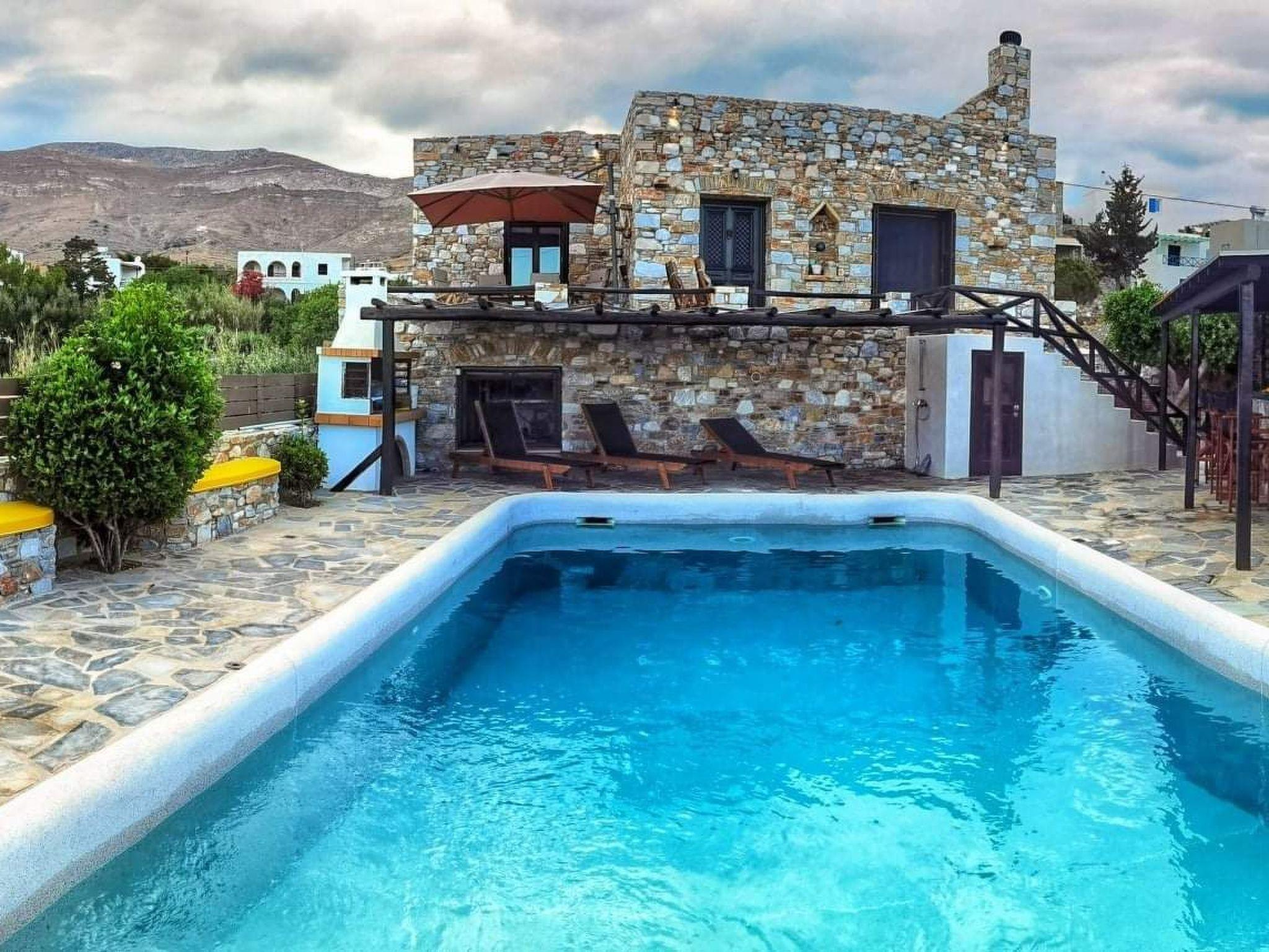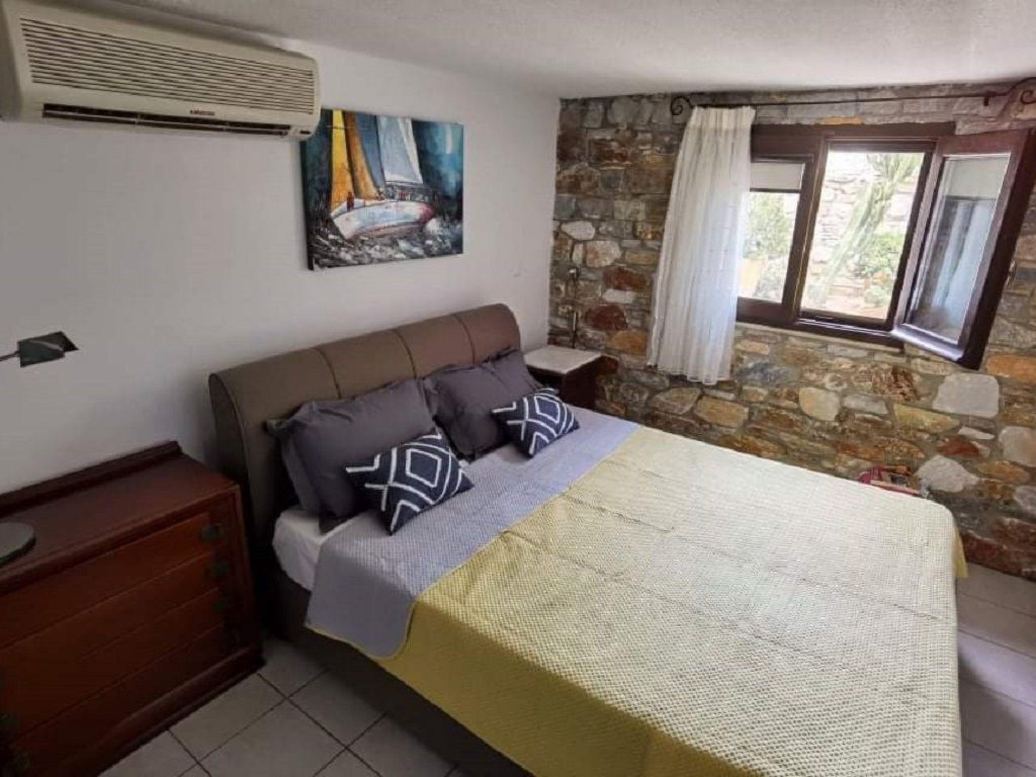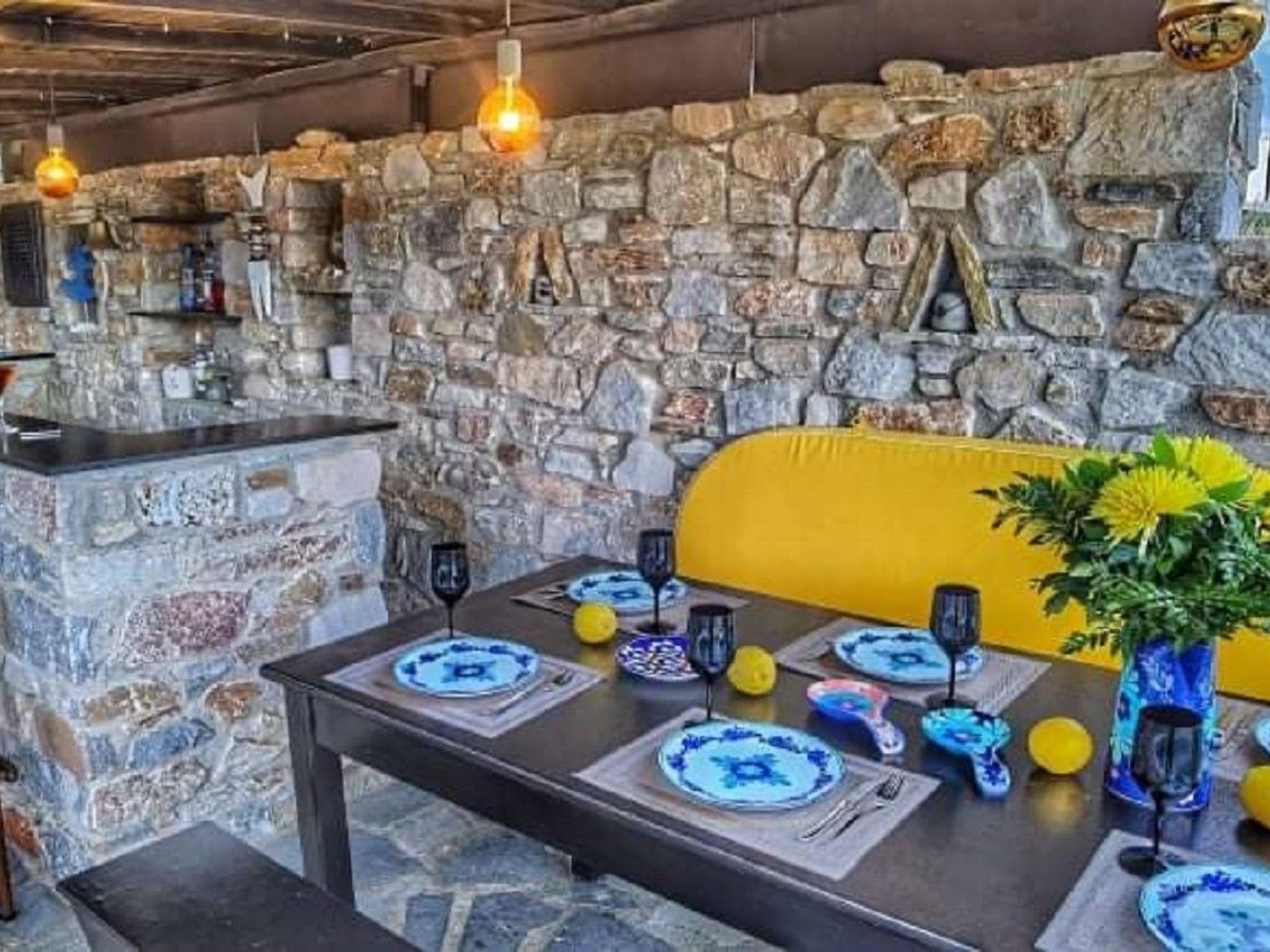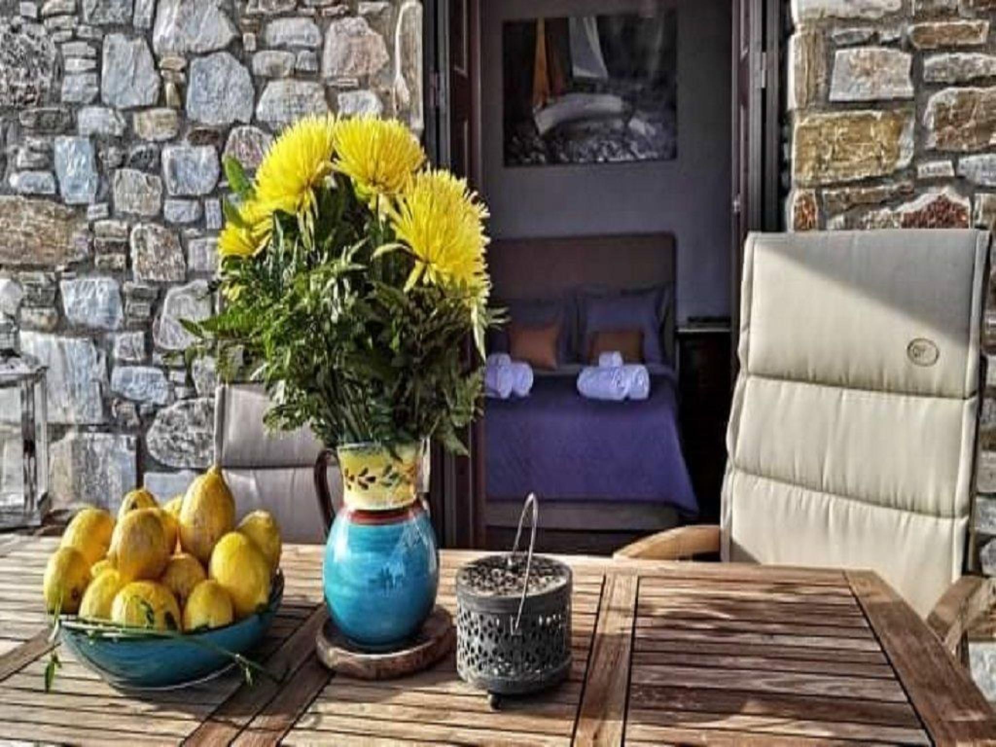 The 265sq.m Villa offers charming design and is entirely crafted from native stone.The property consists of two floors,connected by indoor and outdoor stairs.On the upper floor guests will find a fully equipped,modern ,chef style kitchen with a charming balcony connected to it , a living room with sofa/bed ,TV and stunning sea view and a very comfortable and characteristic dining area. There are two bedrooms on that floor -the Master bedroom,with sea view and en-suite bathroom that even has a jacuzzi in the bathtub ,and a small ,single bedroom with a beautiful window overlooking at the gardens on the back of the house. There is a small WC for guests on that floor. The entire front of the floor is occupied by a big veranda ,offering captivating views of the nature and endless blue of the sea.The ground floor consists of two double bedrooms and one extra double bed that is not in a separate bedroom but it is still in a calm zone and it is a very comfortable place to rest. Many guests prefer to have their young children on that bed. There is also a fully equipped,traditionally decorated kitchen on that floor that features all amenities such as oven,gas stove,coffee maker etc.A cosy living room with two coaches where guests can take a break from the hot summer days and A spacious and comfortable bathroom with WC ,a laundry and drying machine are making this floor a completely independent setting form the upper one. The entire home is air conditioned.