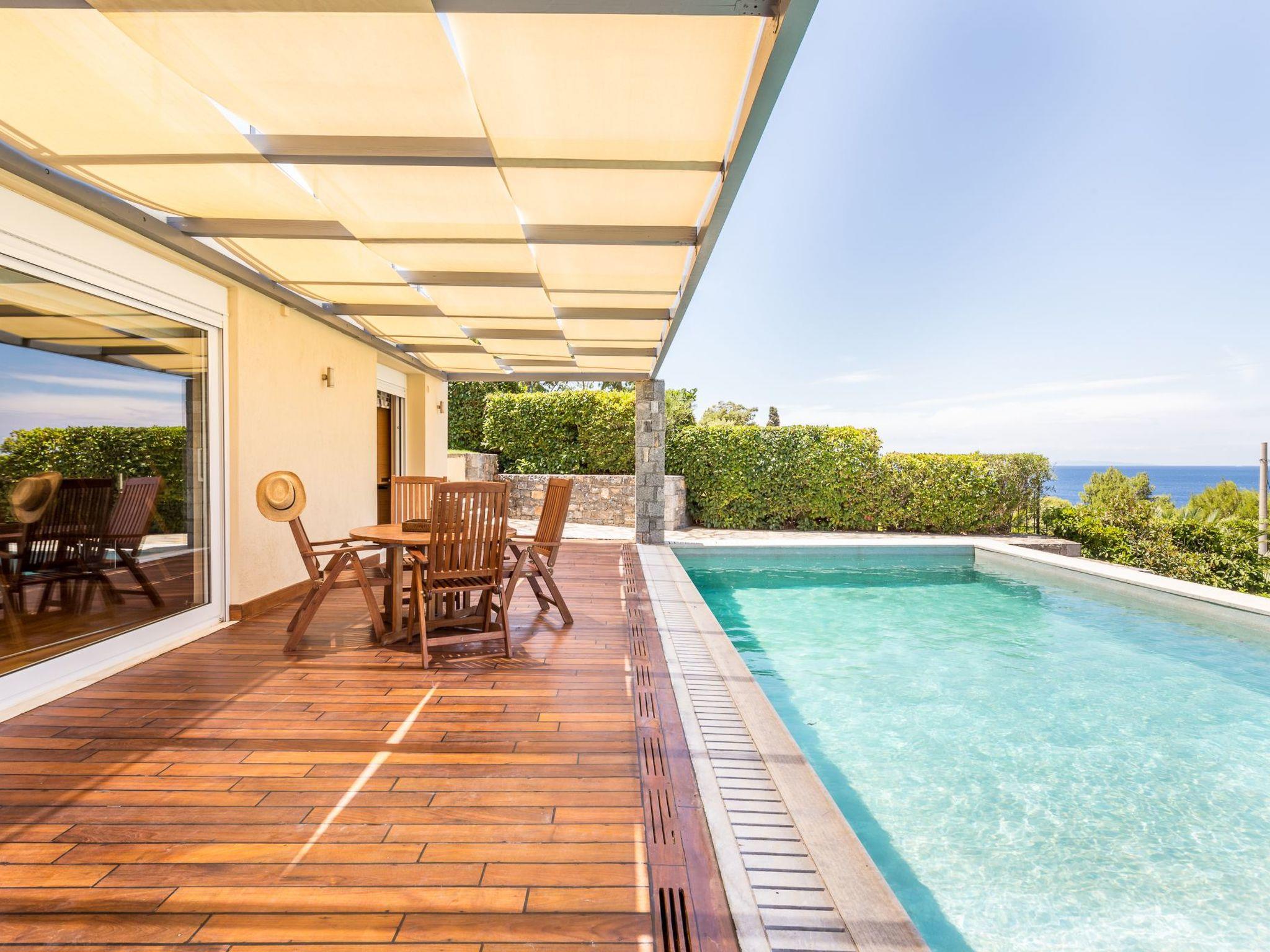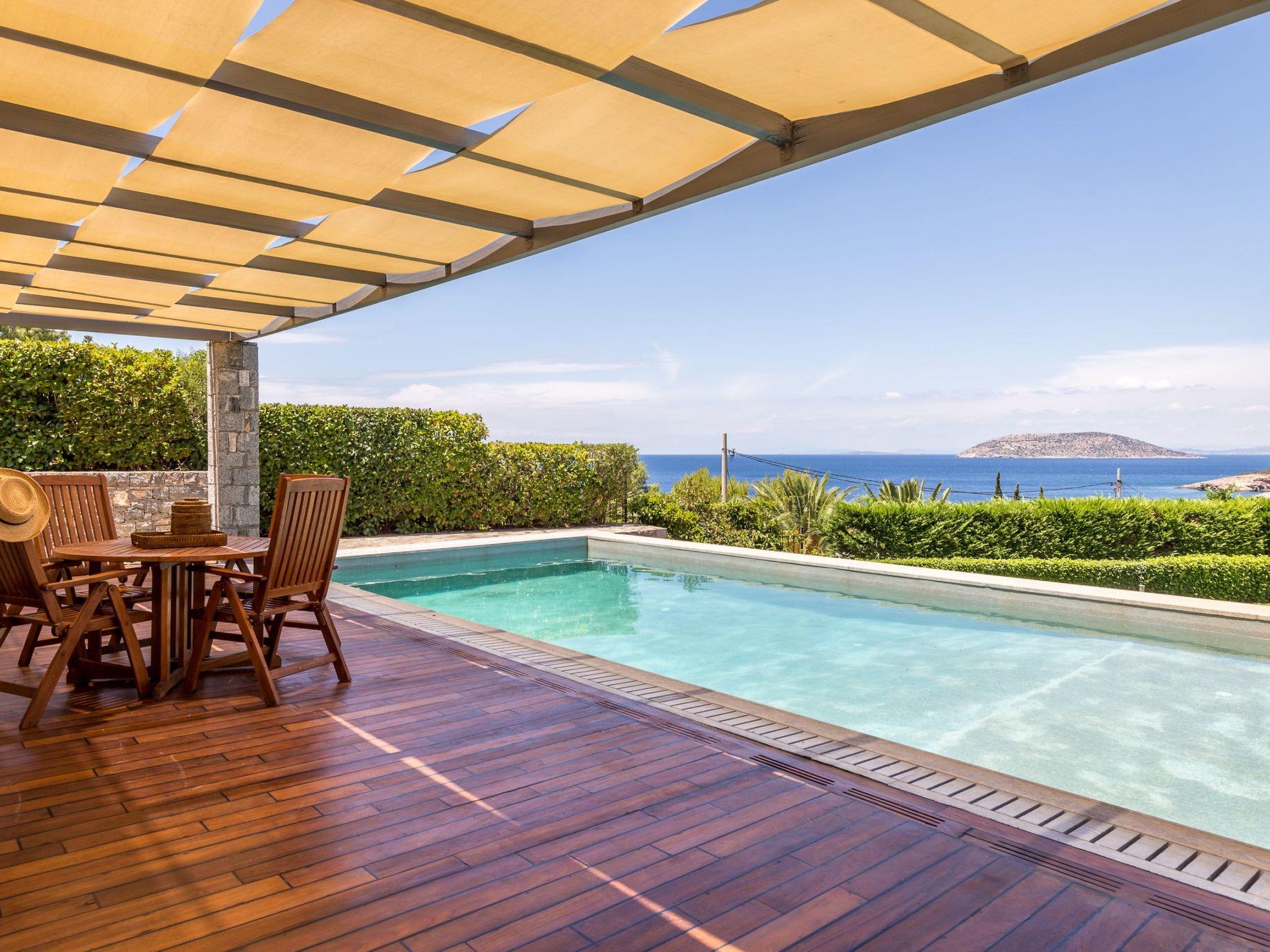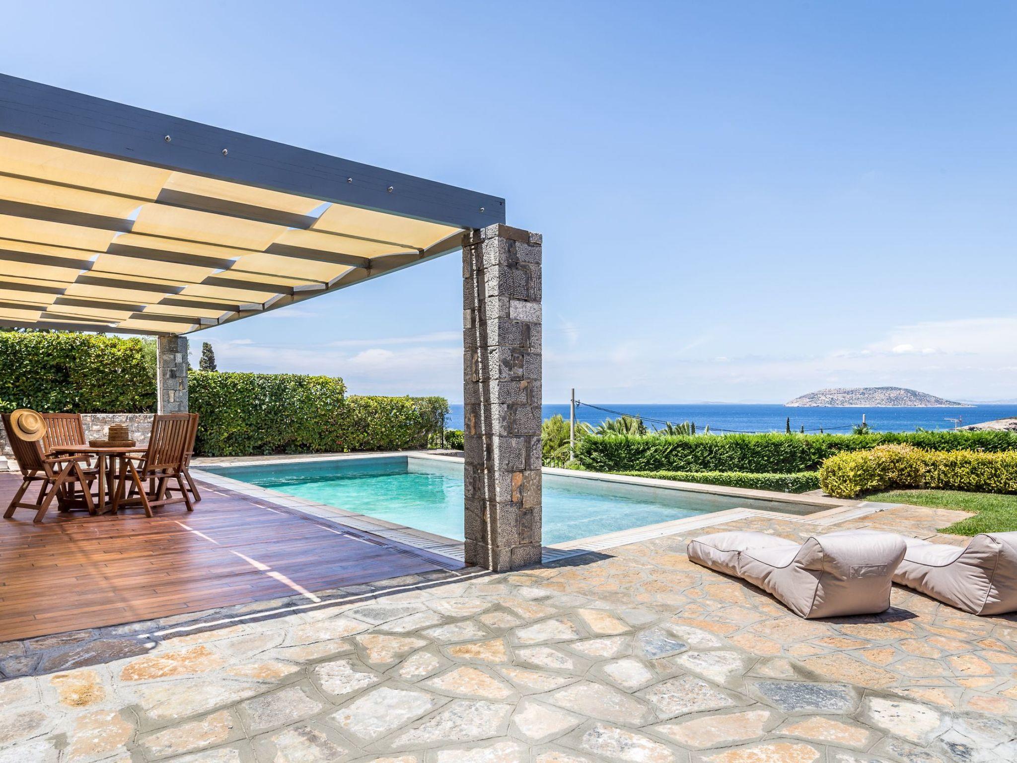 A large garden with swimming pool. Sitting and dining area. Big balconies with fantastic views of Saronicos Bay and its famous sunset.