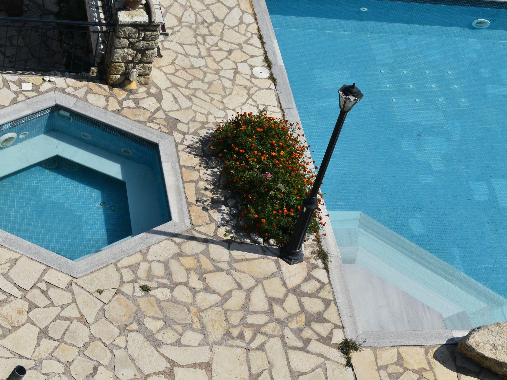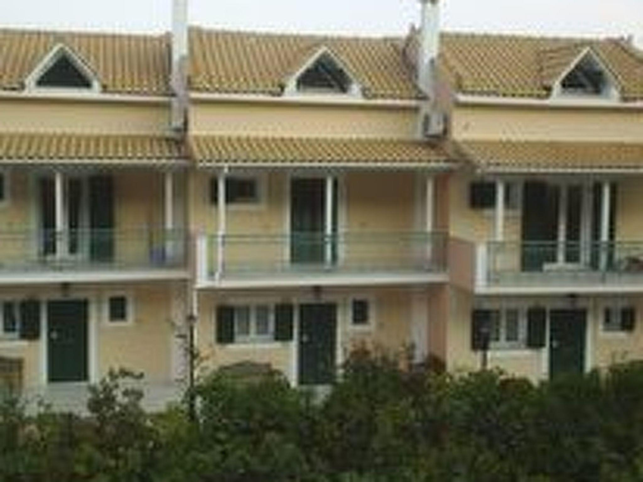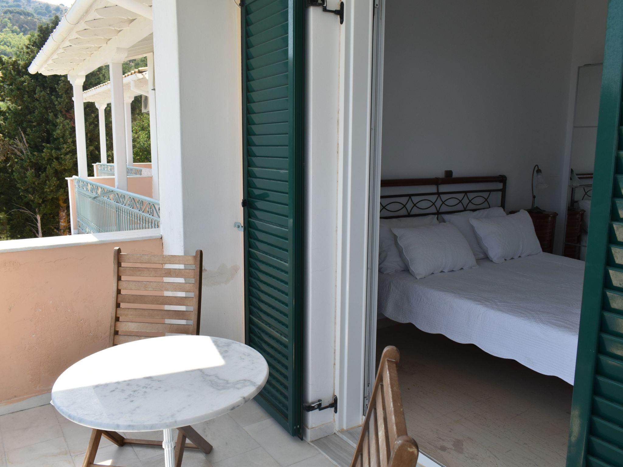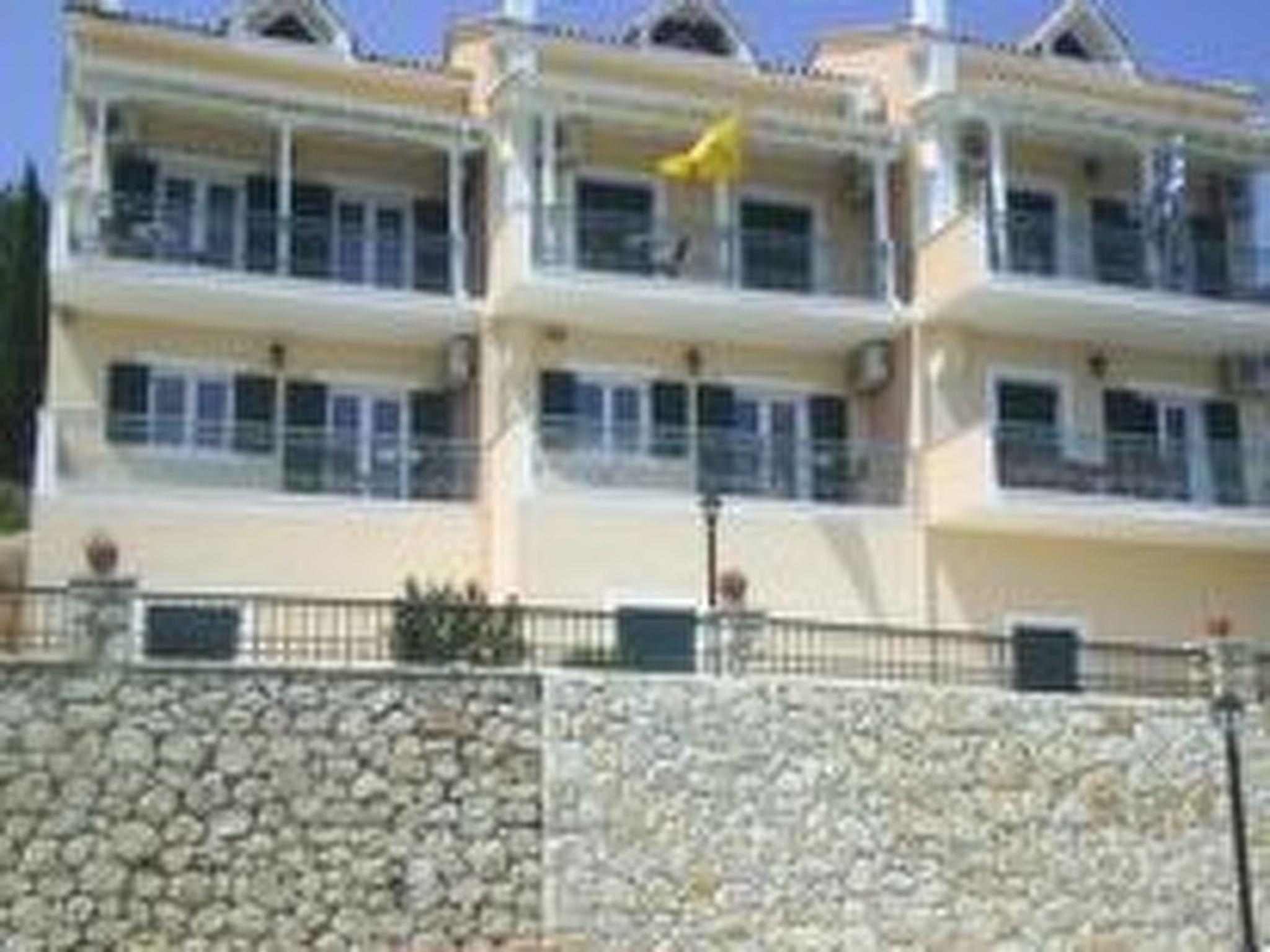 Step outside to discover a shared outdoor oasis, promising relaxation and leisure in equal measure. Dip into the communal pool for a refreshing swim, or bask in the lush surroundings of the communal garden, the perfect backdrop for afternoon lounging. The presence of a balcony invites you to unwind with a book or simply soak up the breathtaking views that envelop the estate, offering glimpses of the Ionian Islands Scorpios and Meganisy.